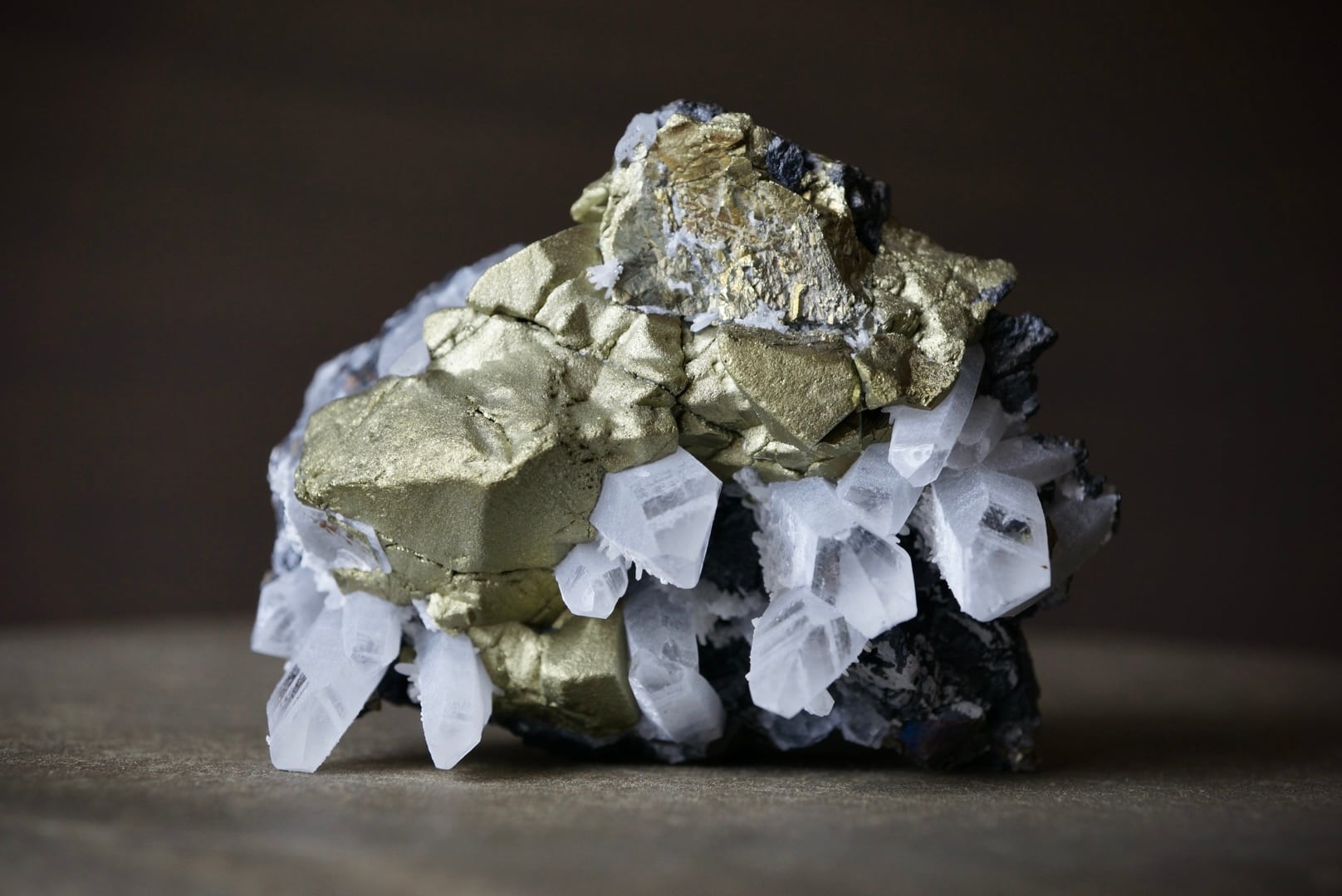 滑らかでマットな質感のチャルコパイライトは上品な金色の光沢を示し、ガレナの鉛灰色と相まり、美しいコントラストを見せています。