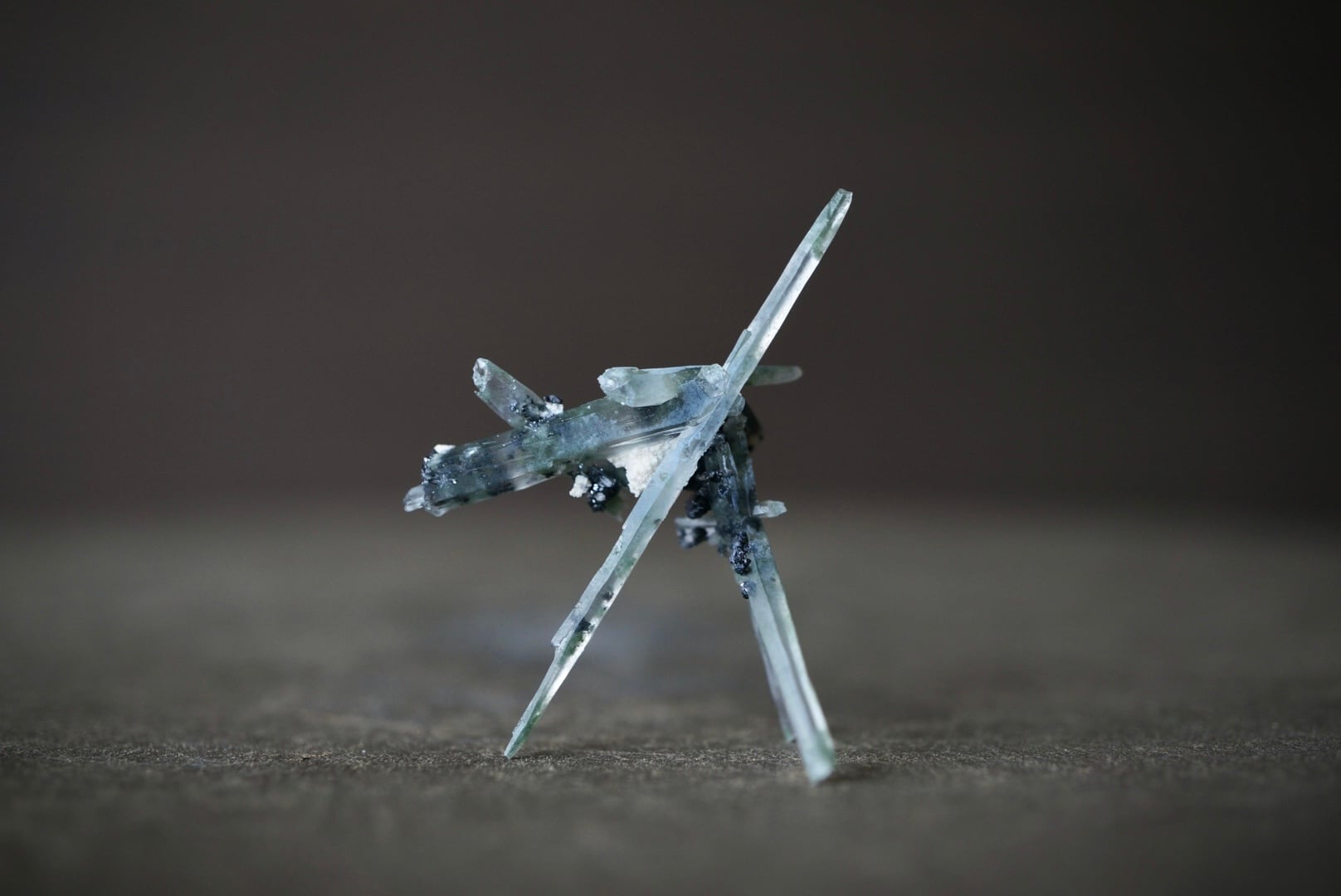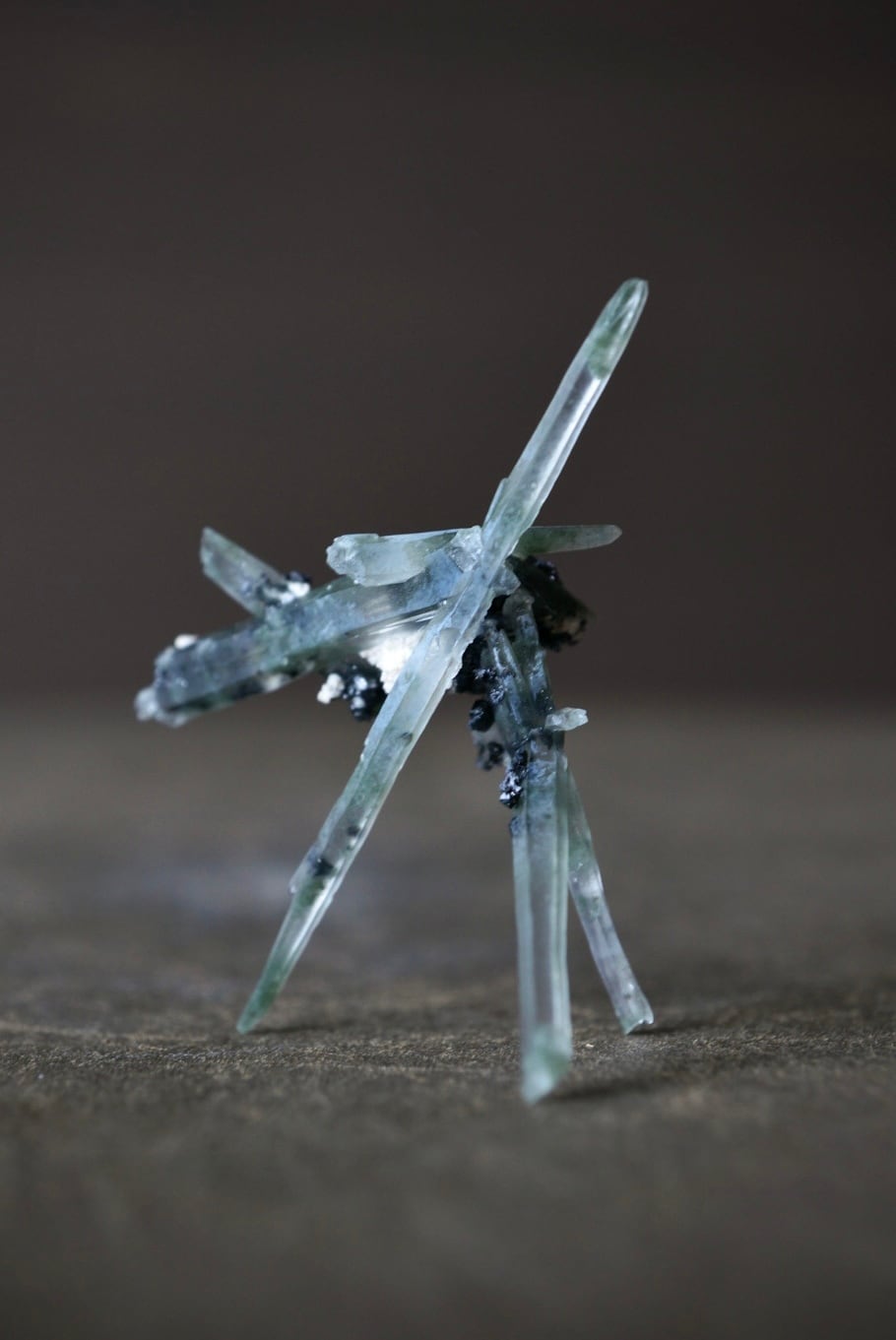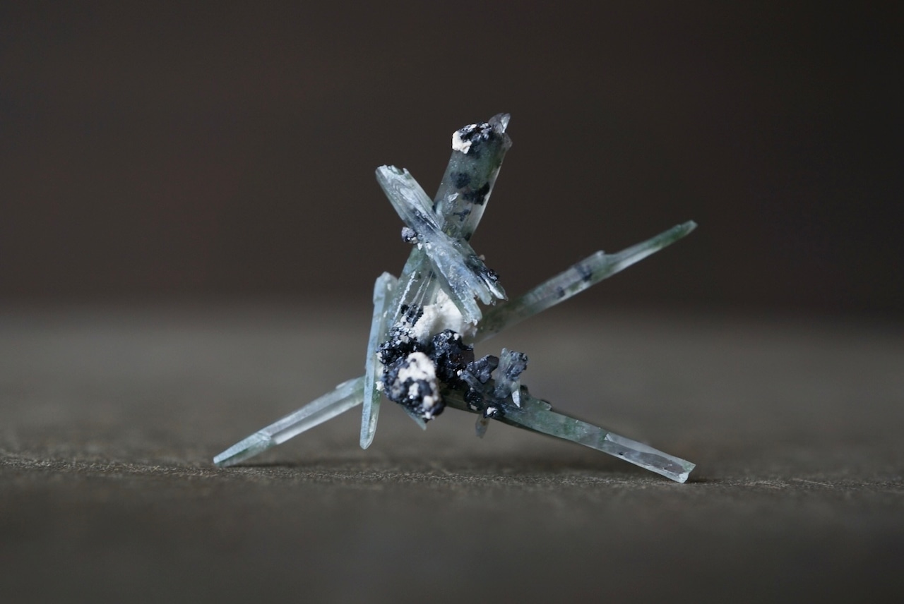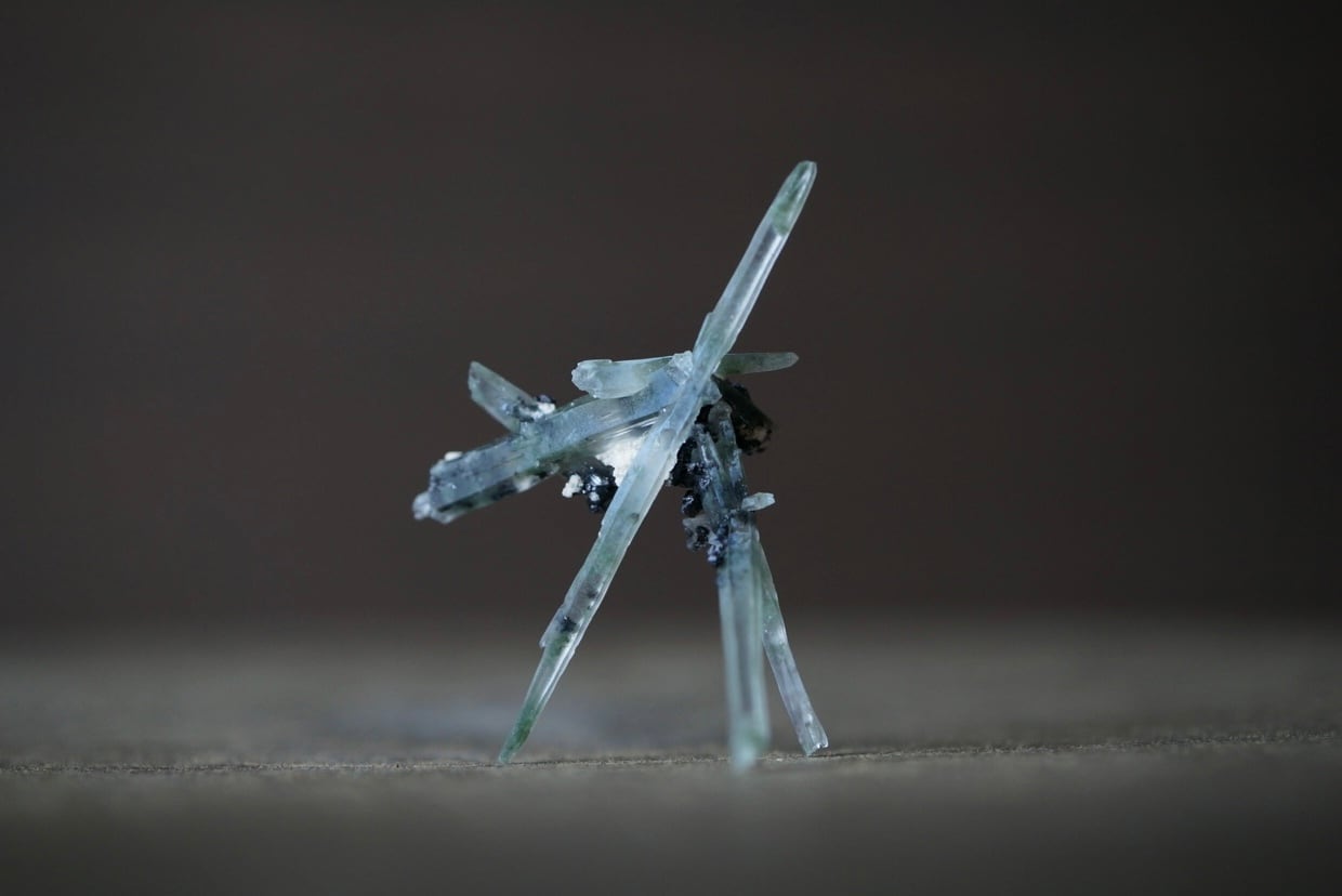 針のように繊細なクォーツが互いに交差しながら、絶妙なバランスで自立しています。
