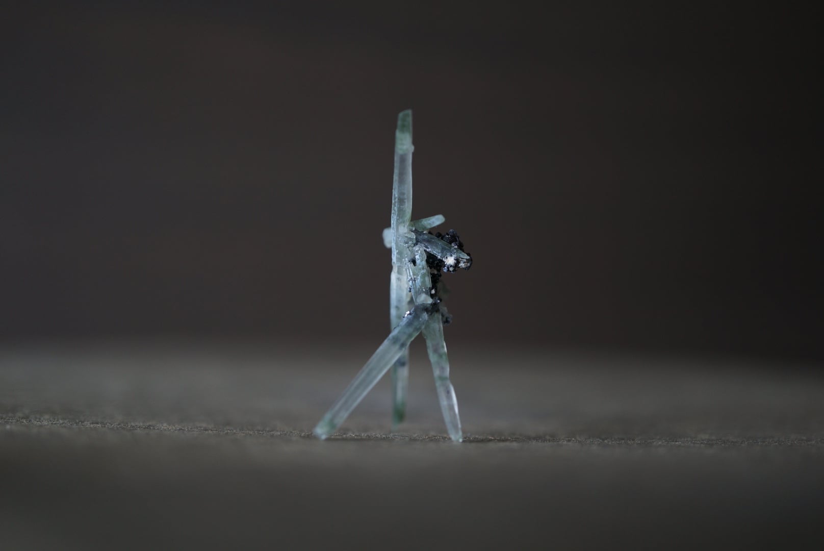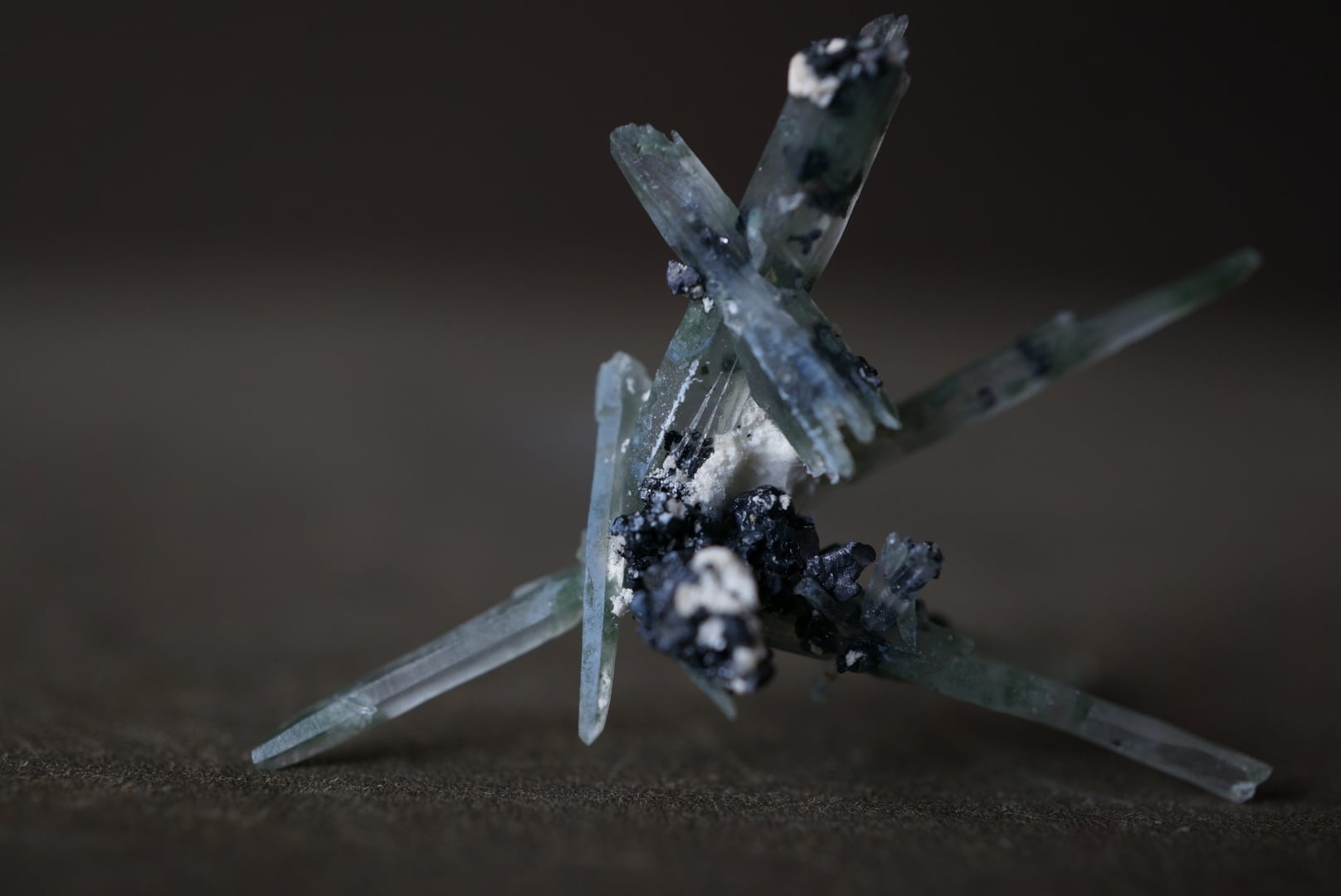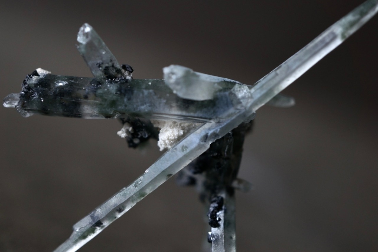 針のように繊細なクォーツが互いに交差しながら、絶妙なバランスで自立しています。