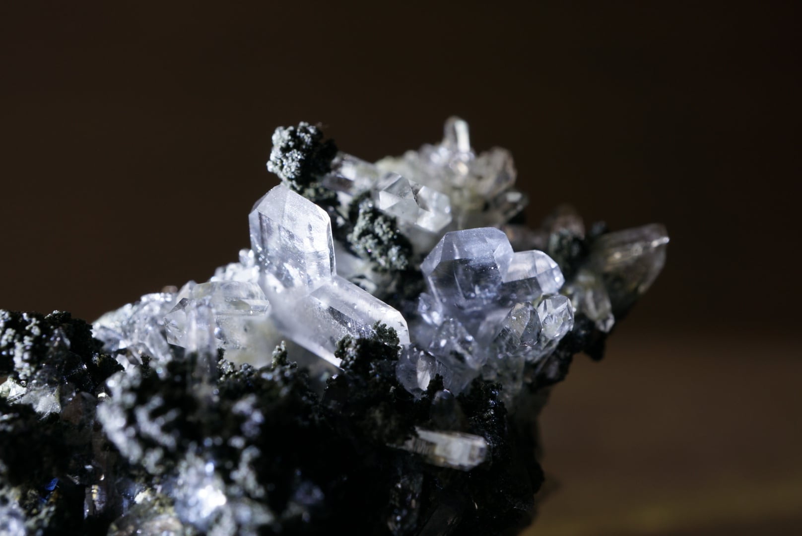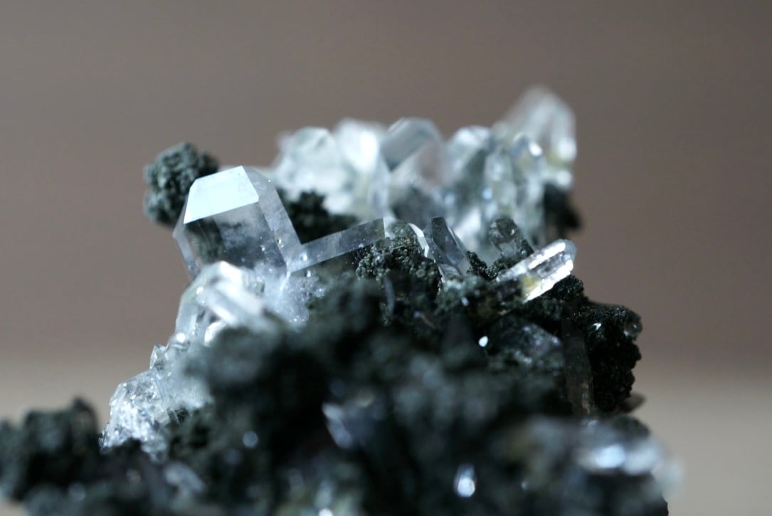 この濃密な緑の地形の上に、氷片のような高透明度の石英が立ち上がっており、暗い地表から冷たい光がせり上がってくるようなコントラストが際立ちます。