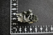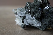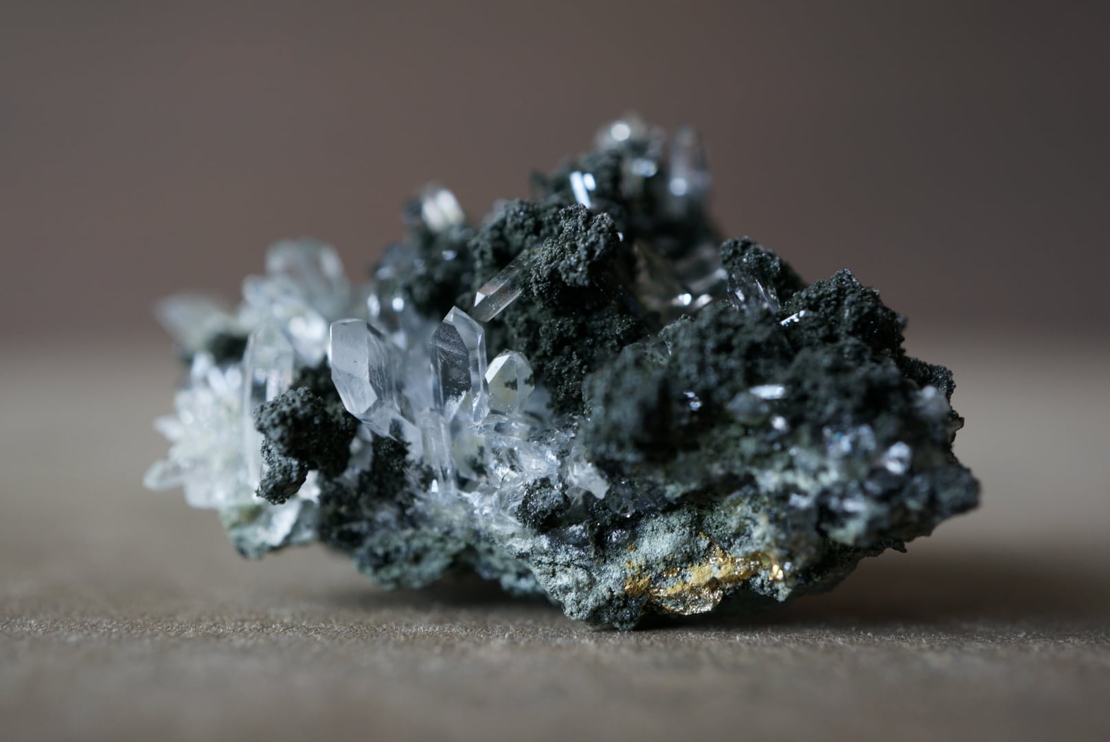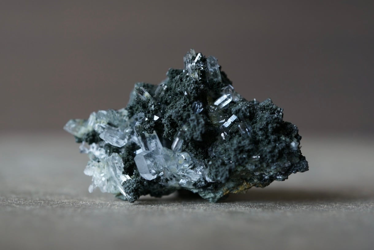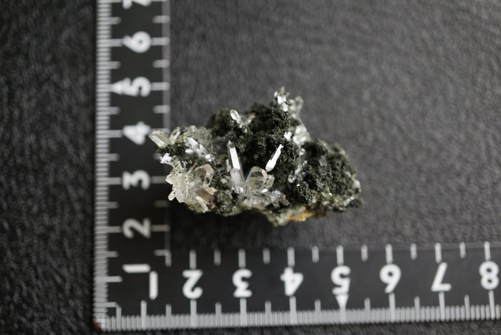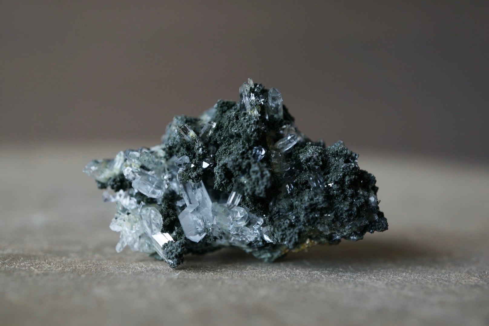 クローライト(緑泥石)は、深い緑色の細かな集合体として母岩を覆い、まるで苔の山がいくつも立ち上がっているような質感をつくりだしています。