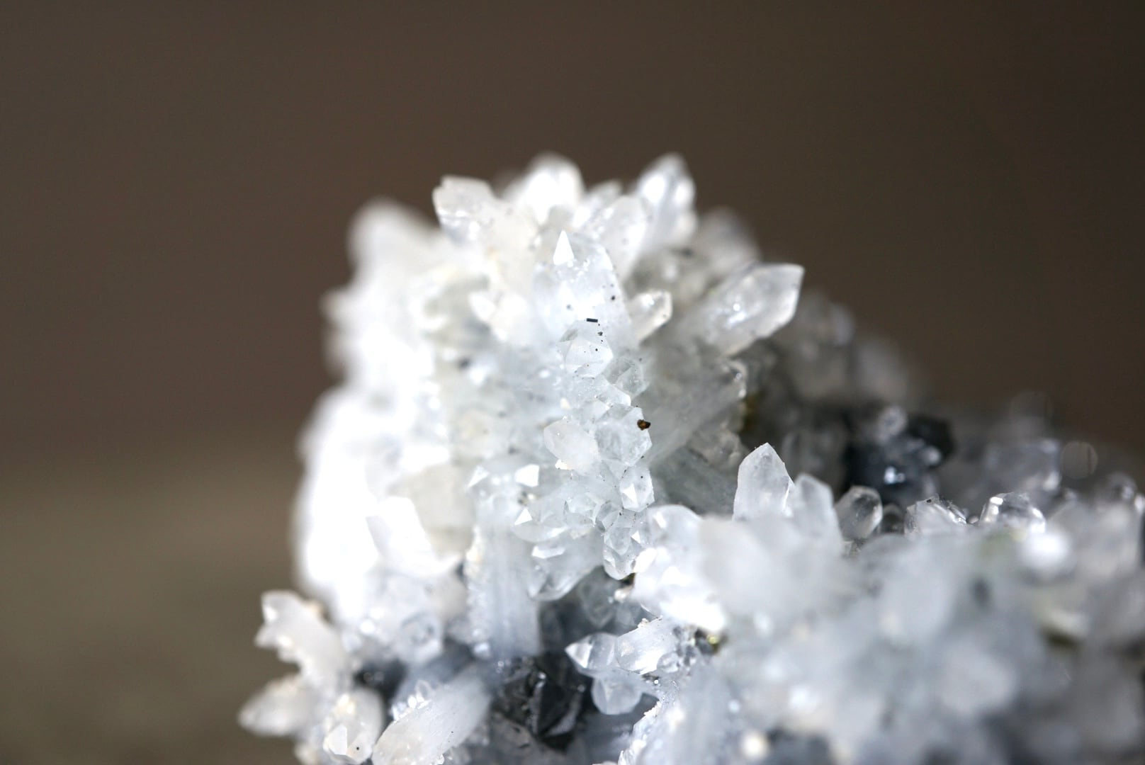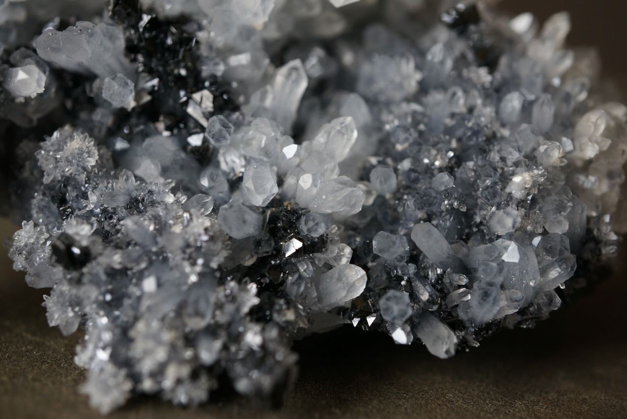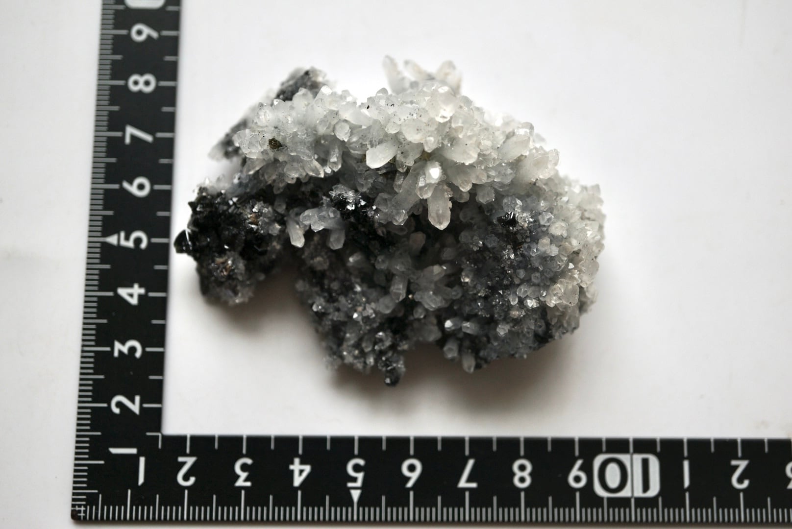 マダン地区らしい金属鉱物の密集帯の上に、細やかなクォーツが群生しています。