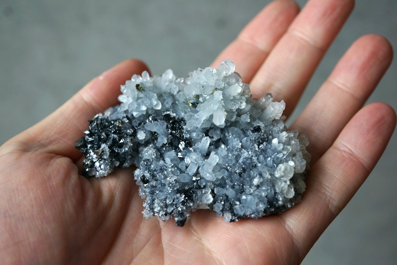 手に乗せると一塊としての重さがあり、結晶のきらめきと金属の反射が錯綜しながら、黒・銀・金の階調を生み出しています。