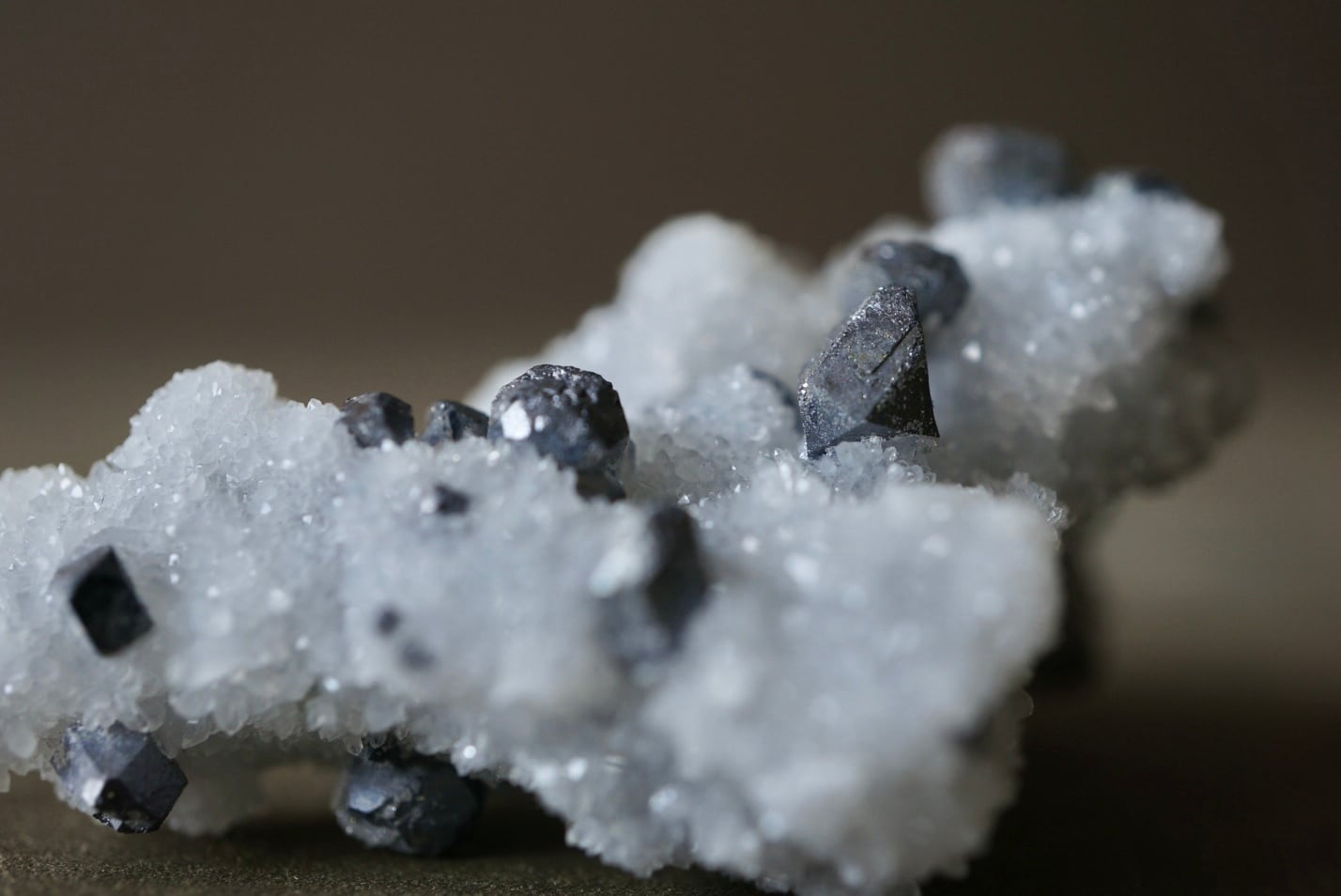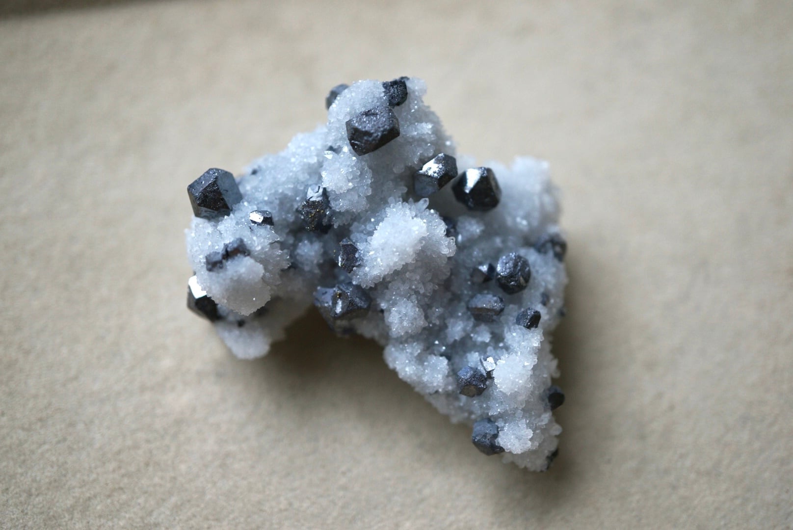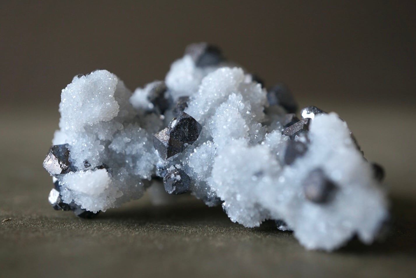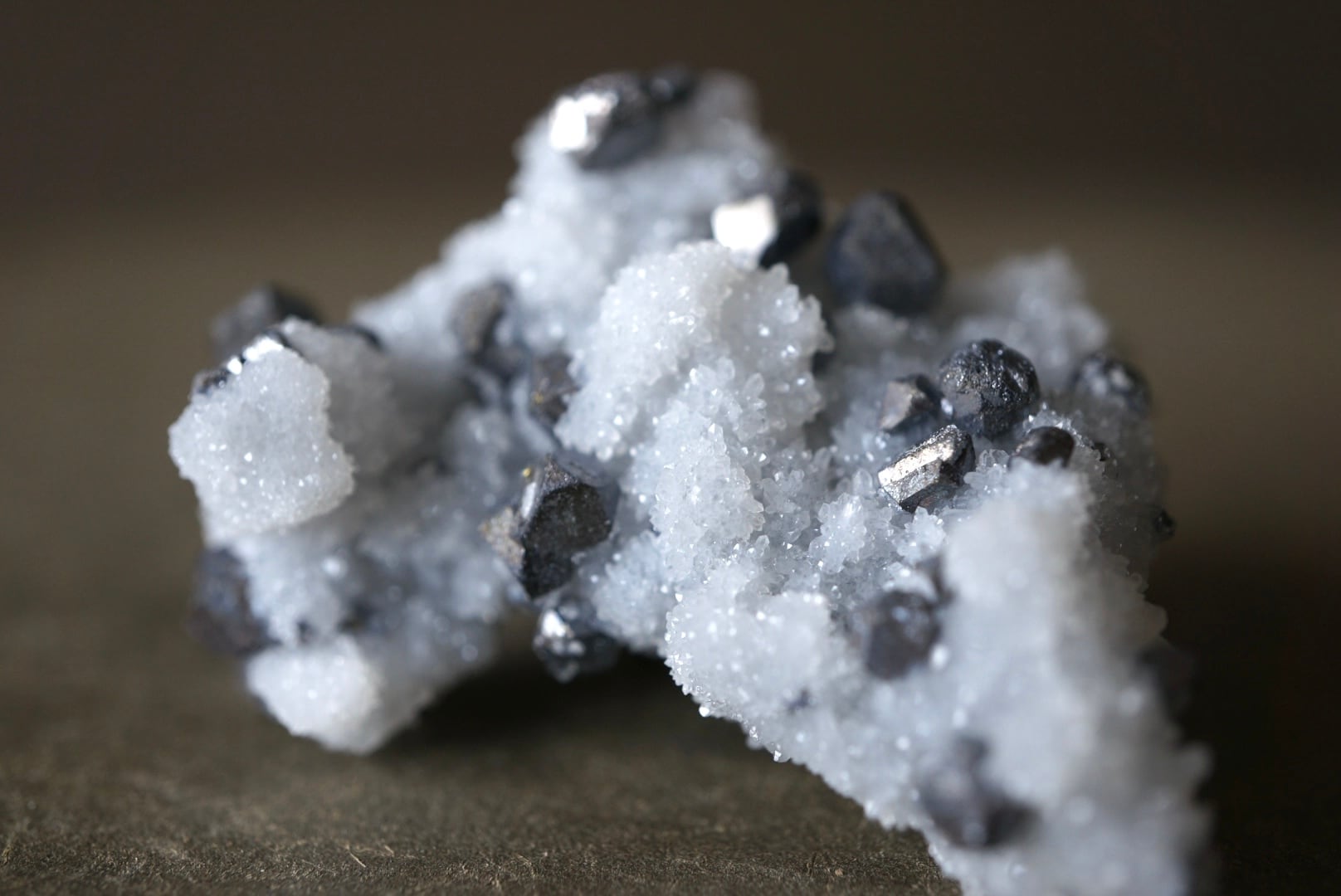 細やかなきらめきを見せる青白いドゥルージー状クォーツの表面に、銀灰色のガレナがバランスよく点在しています。