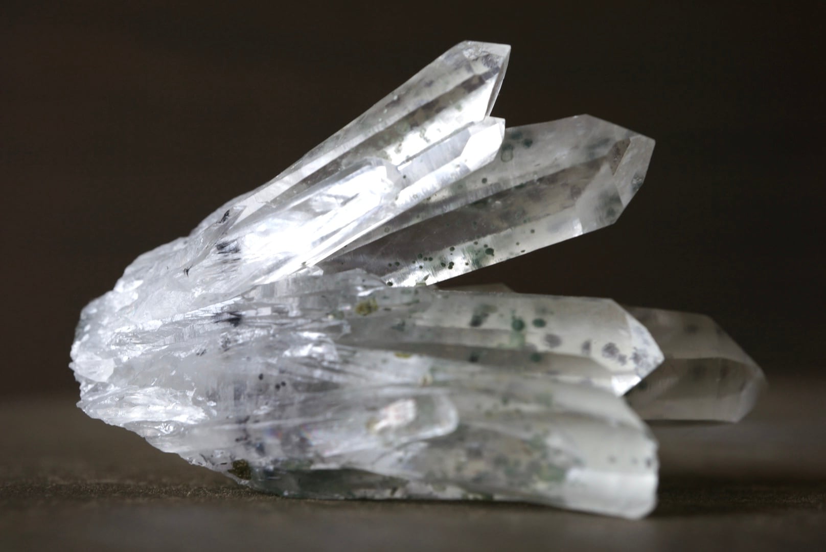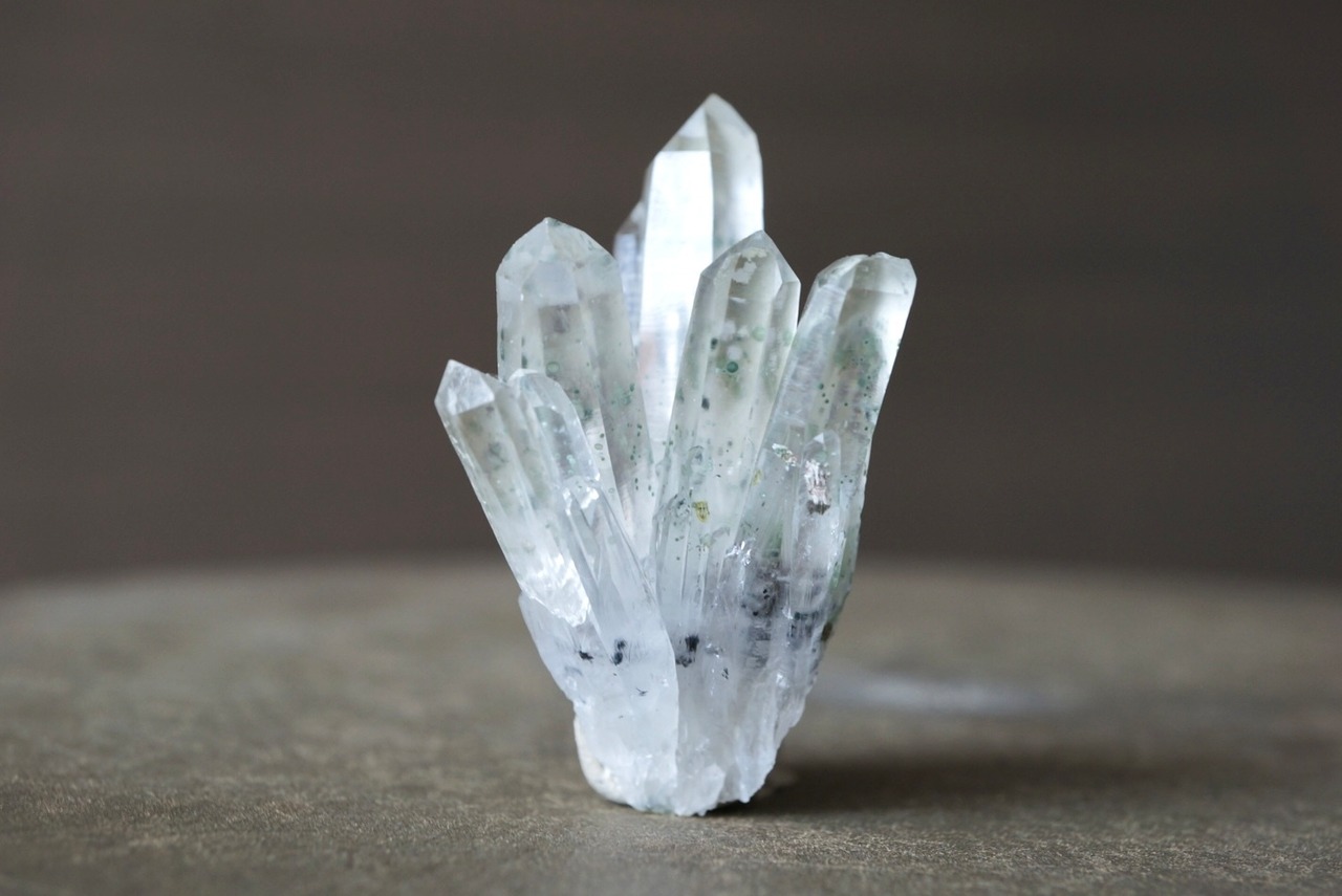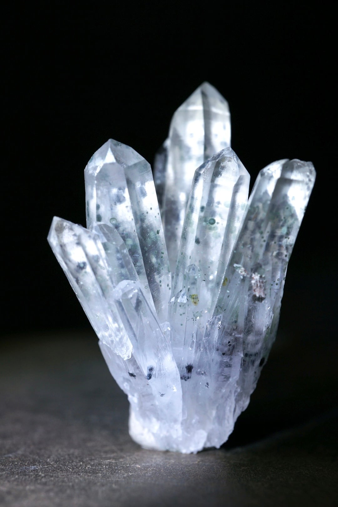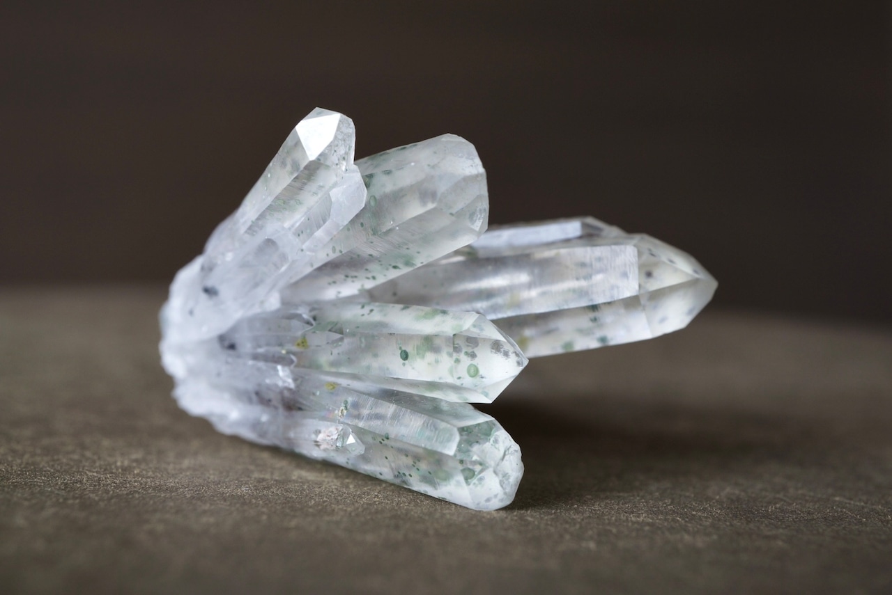放射状に伸び上がる透明度の高い結晶の内部に、淡い緑色のクローライトが点在し、球状・斑点状に散らばる独特の表情をつくっています。