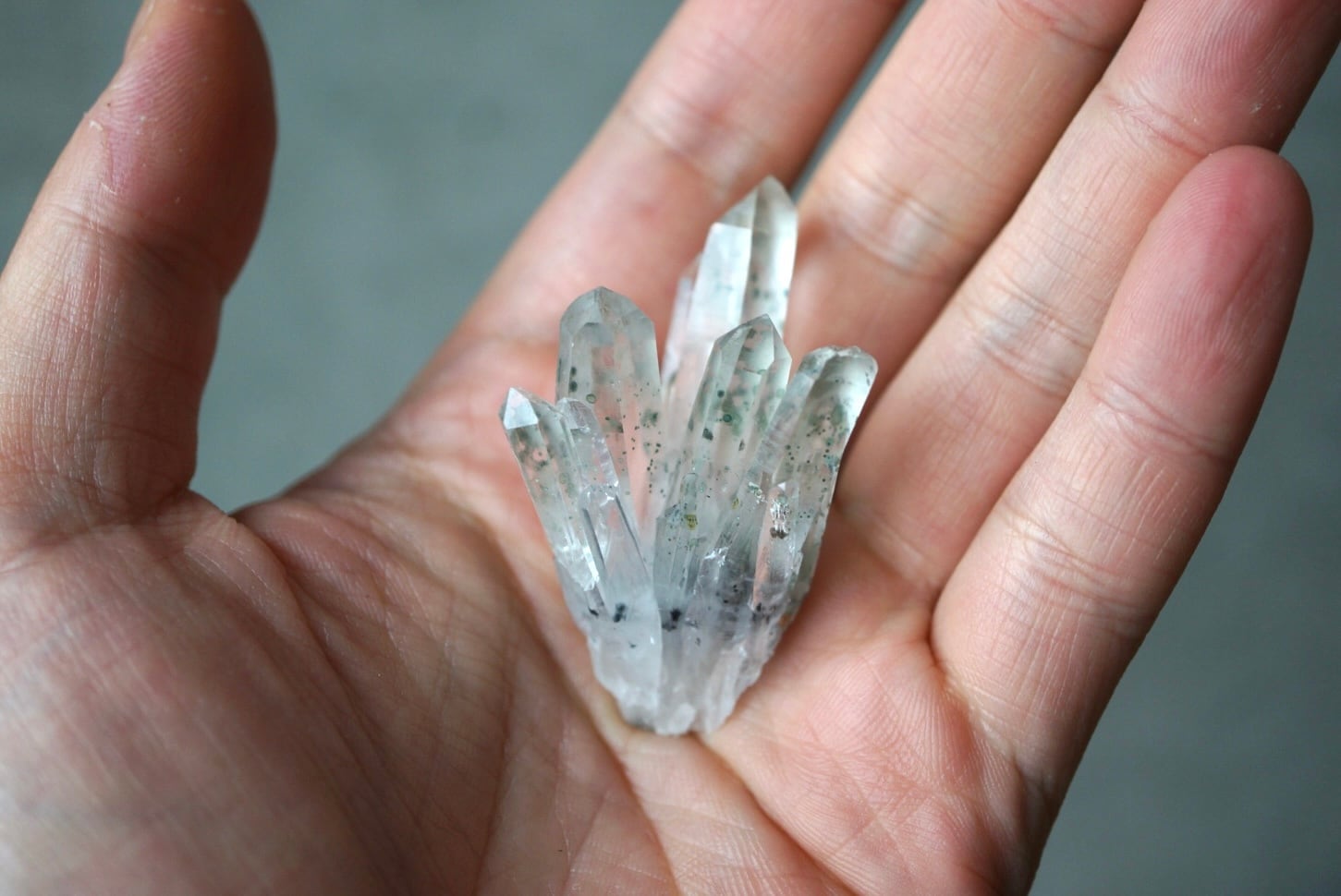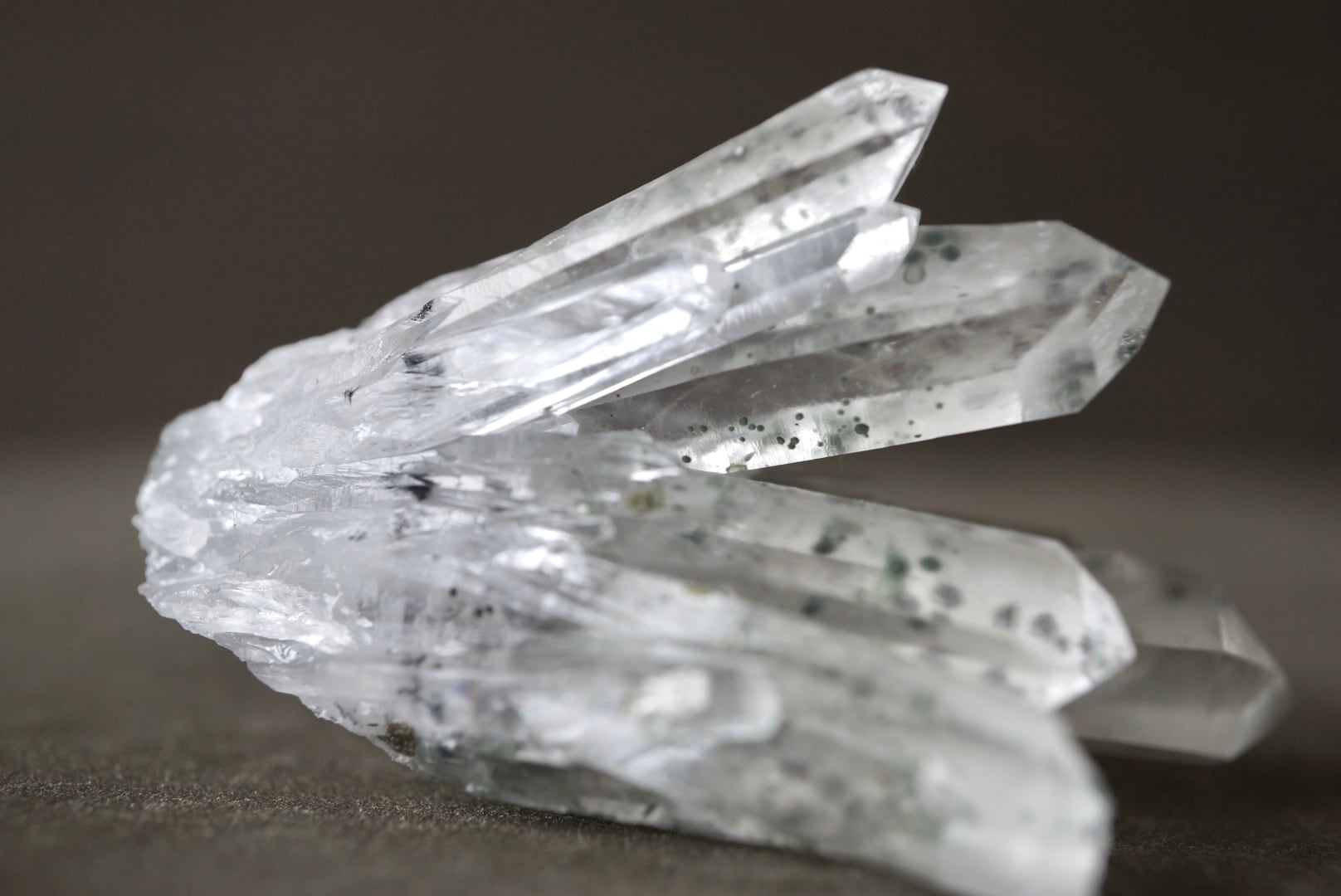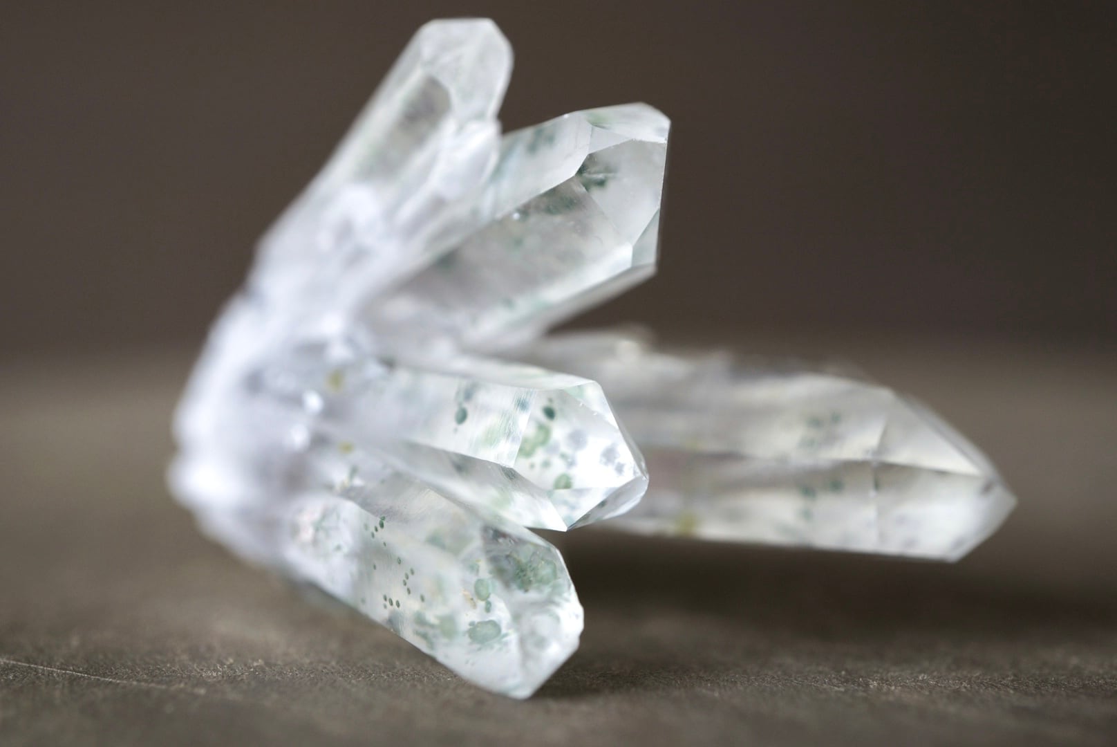 放射状に伸び上がる透明度の高い結晶の内部に、淡い緑色のクローライトが点在し、球状・斑点状に散らばる独特の表情をつくっています。