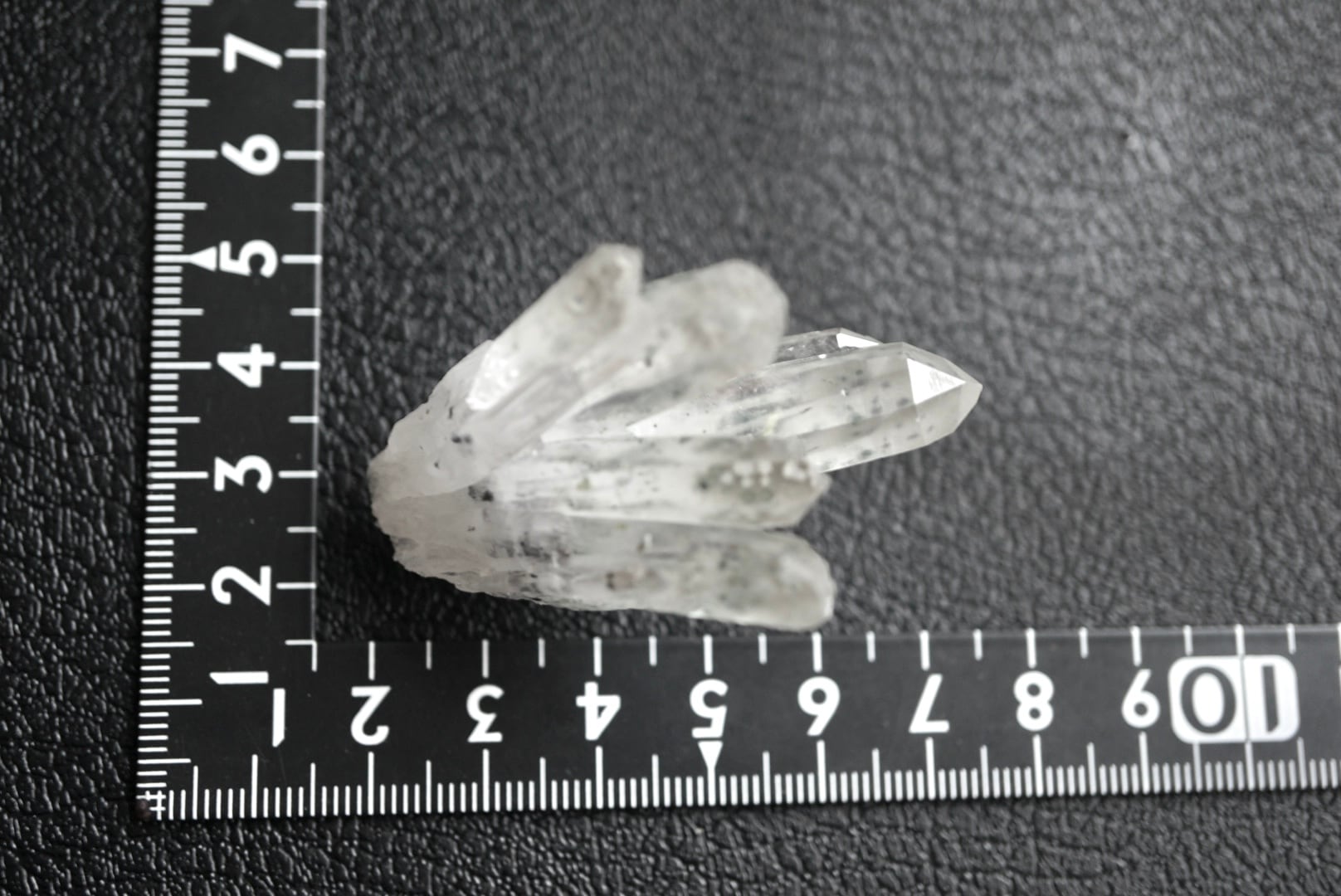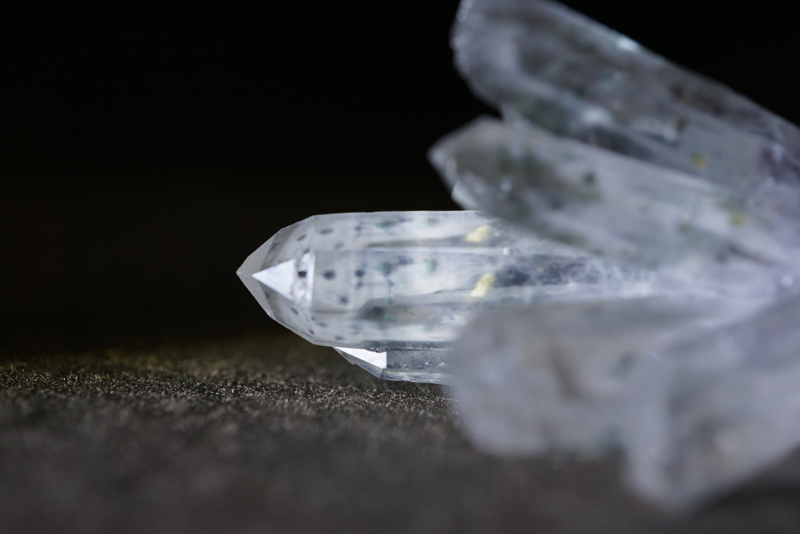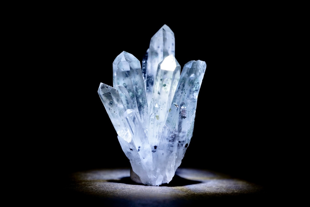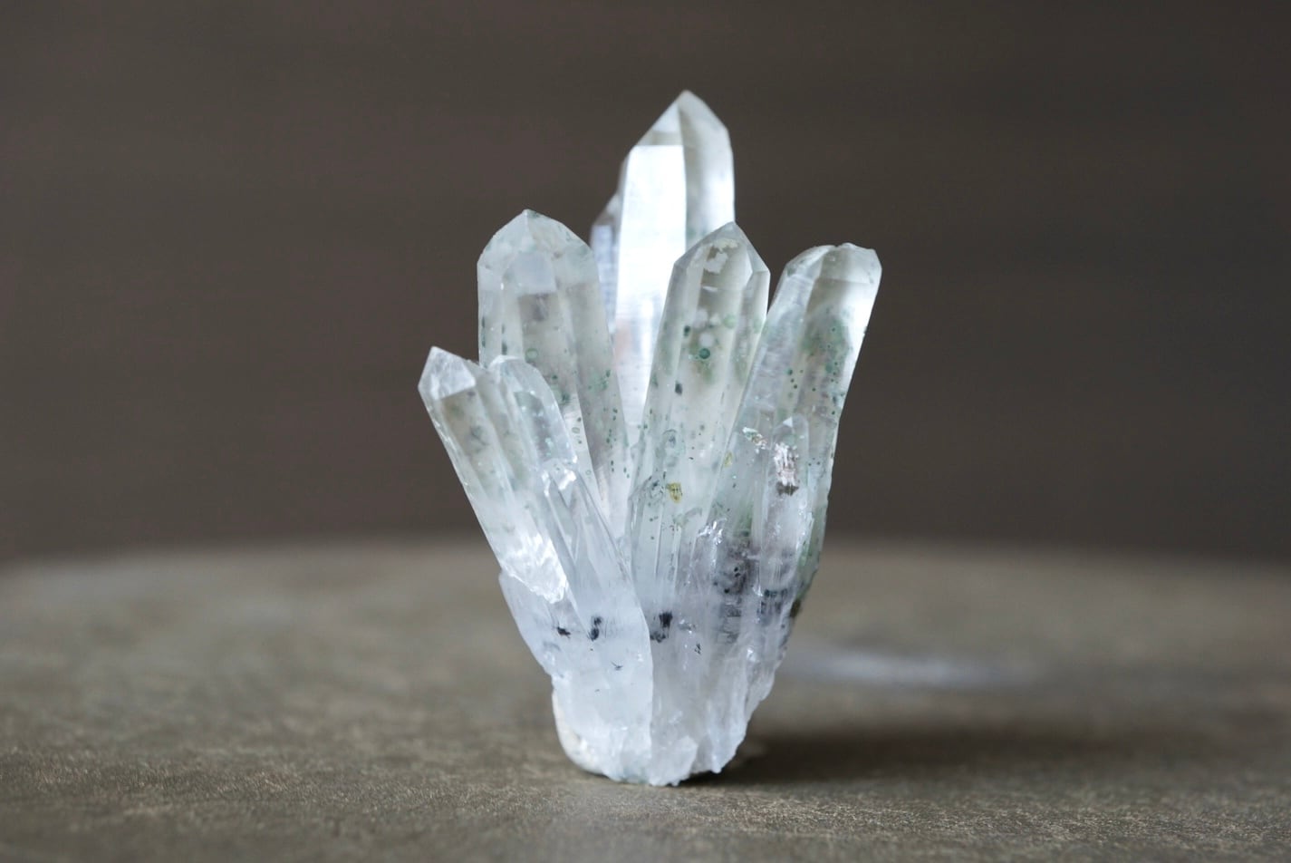 放射状に伸び上がる透明度の高い結晶の内部に、淡い緑色のクローライトが点在し、球状・斑点状に散らばる独特の表情をつくっています。