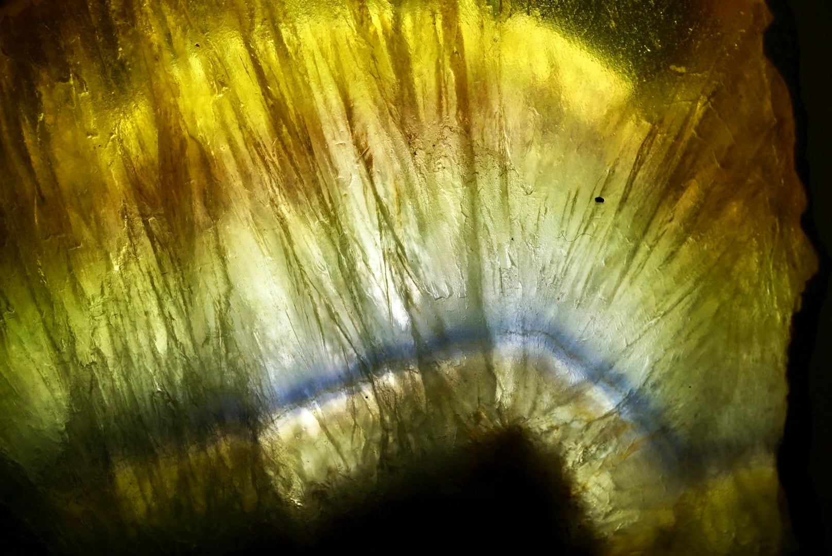 光を透かすと内部の繊維質構造が鮮やかに浮かび上がり、わずかな虹色の遊色が垣間見えます。