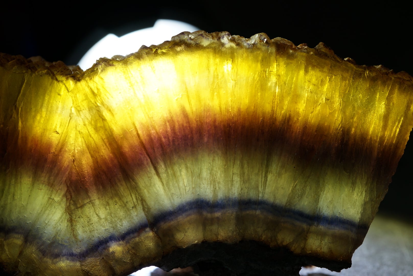 黄〜橙の温かい色合いと、縞状に重なるパープル・ブルーの帯が特徴で、国外では「ブルーリバーフローライト」とも呼ばれています。