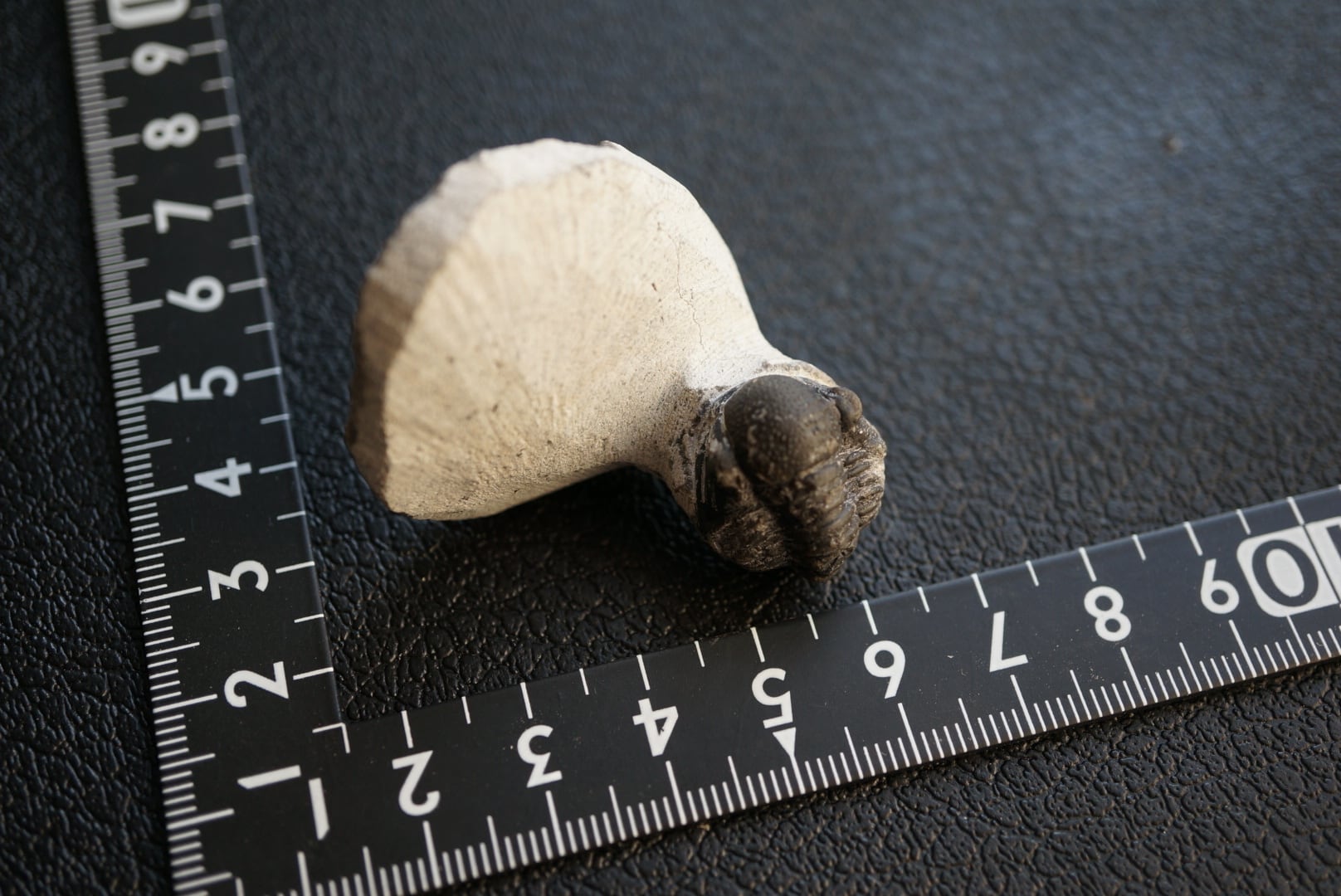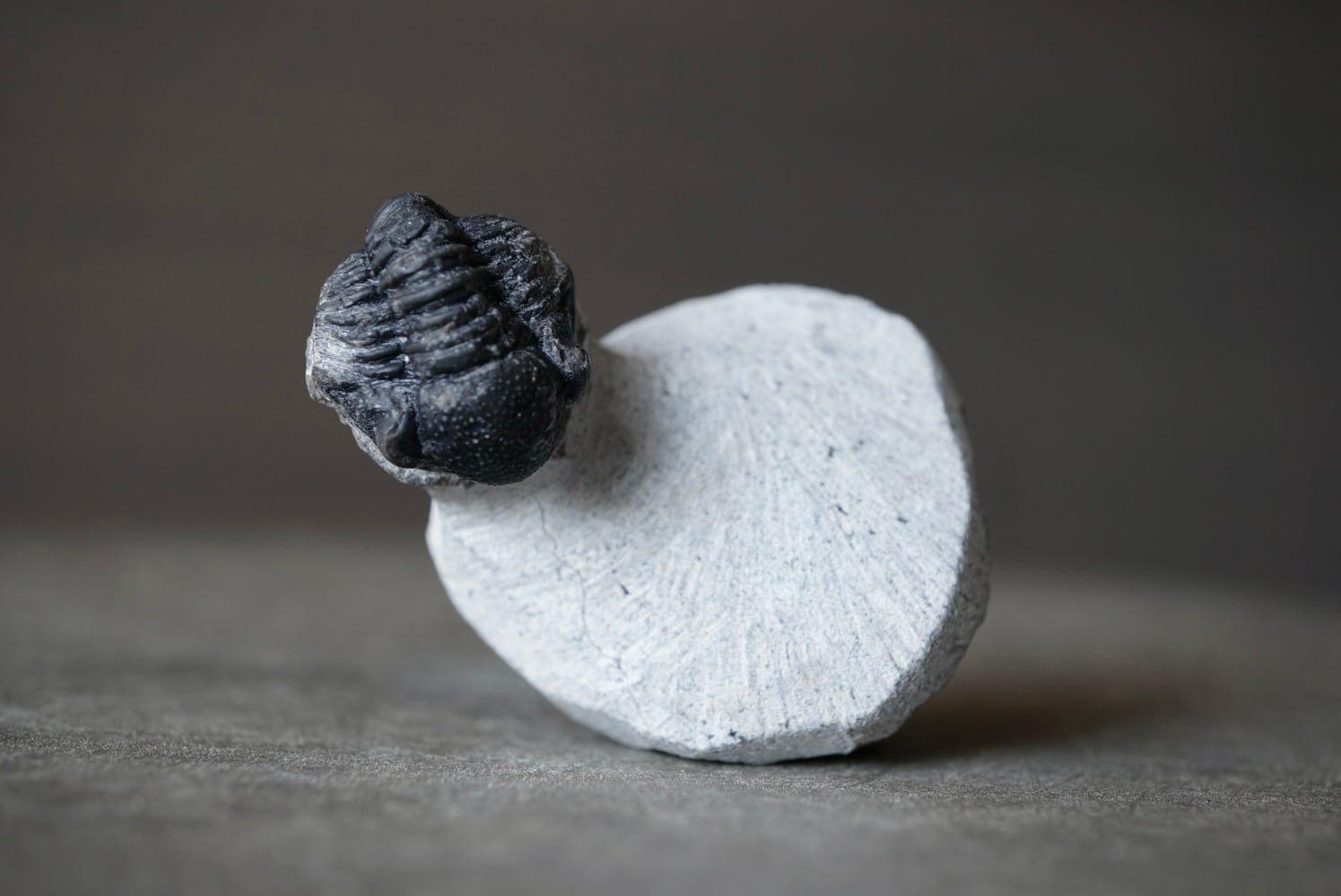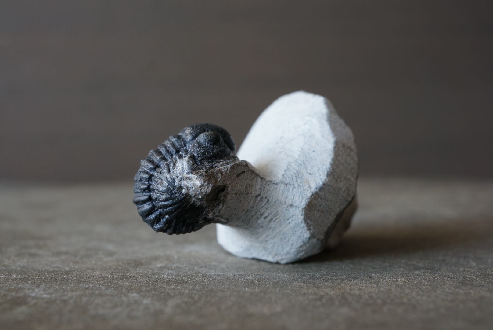 三葉虫の眼や節構造には細かな凹凸が保たれ、黒い殻の質感が母岩の淡い灰色によく映えます。わずかにうつむくような角度で象られ、どこか人物像の胸像にも似たシュールでメランコリックな趣を感じるものを選んでいます。