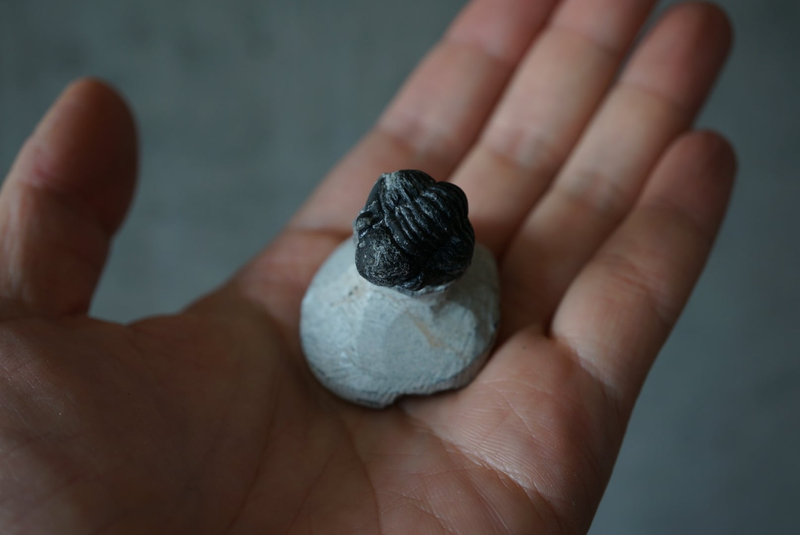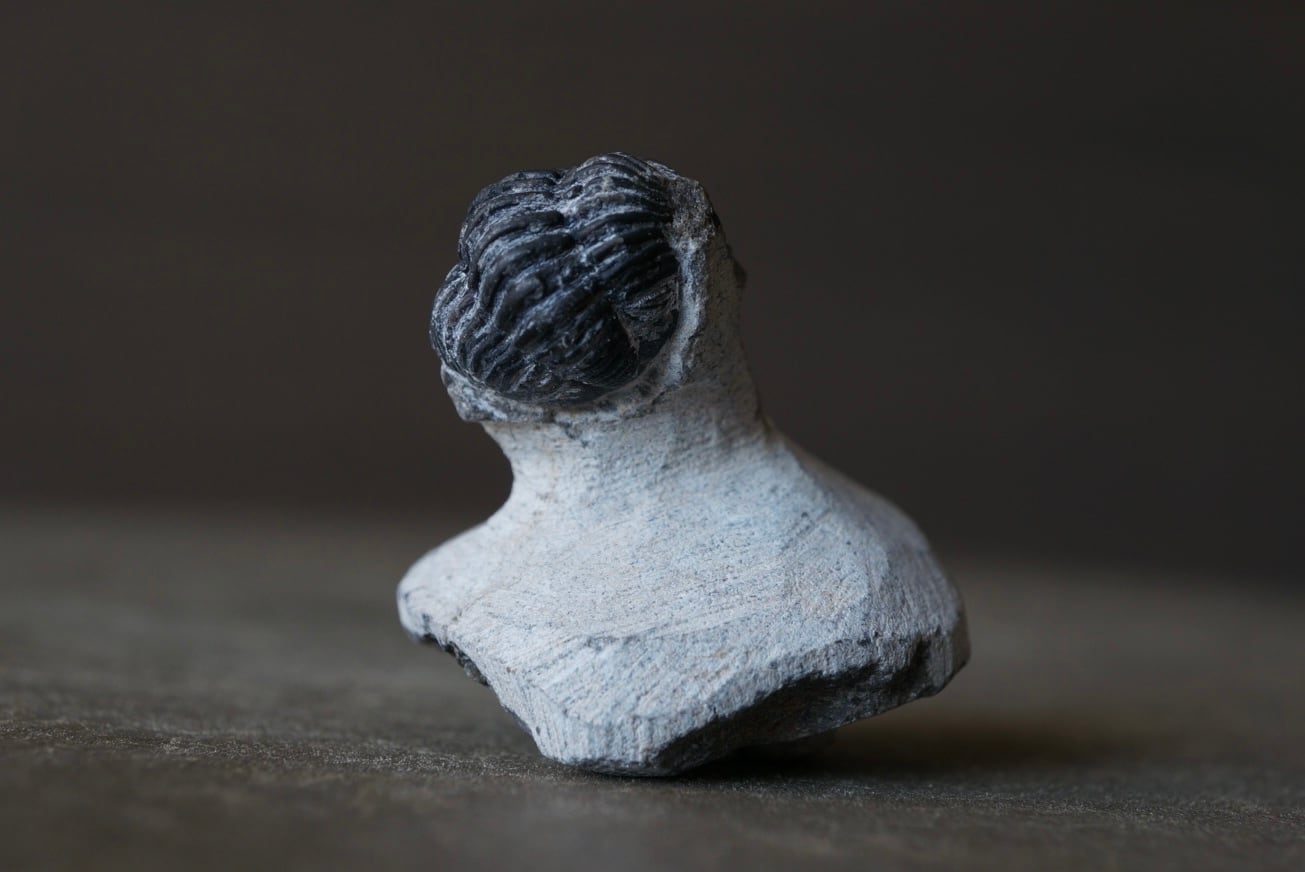 三葉虫の眼や節構造には細かな凹凸が保たれ、黒い殻の質感が母岩の淡い灰色によく映えます。わずかにうつむくような角度で象られ、どこか人物像の胸像にも似たシュールでメランコリックな趣を感じるものを選んでいます。