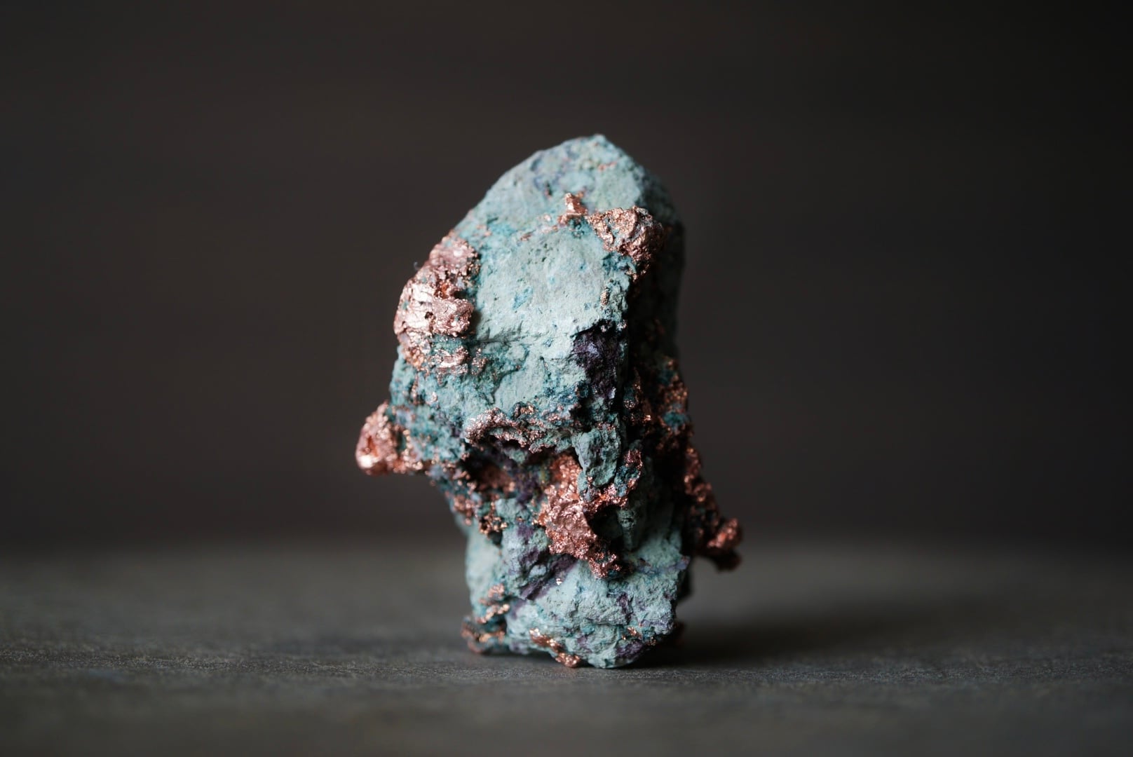 無骨な立体の中心には彫塑の芯のような重さが潜み、乾いた緑青色と粘りのある金属光沢の触れ合いには、自然物ならではの深い陰影が宿っています。