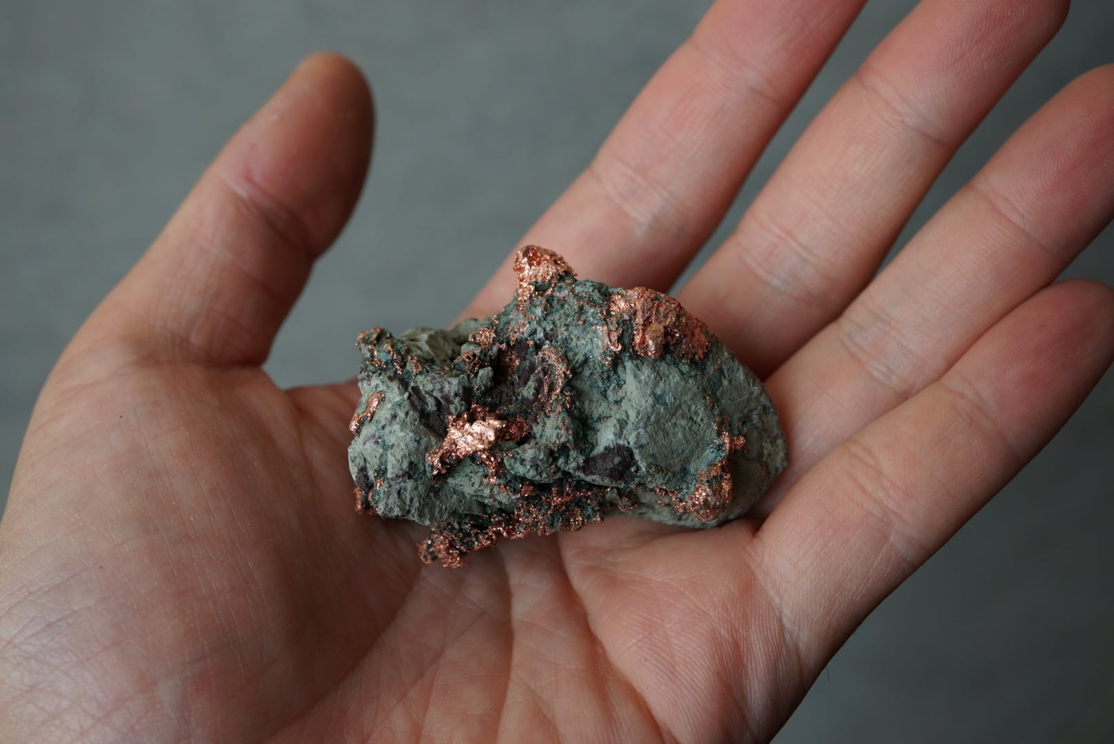 苔むしたような母岩から妖艶な赤銅色が覗いています。
