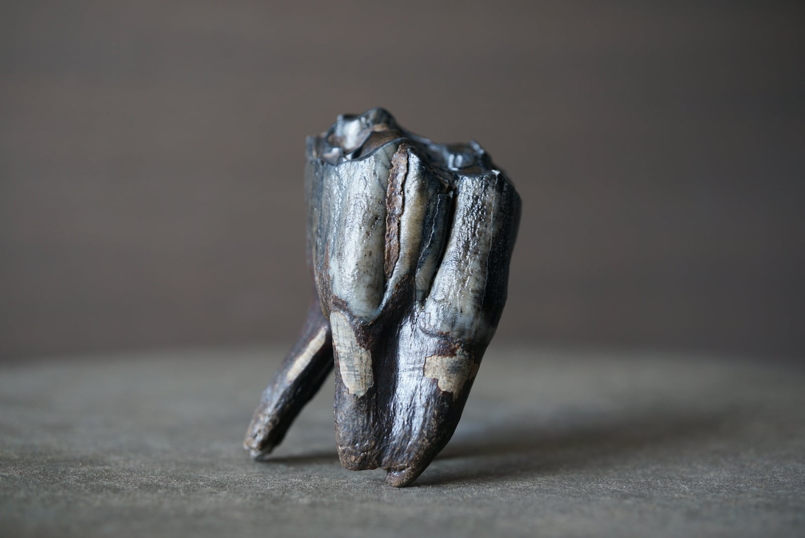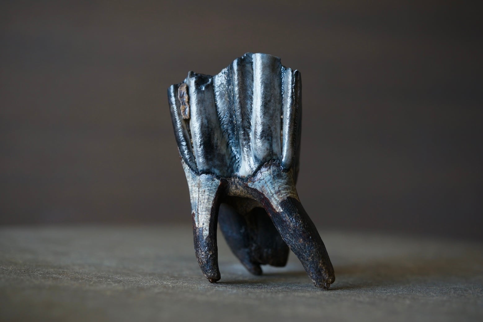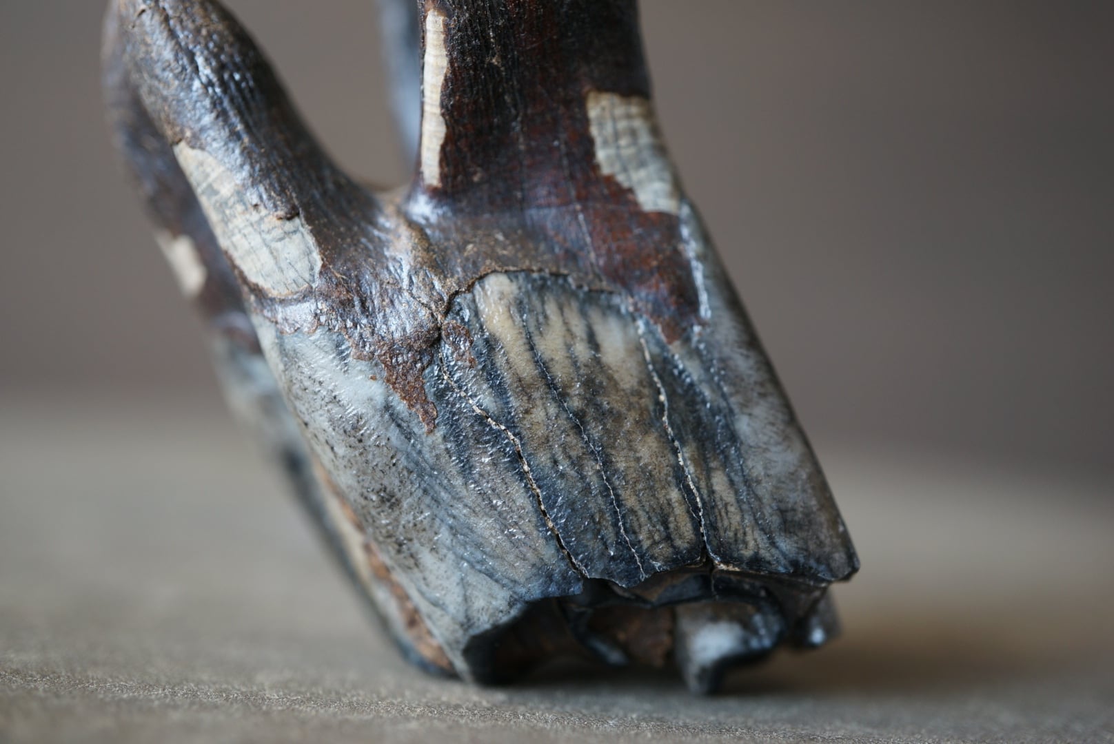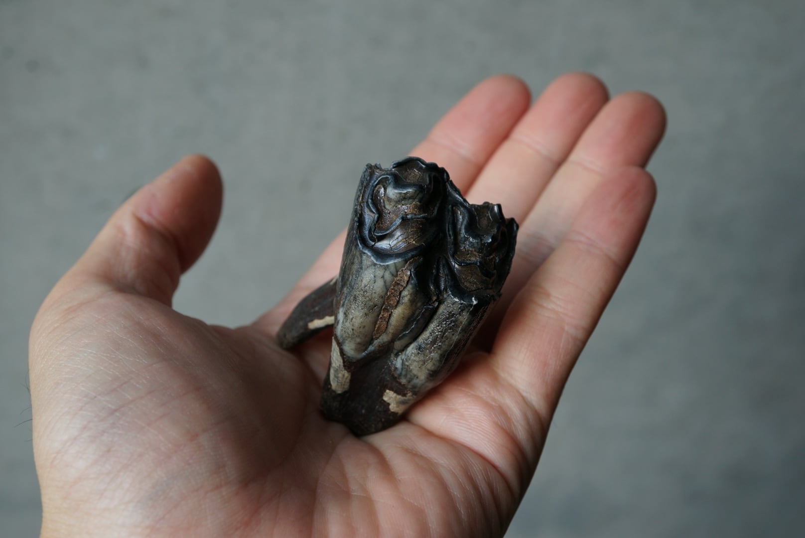 エナメル質の菱の実のような模様、角のような歯根、側面の皺跡など、禍々しくも蠱惑的なディテールが魅力です。