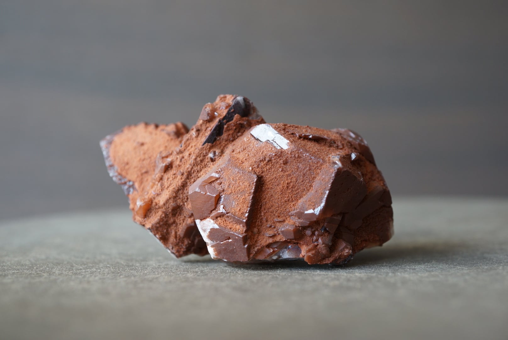 本石の結晶内部は無色透明から淡い赤褐色へとグラデーションをつくり、その上をヘマタイトの粉状粒子がやわらかく覆っています。