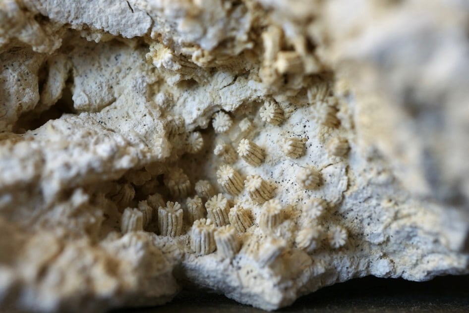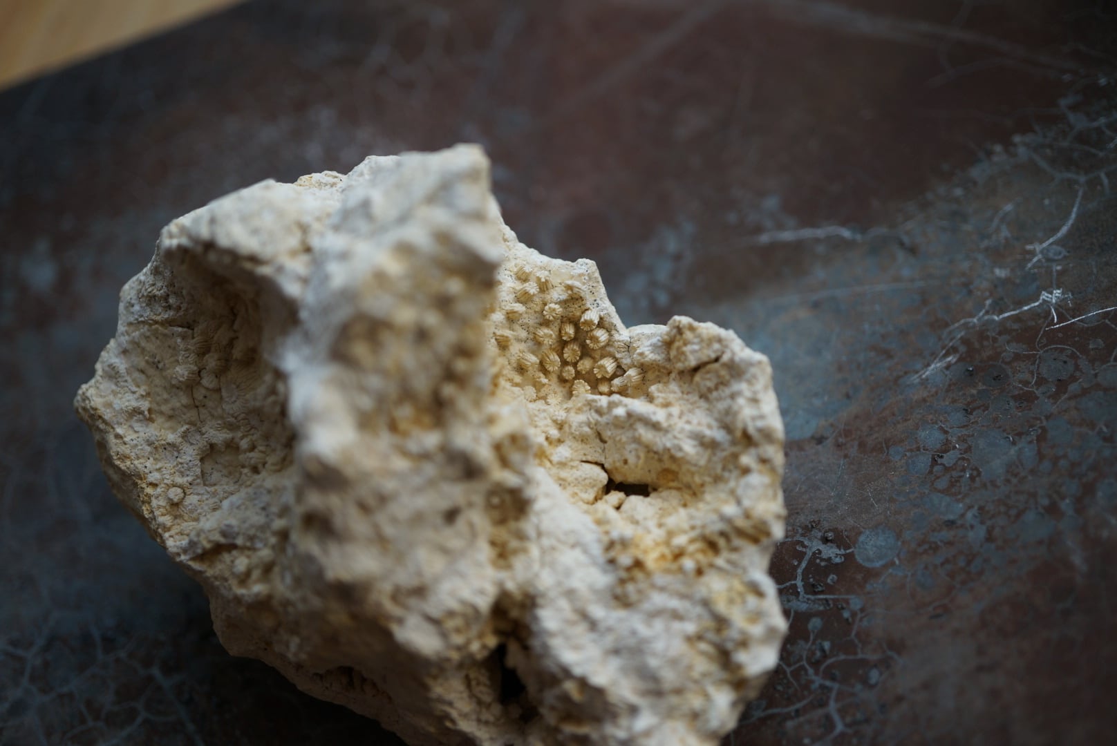 約1億5千万年前の浅海で群体をつくりながら生息していたサンゴが、石灰質堆積物に埋もれることで三次元的な立体構造を保ったまま保存されています。