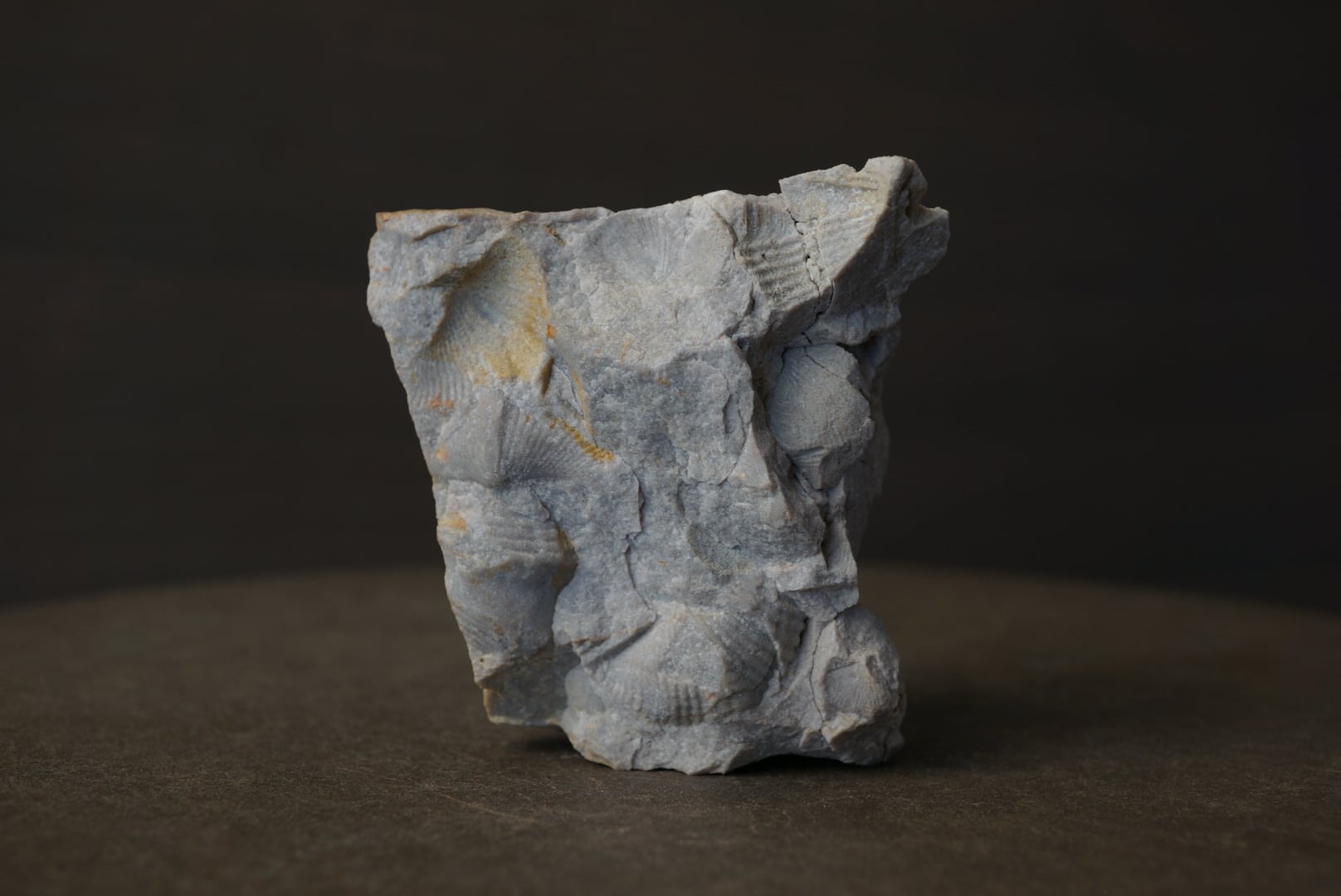 本石では複数の個体が一塊となって残り、殻の縁が残る部分、母岩に半ば埋没した部分、欠けによって露わになった断面が入り交じり、まるで荒削りのまま残された石膏原型のような佇まいです。