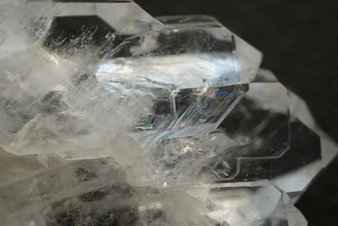 色を含まないガラス質の透明と白濁のわずかな濃淡、時折仄めく虹が重なり合い、ミニマルでありながら奥行きのある表情を湛えています。