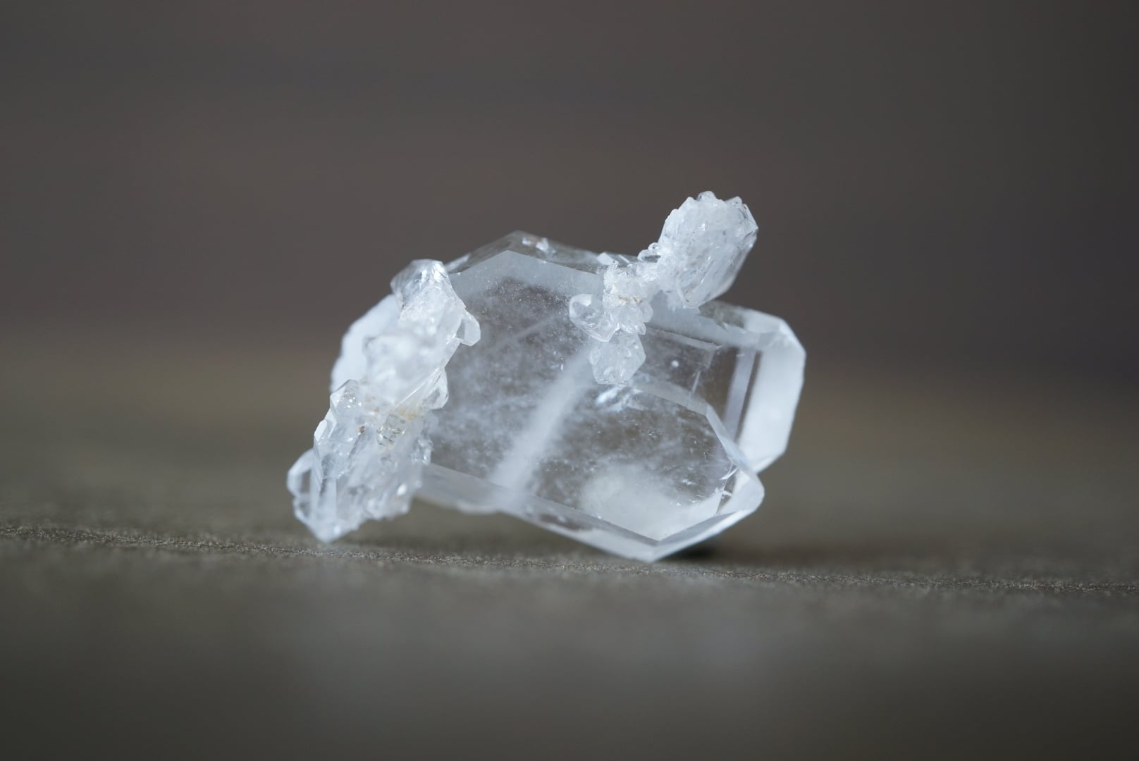 内部の歪みを補正しながら成長した結晶であるため、複数の結晶が横方向に連なったり、タビュラー状(平らな板状結晶)、階段状、棚状に積層するなど、直線的な秩序と、不規則に重なり合うランダム性を同時に宿したユニークな造形です。