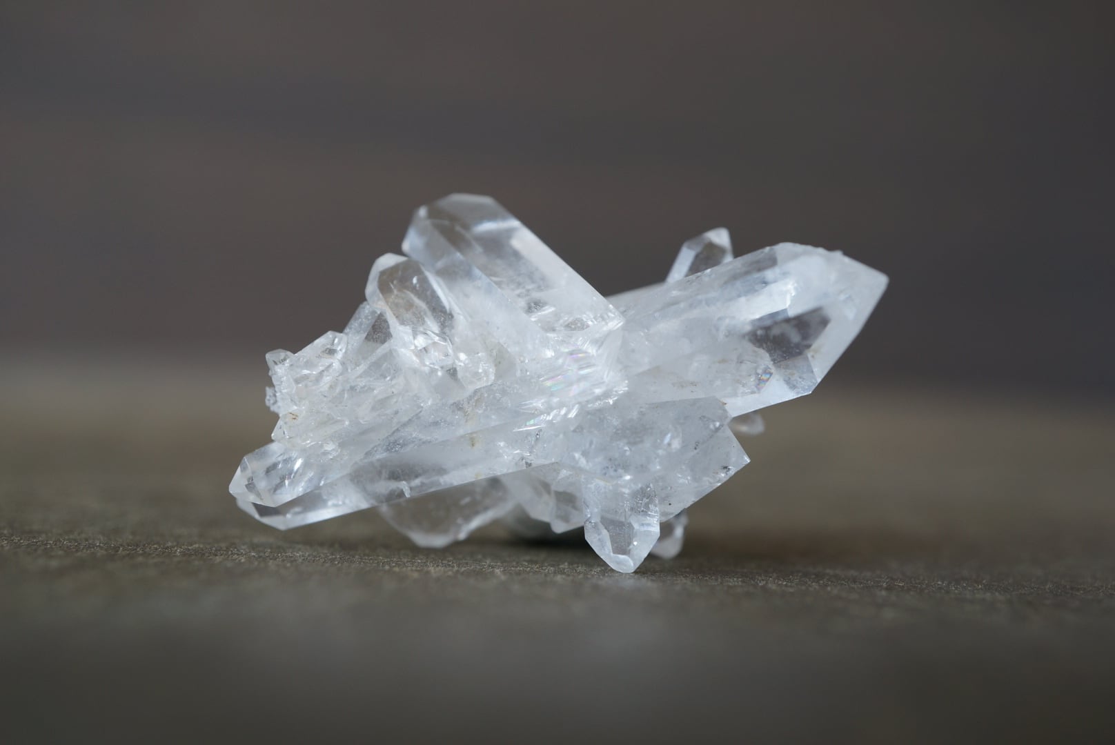 色を含まないガラス質の透明と白濁のわずかな濃淡、時折仄めく虹が重なり合い、ミニマルでありながら奥行きのある表情を湛えています。