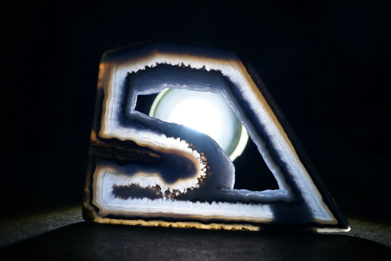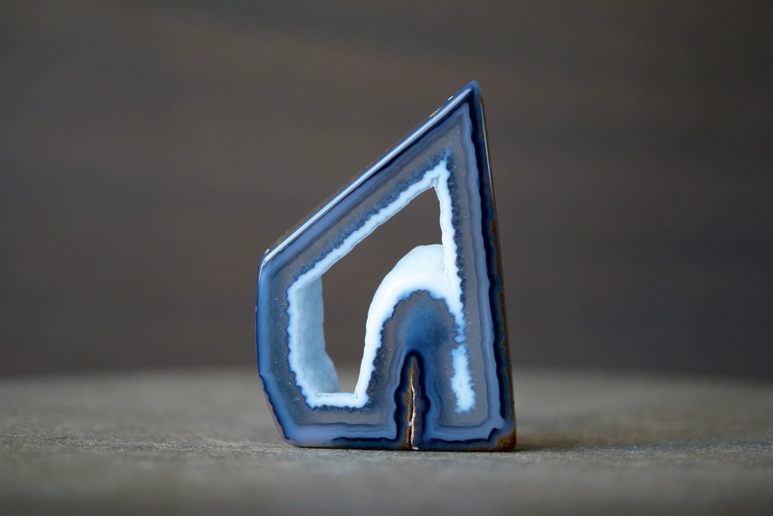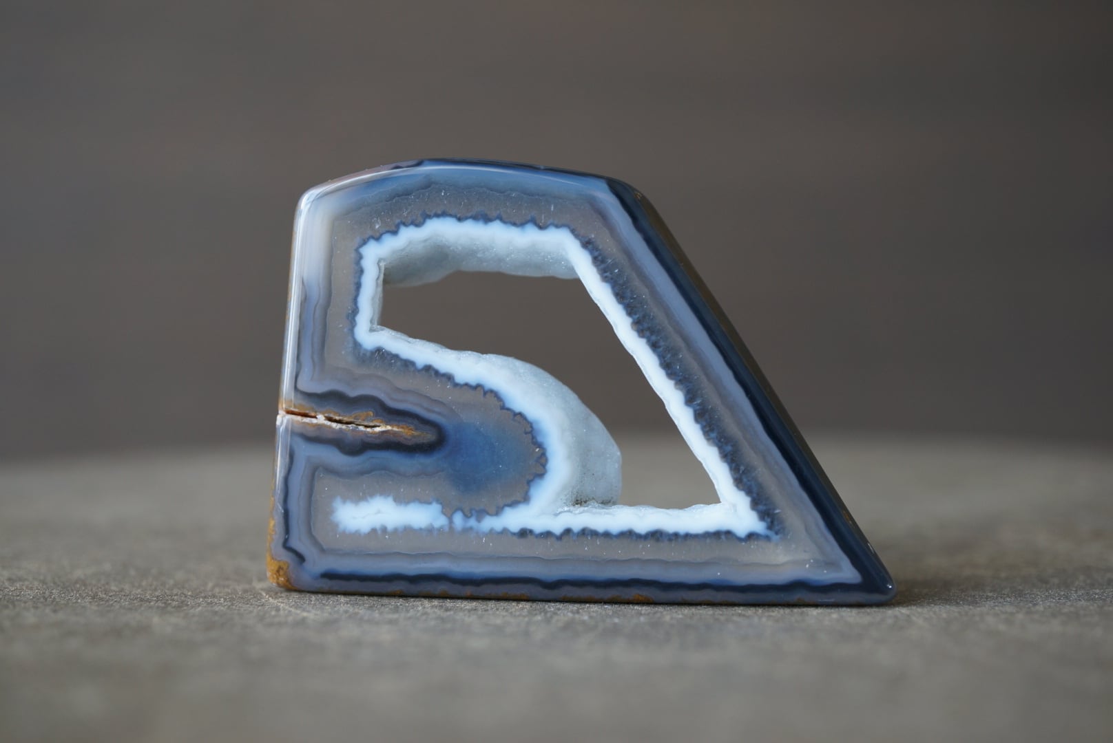 「Polyhedroid」は「多面体」を意味し、通常の同心円状や縞状のアゲートとは異なり、角張った面や幾何学的な層理が交錯する内部構造を持ちます。