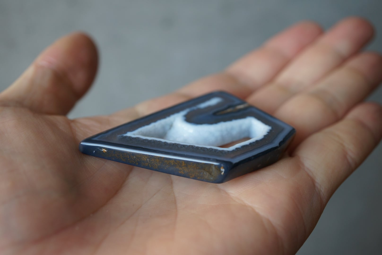 本石のエッジの効いたフレームと、雪のような晶洞内のカルセドニーが、ポリへドロイドアゲートの中でも際立って洗練された印象を醸しています。