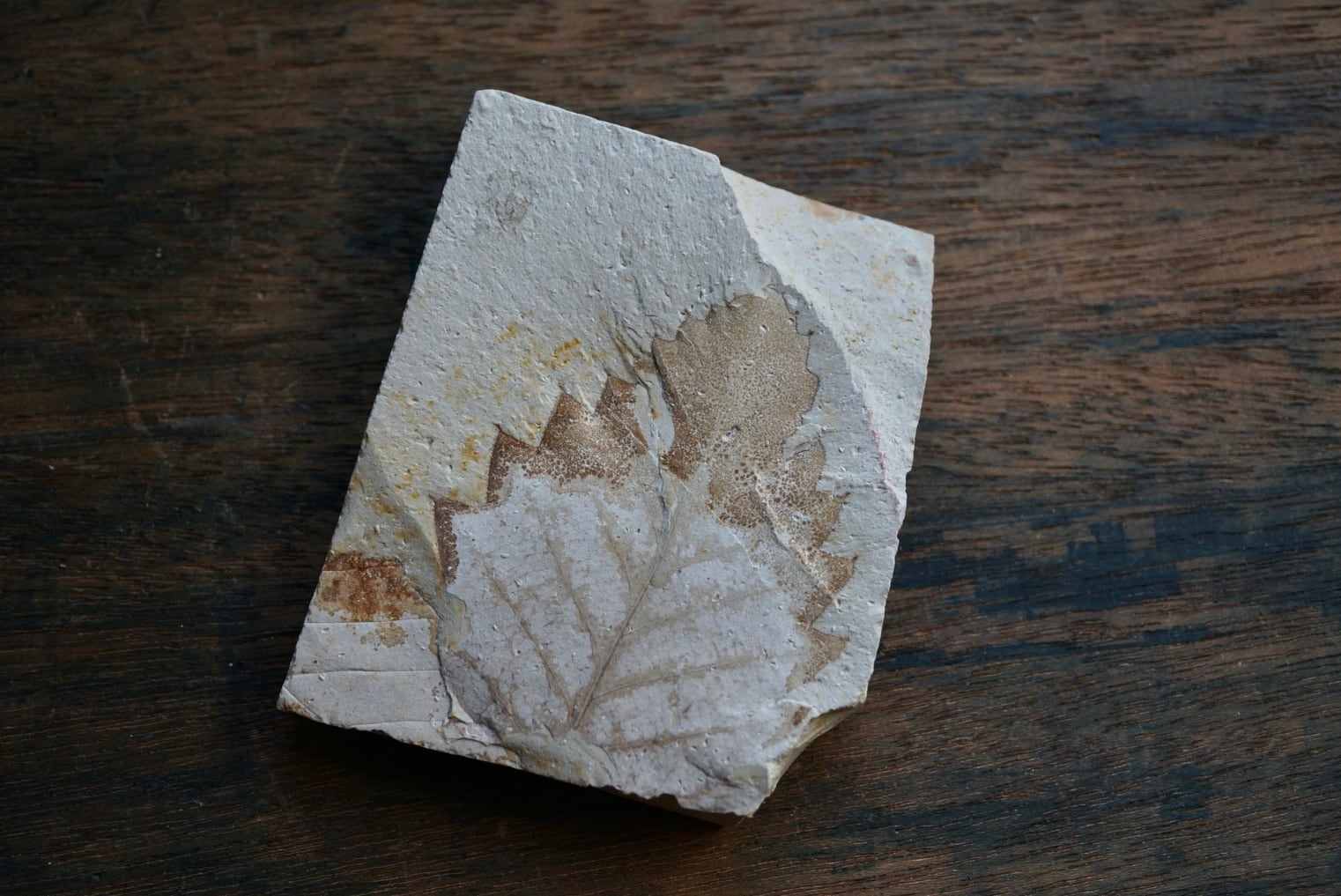 薄く割れた石灰質の母岩に葉の輪郭と葉脈がくっきりと定着しています。
