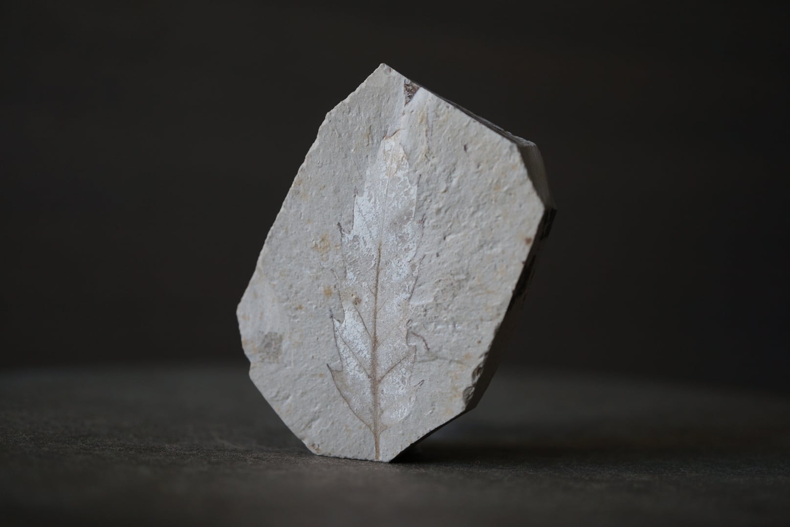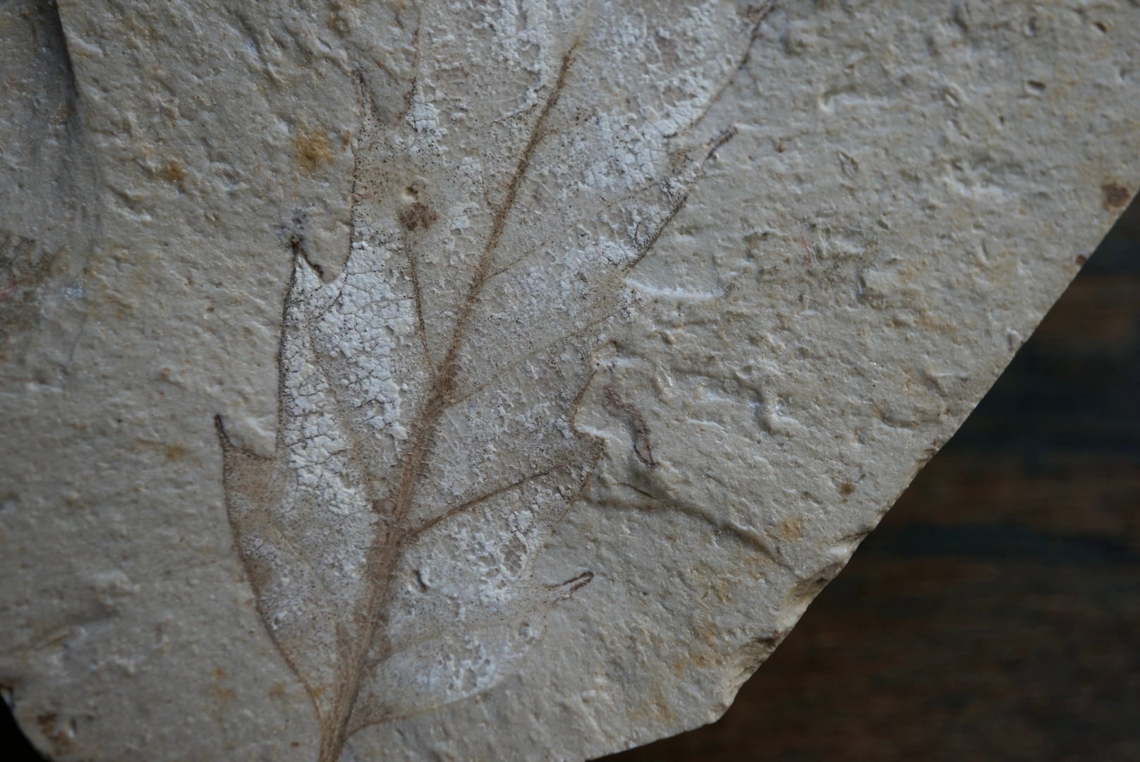 薄く割れた石灰質の母岩に葉の輪郭と葉脈がくっきりと定着しています。