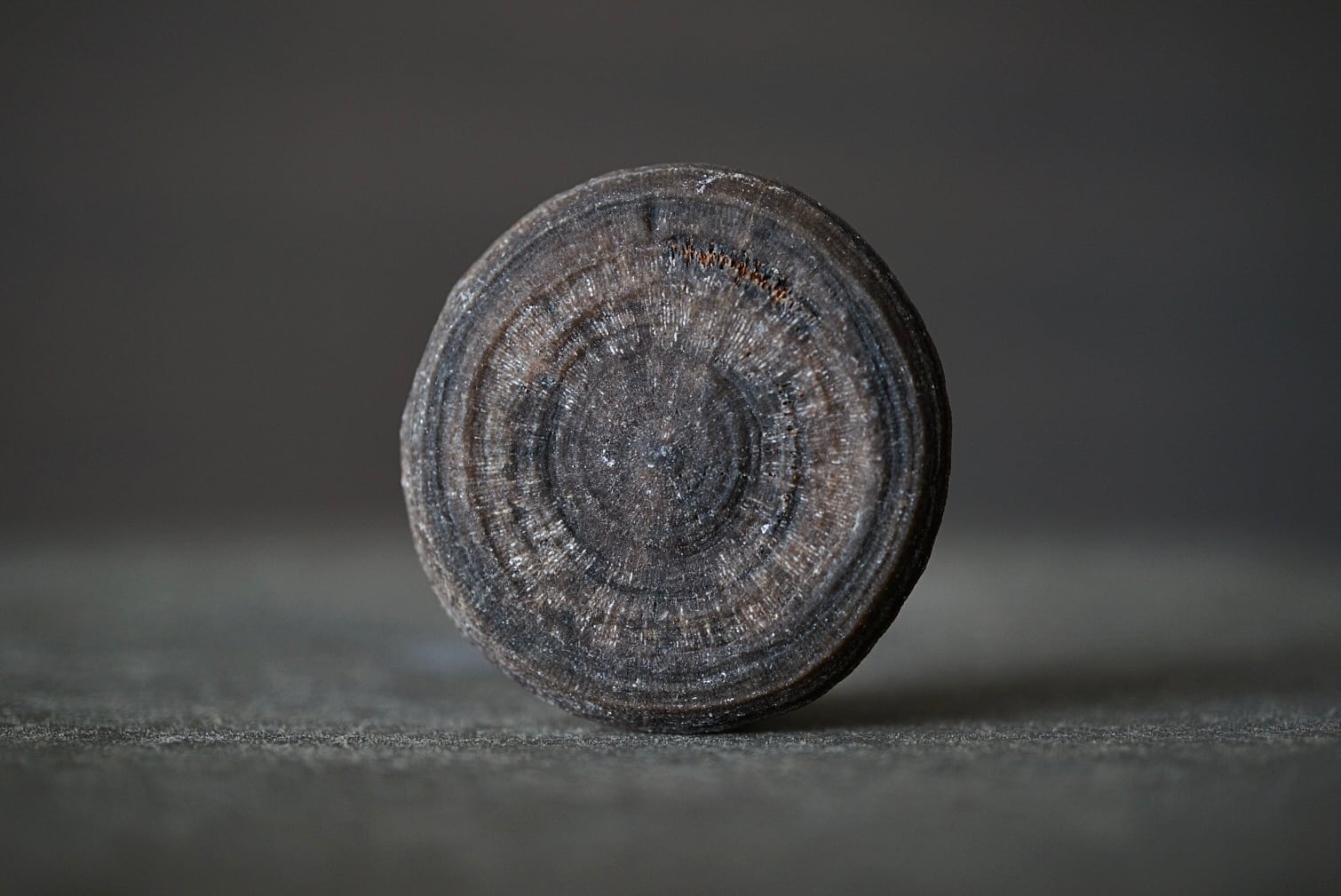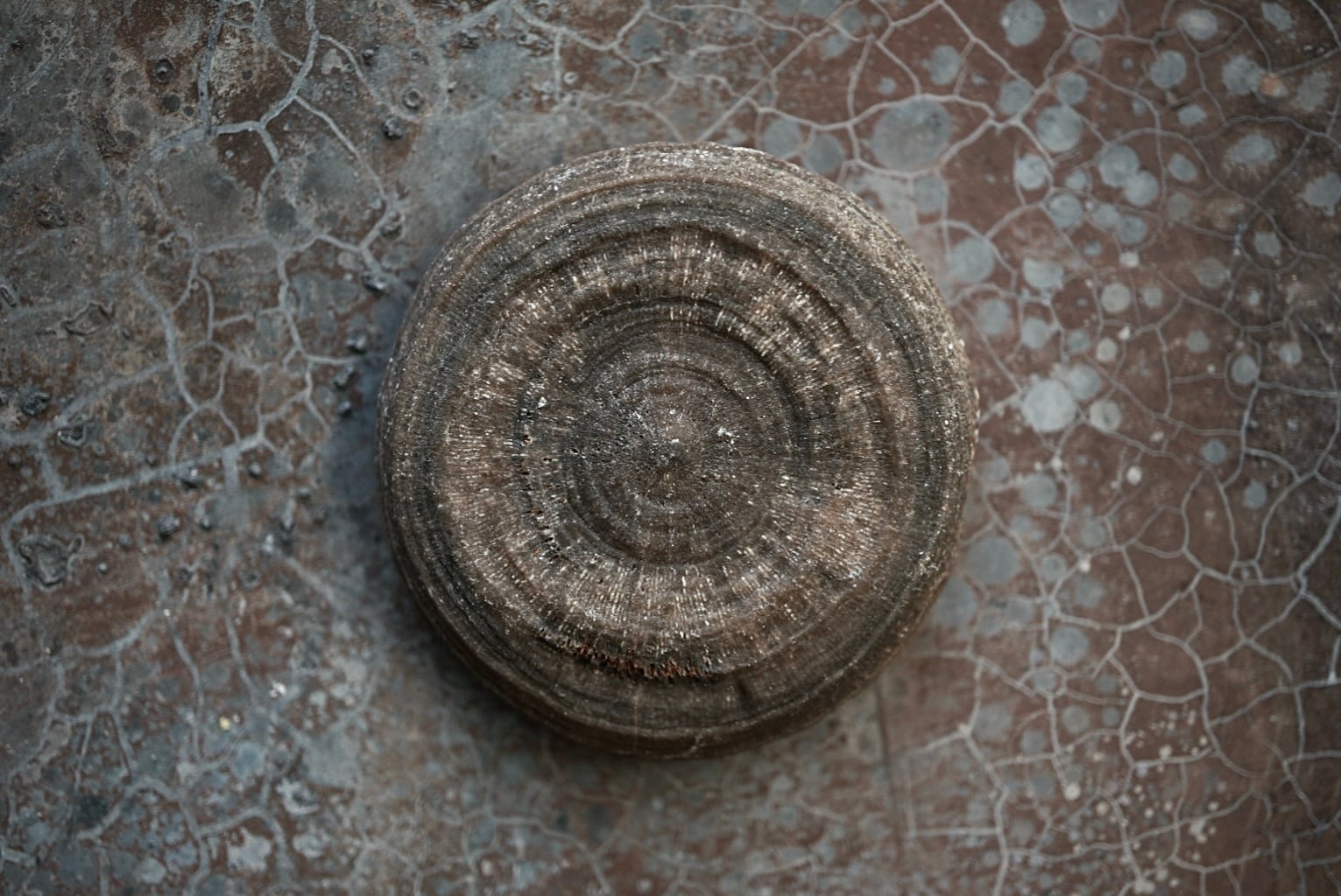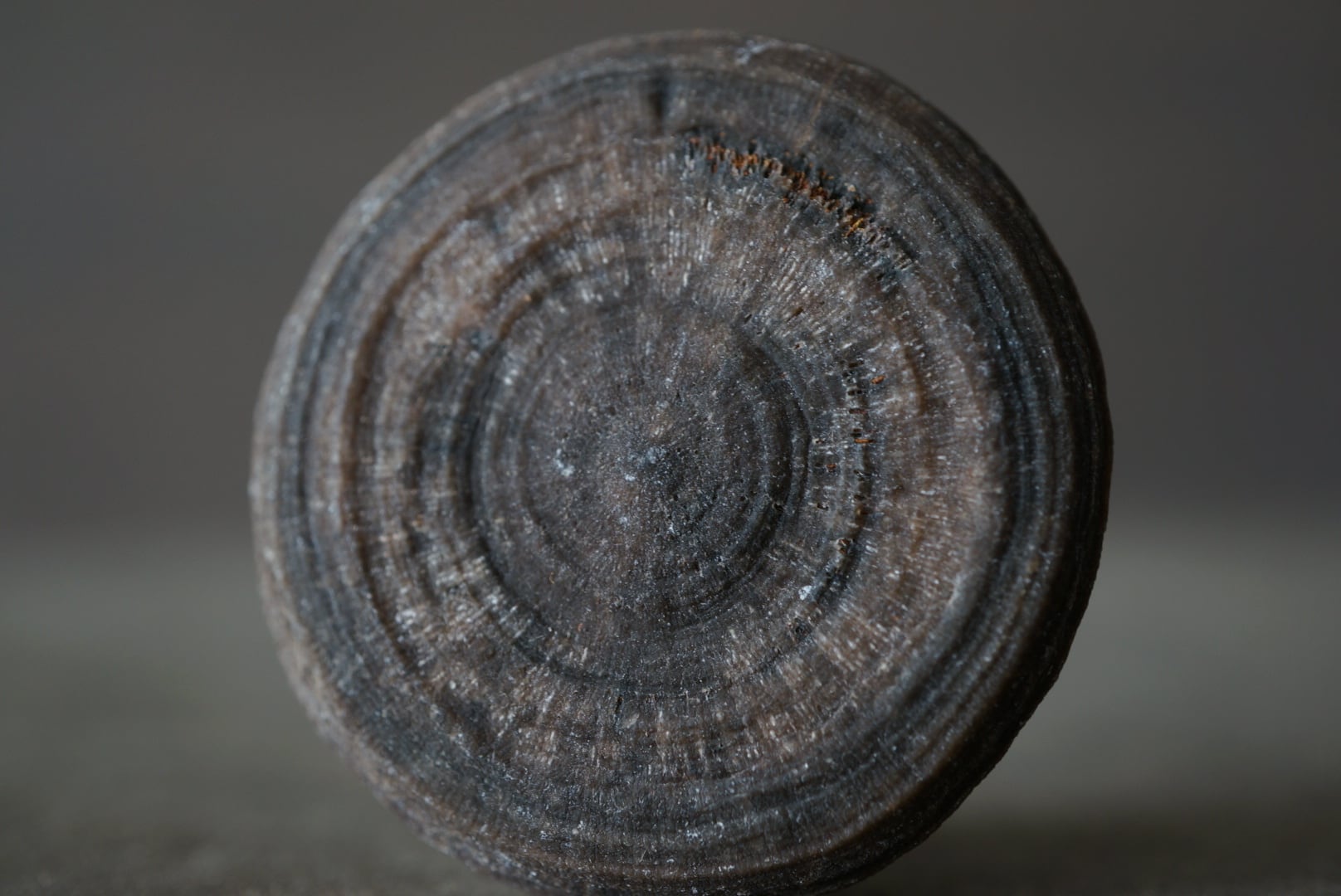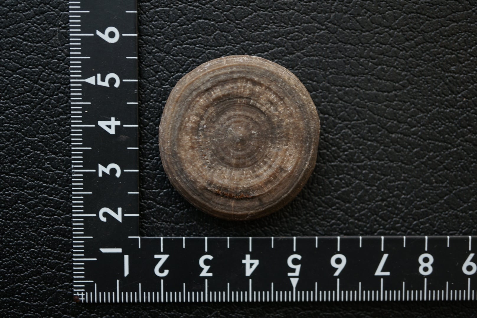 中央から外縁に向かって幾重にも重なる層は、かつての成長の痕跡を克明に残しており、背面には放射状の細やかな線と柔らかなくぼみが美しく残っています。