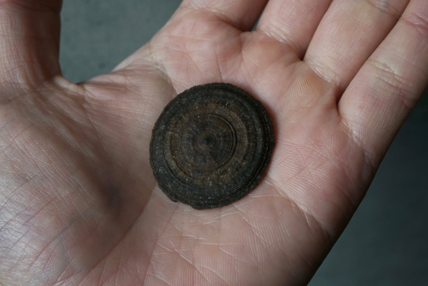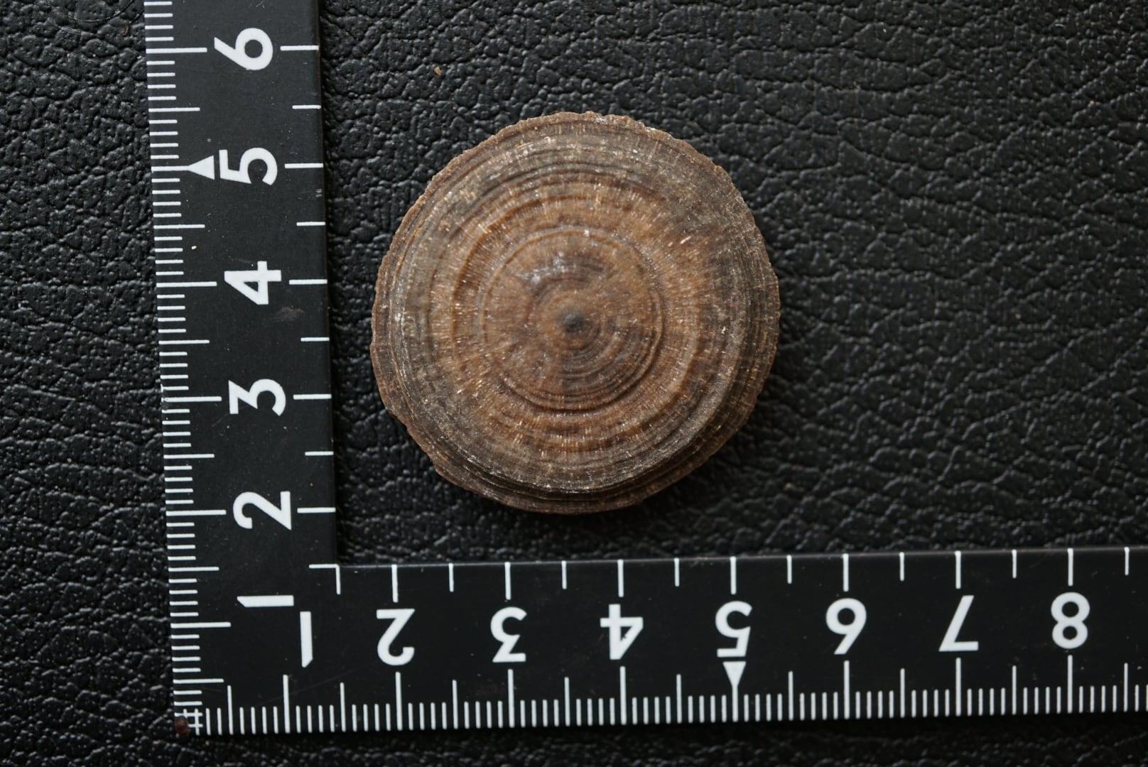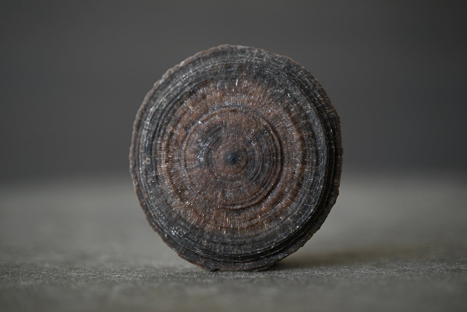 中央から外縁に向かって幾重にも重なる層は、かつての成長の痕跡を克明に残しており、背面には放射状の細やかな線と柔らかなくぼみが美しく残っています。