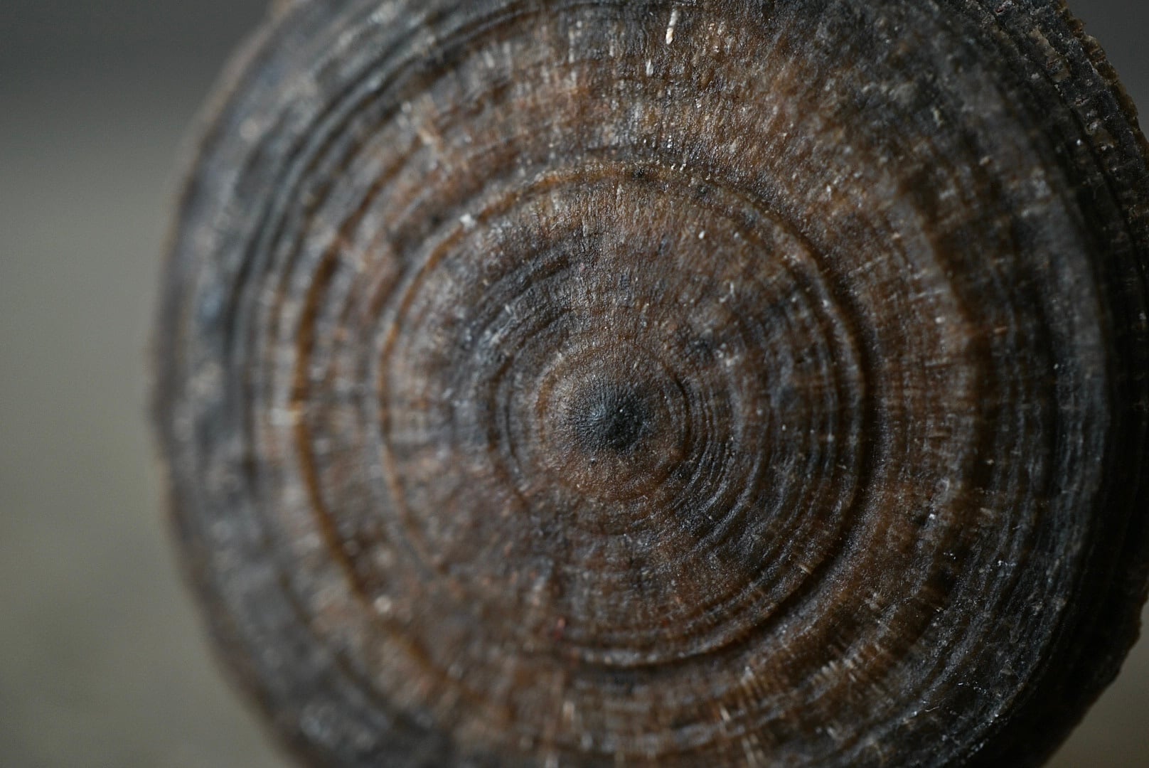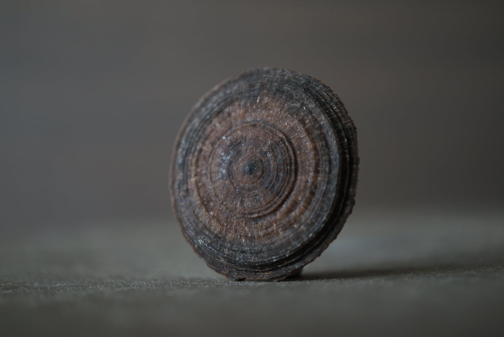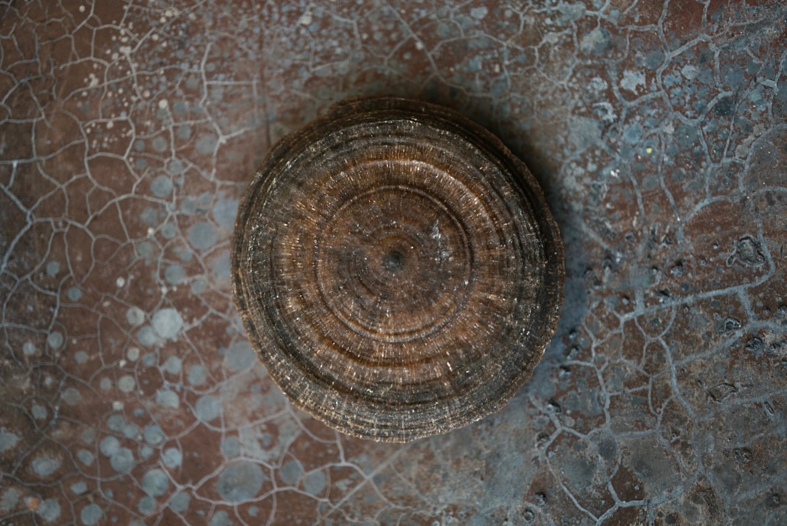 中央から外縁に向かって幾重にも重なる層は、かつての成長の痕跡を克明に残しており、背面には放射状の細やかな線と柔らかなくぼみが美しく残っています。