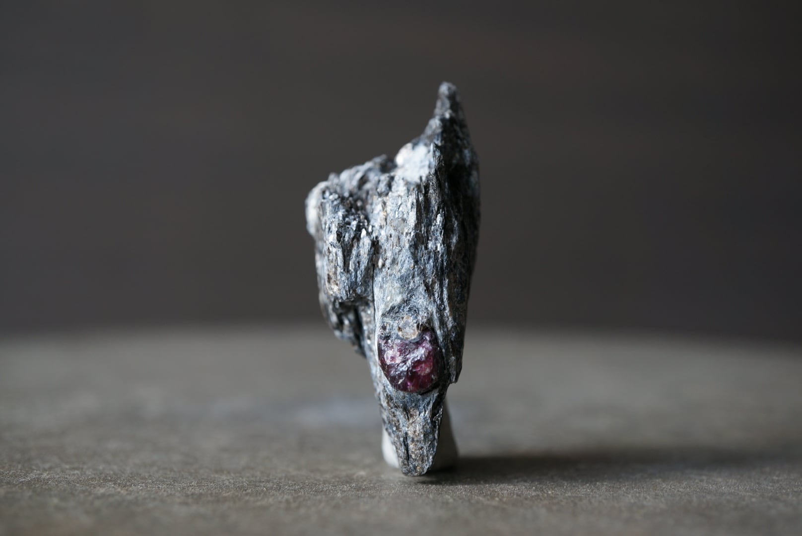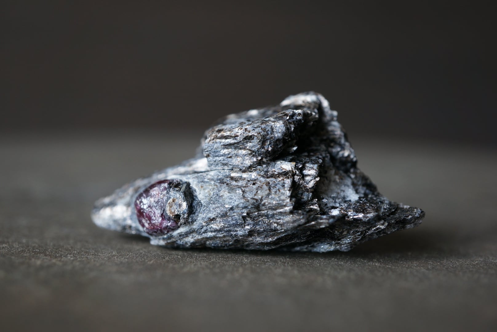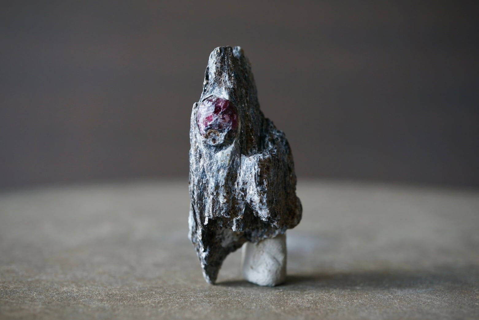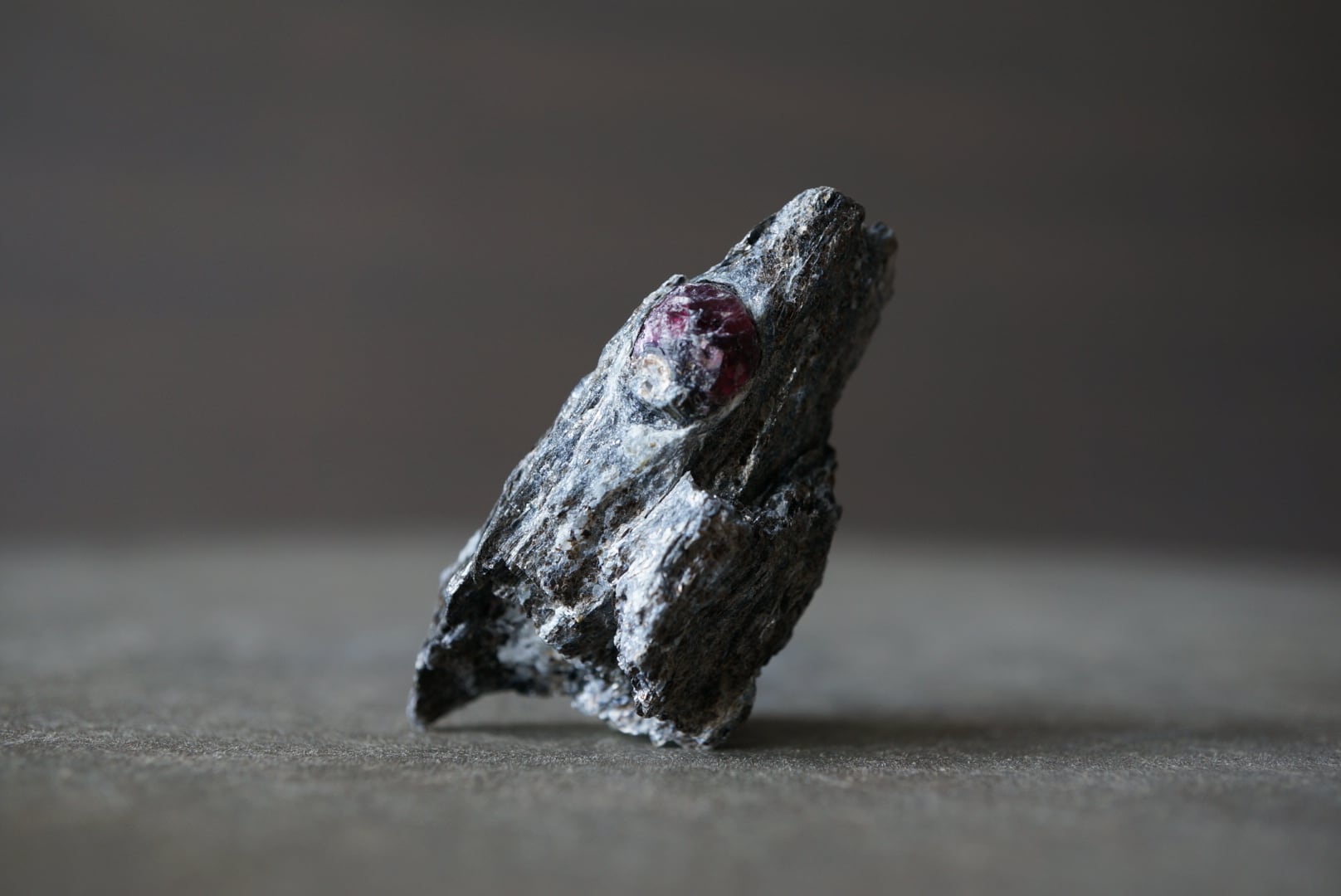赤褐色のガーネットは、母岩に取り込まれた「核」のような存在感があり、全体の造形に静かな緊張感を与えています。