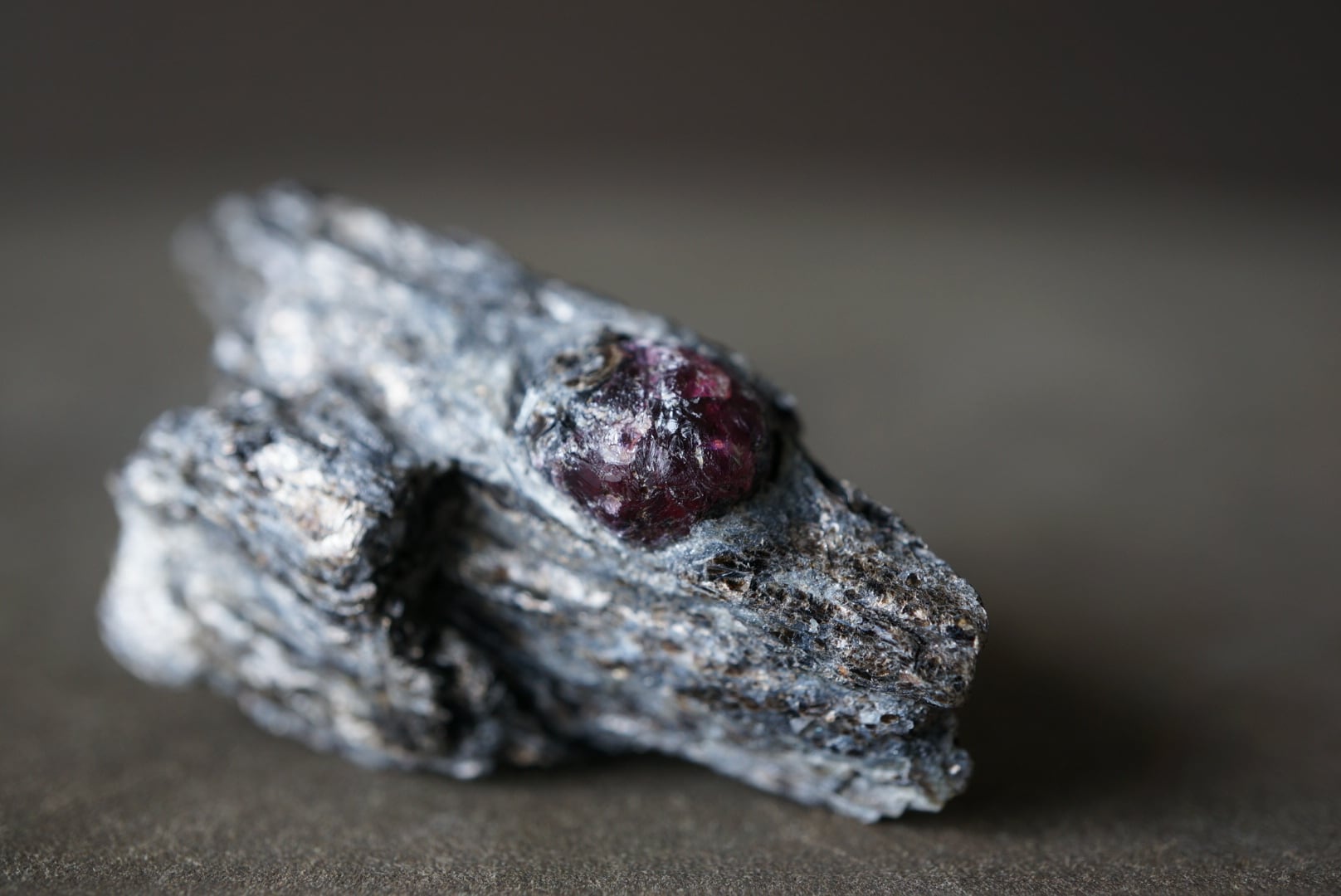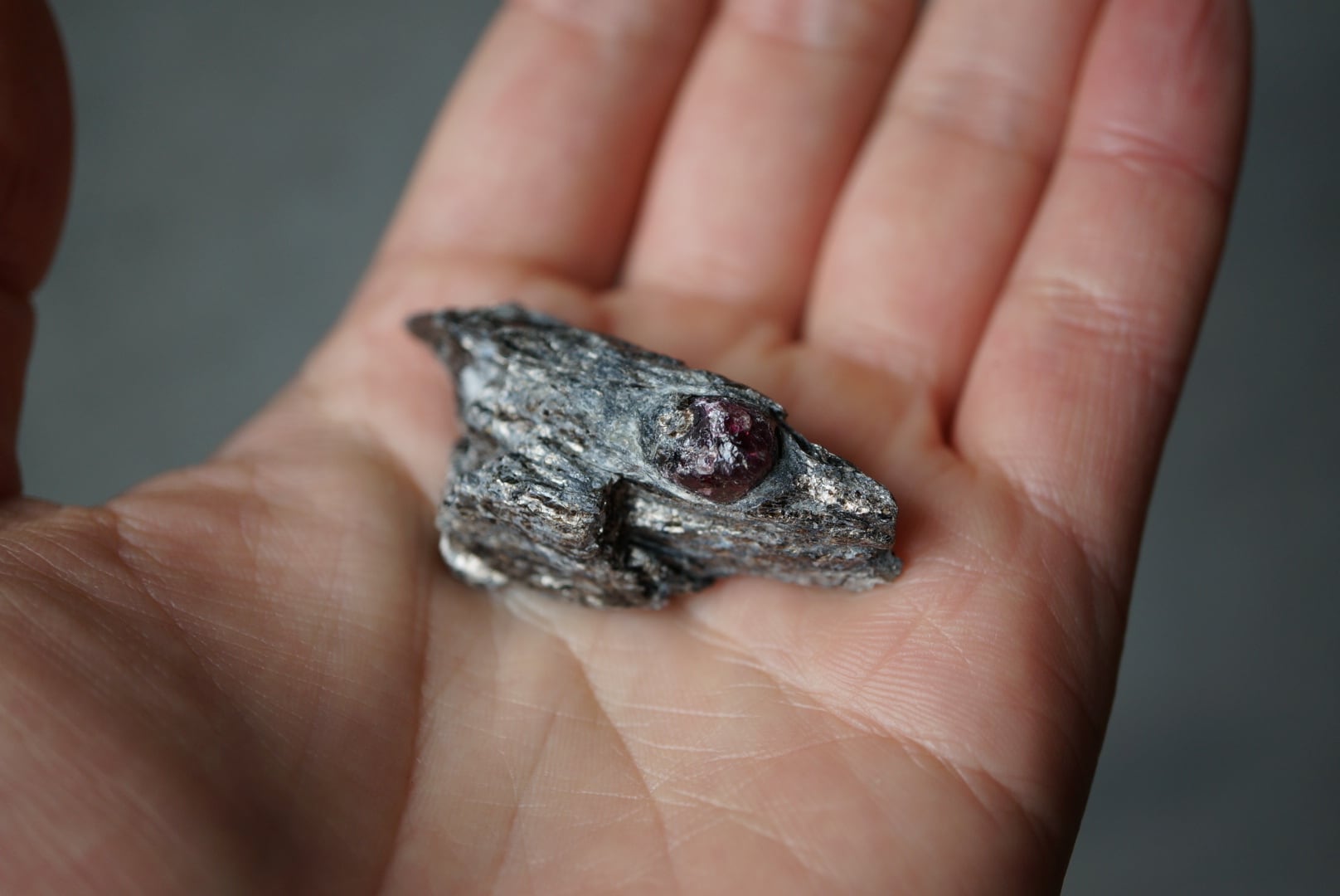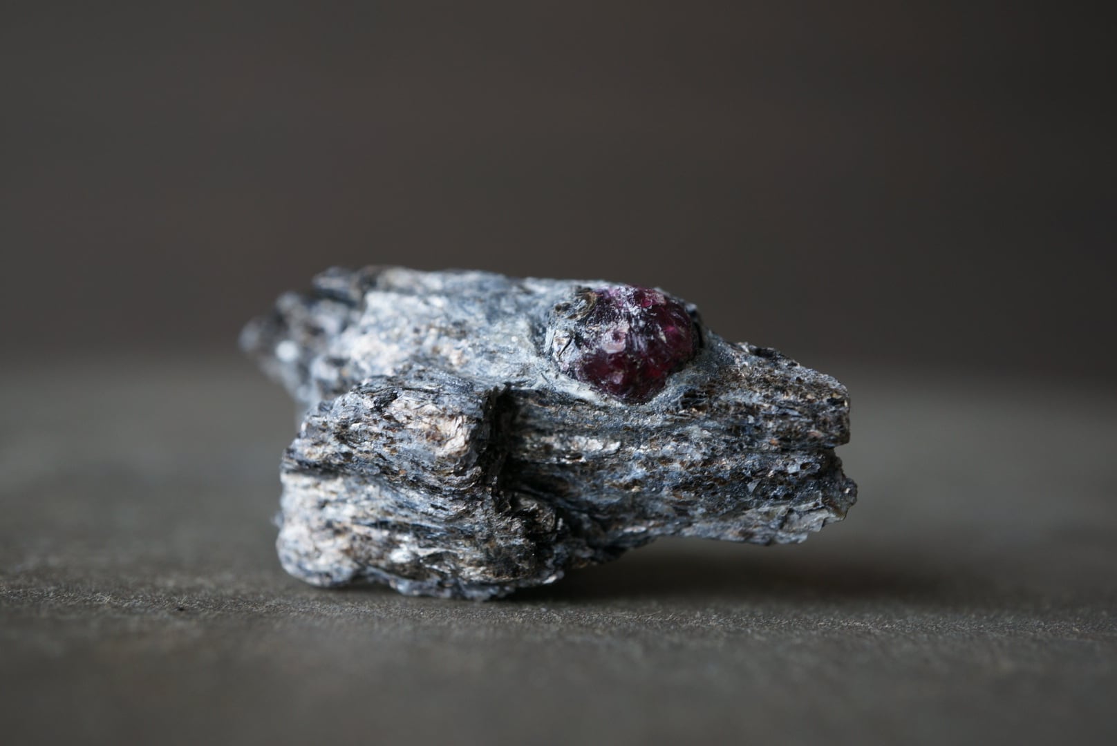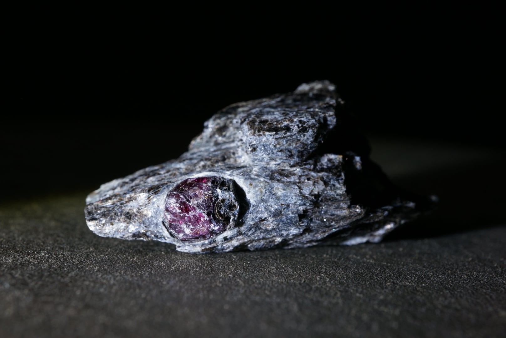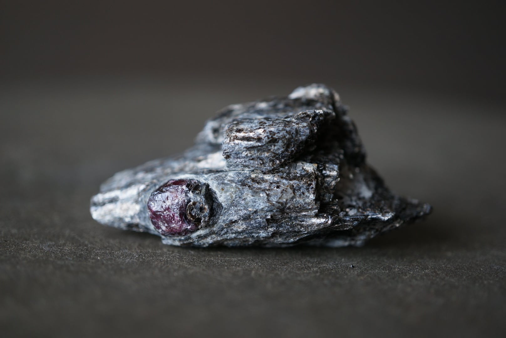 赤褐色のガーネットは、母岩に取り込まれた「核」のような存在感があり、全体の造形に静かな緊張感を与えています。