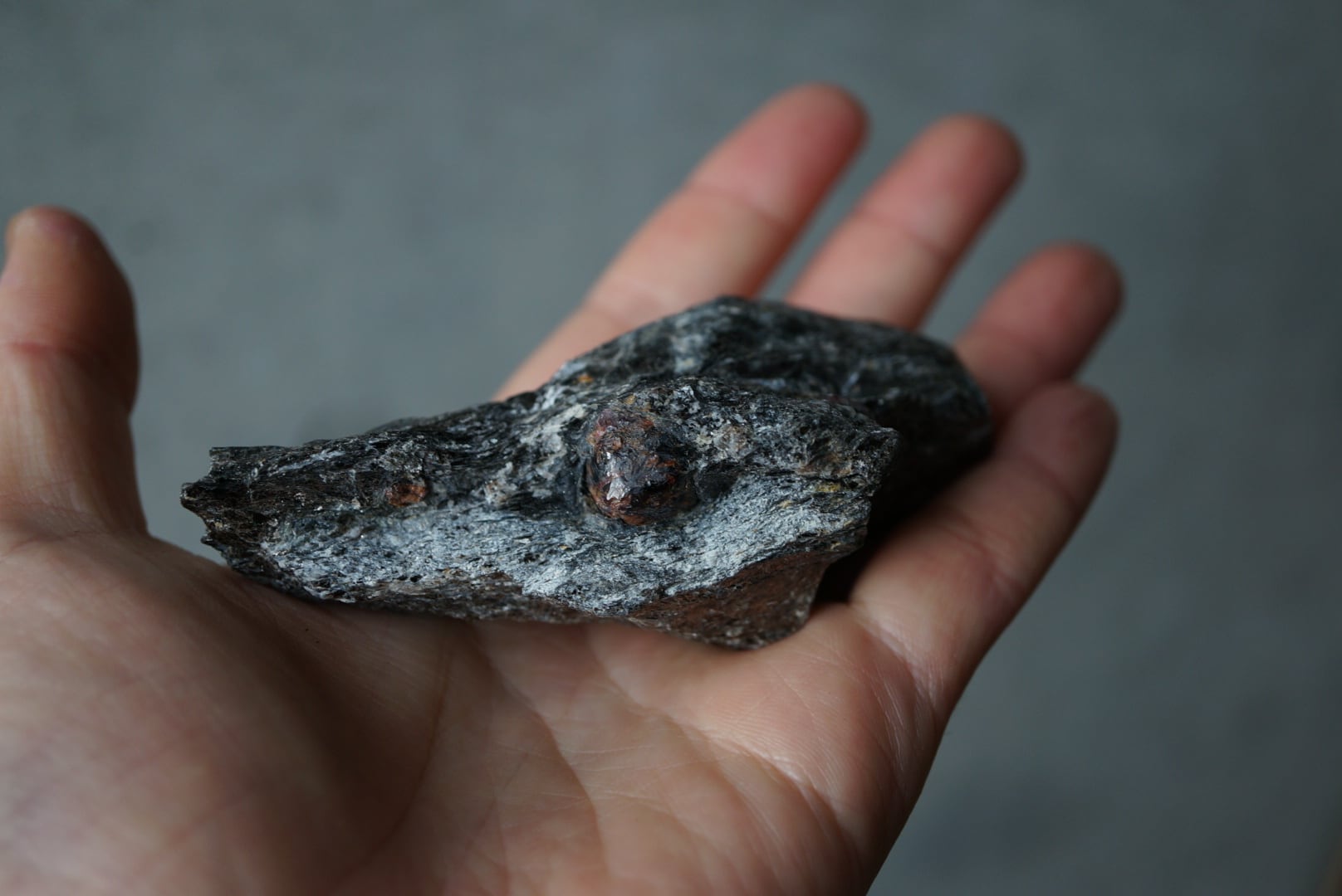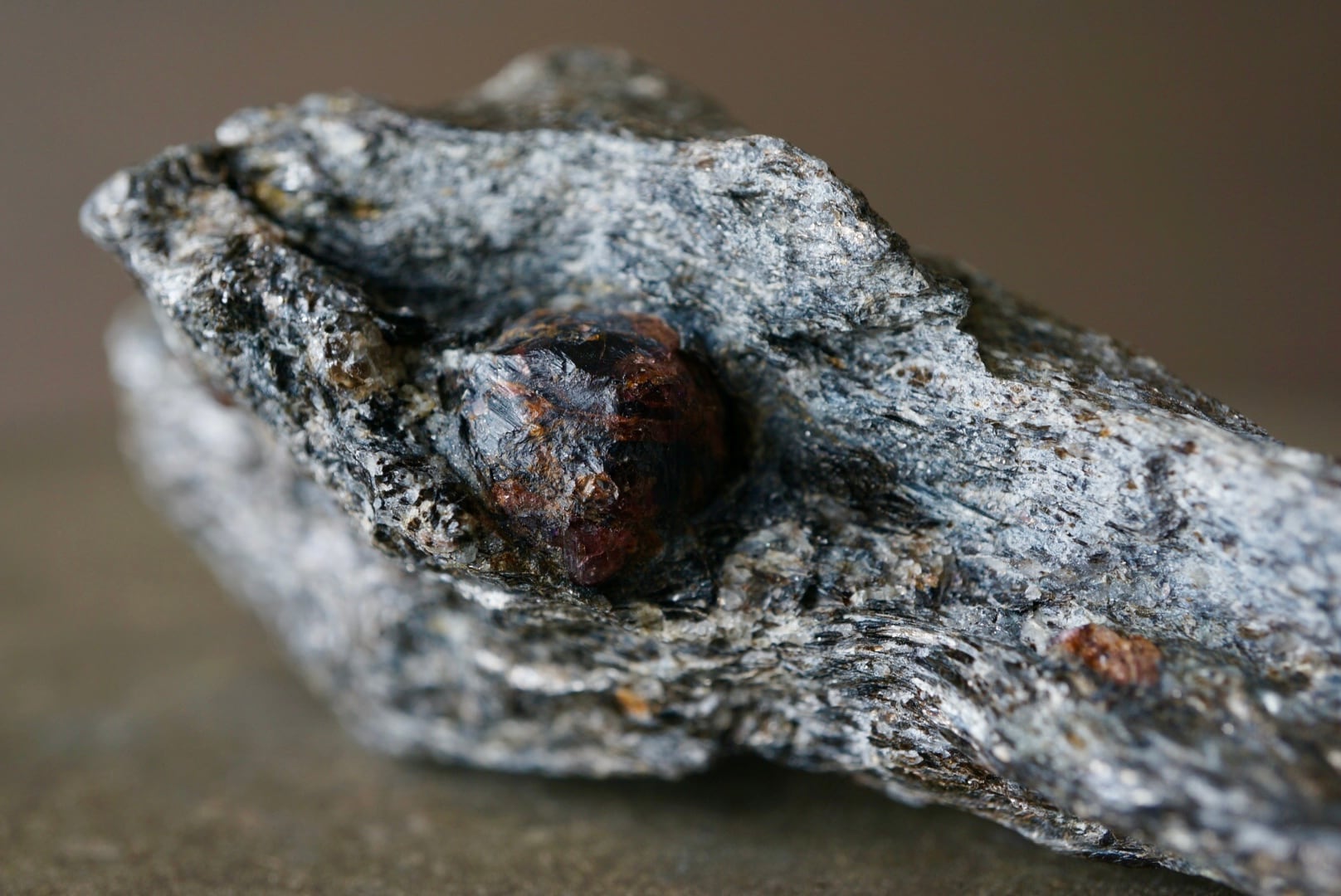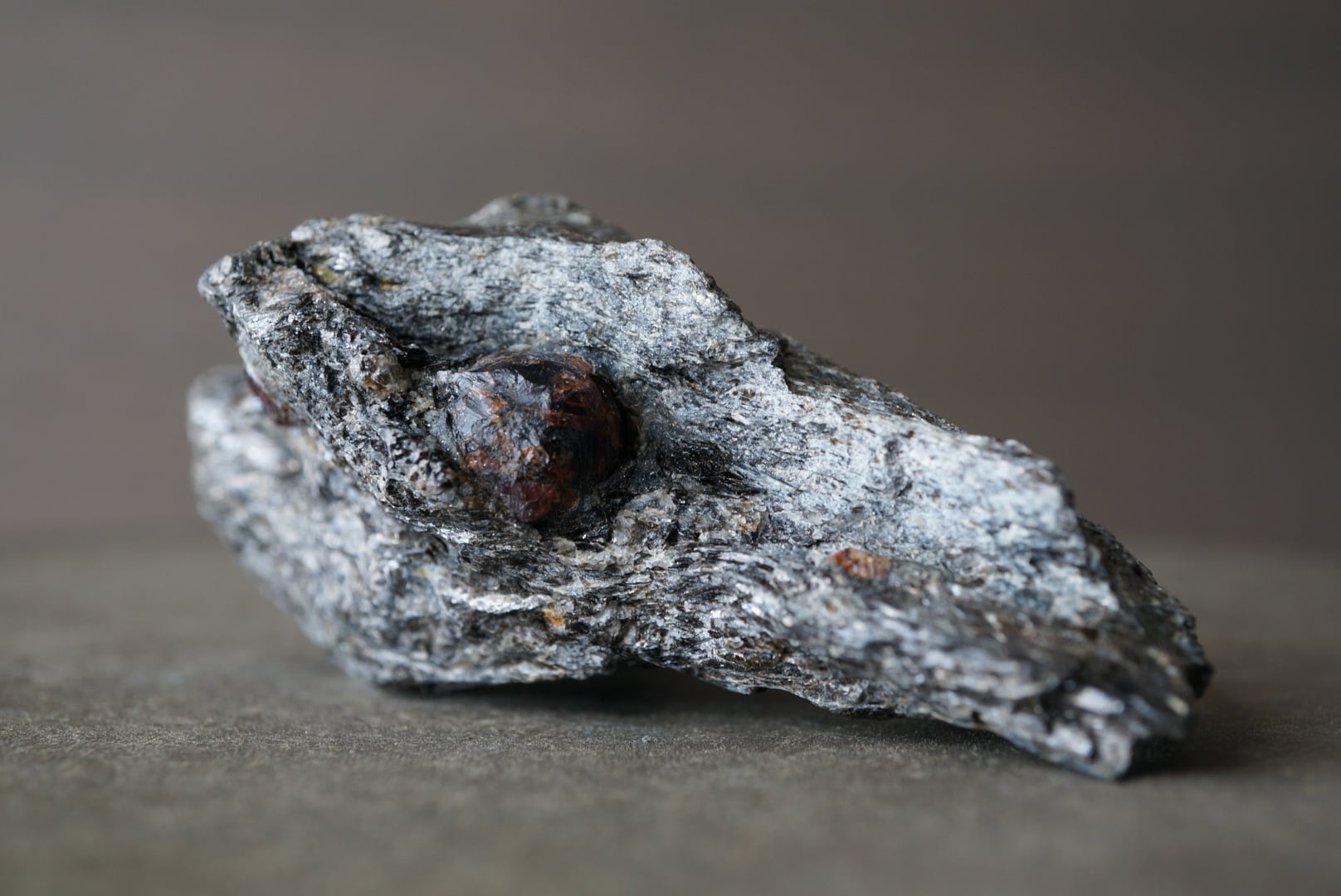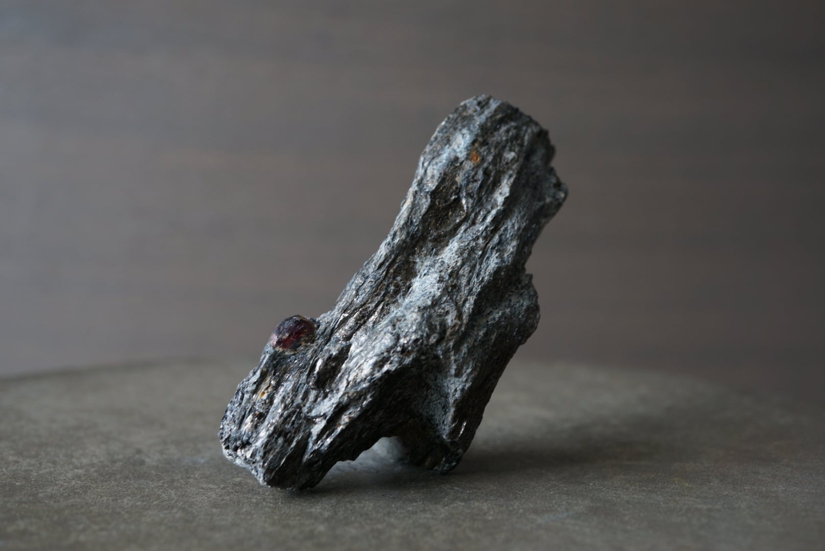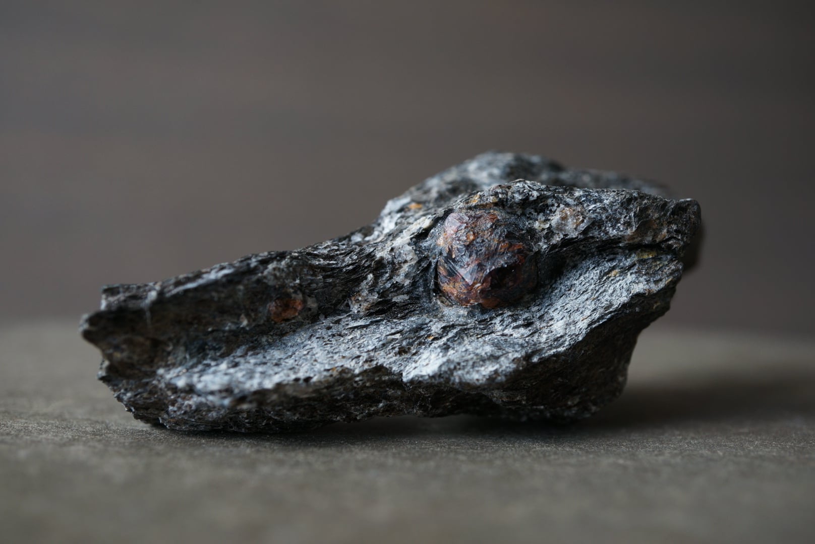 赤褐色のガーネットは、母岩に取り込まれた「核」のような存在感があり、全体の造形に静かな緊張感を与えています。