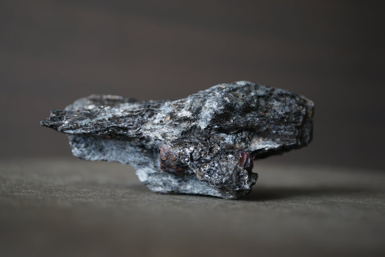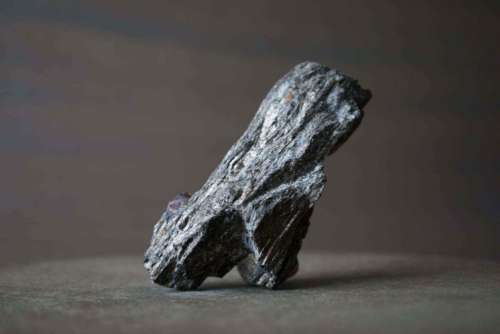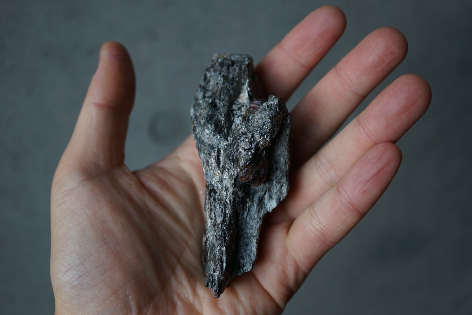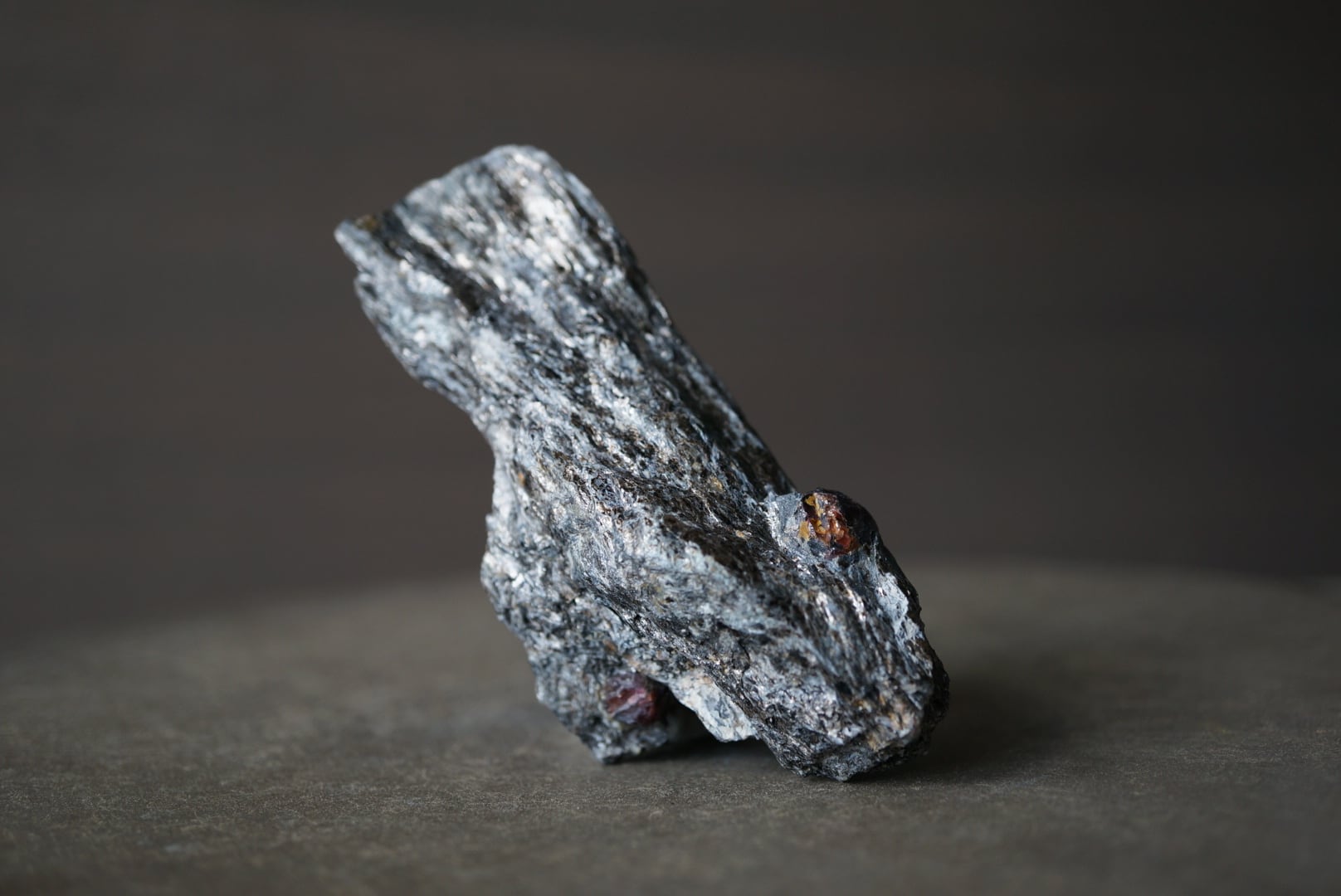 灰色〜銀色の鈍い光沢を放つバイオタイト(雲母)の母岩は、不均一な起伏を持ち、風化した古木の一部や、乾いた骨の内部構造を思わせる有機的な風合いです。