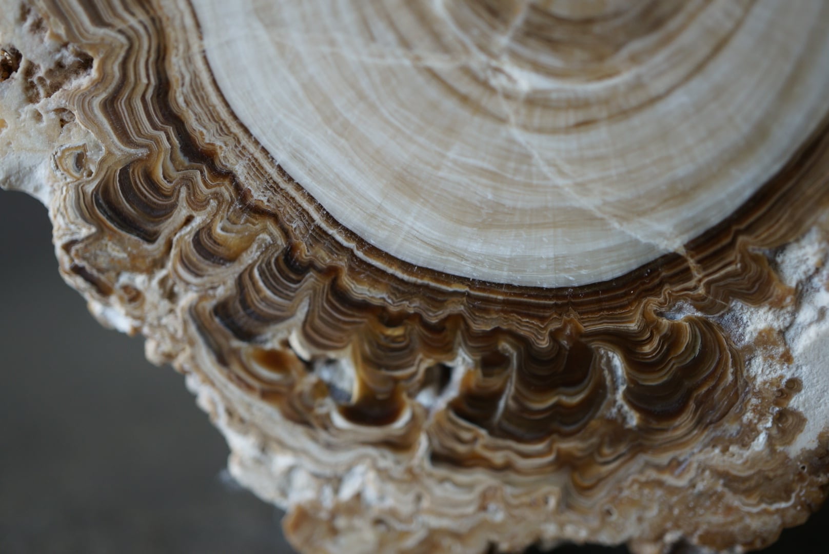 乳白、飴色、焦げ茶が重なり合う様子は、時間が円を描くように、洞窟内で静かに続いてきた堆積の記録です。
