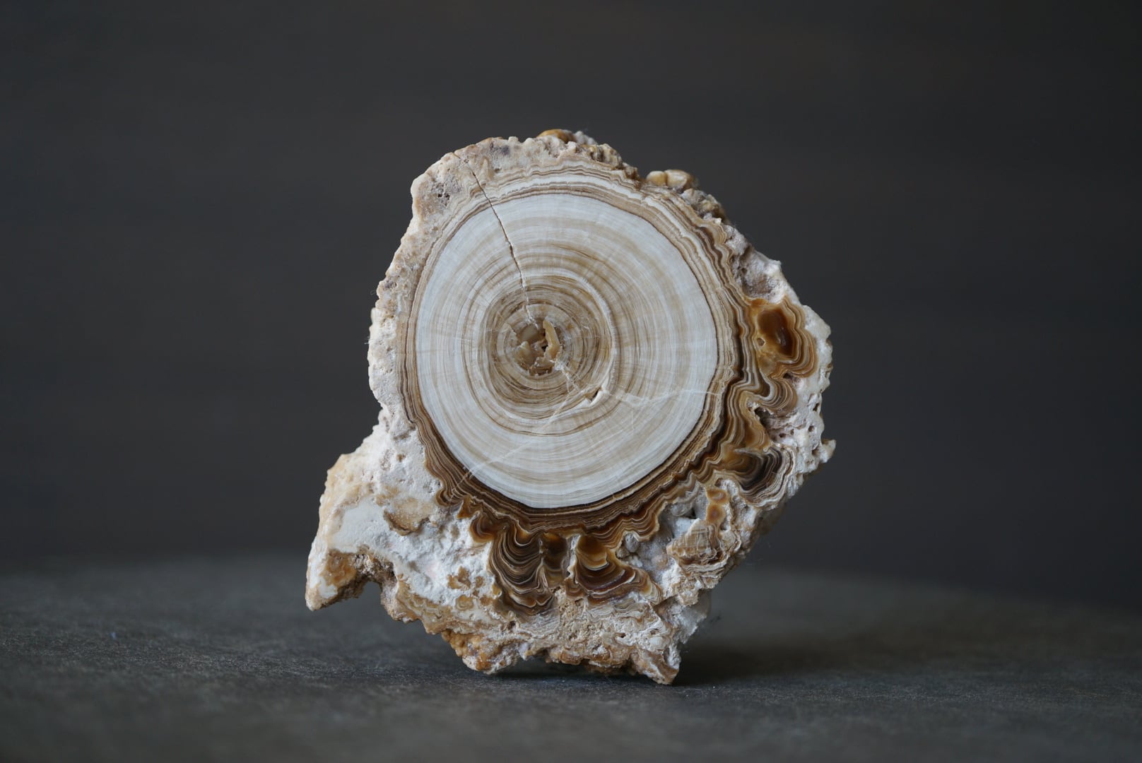 モロッコ中部 アヤチ山地で採取された「Cave Popcorn」とも呼ばれる鍾乳石の一種で、断面を磨くとまるで樹木の年輪のような縞模様が現れます。