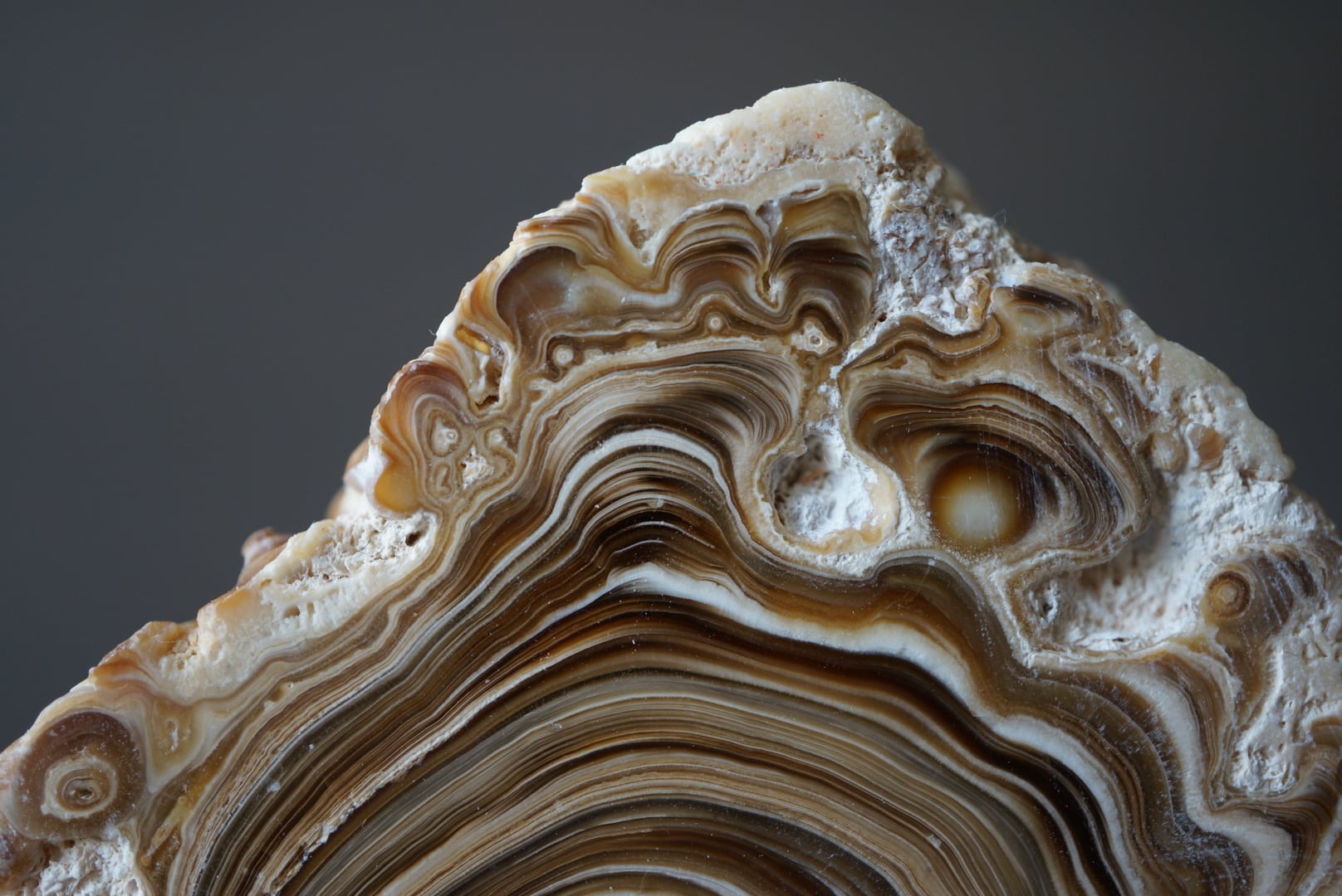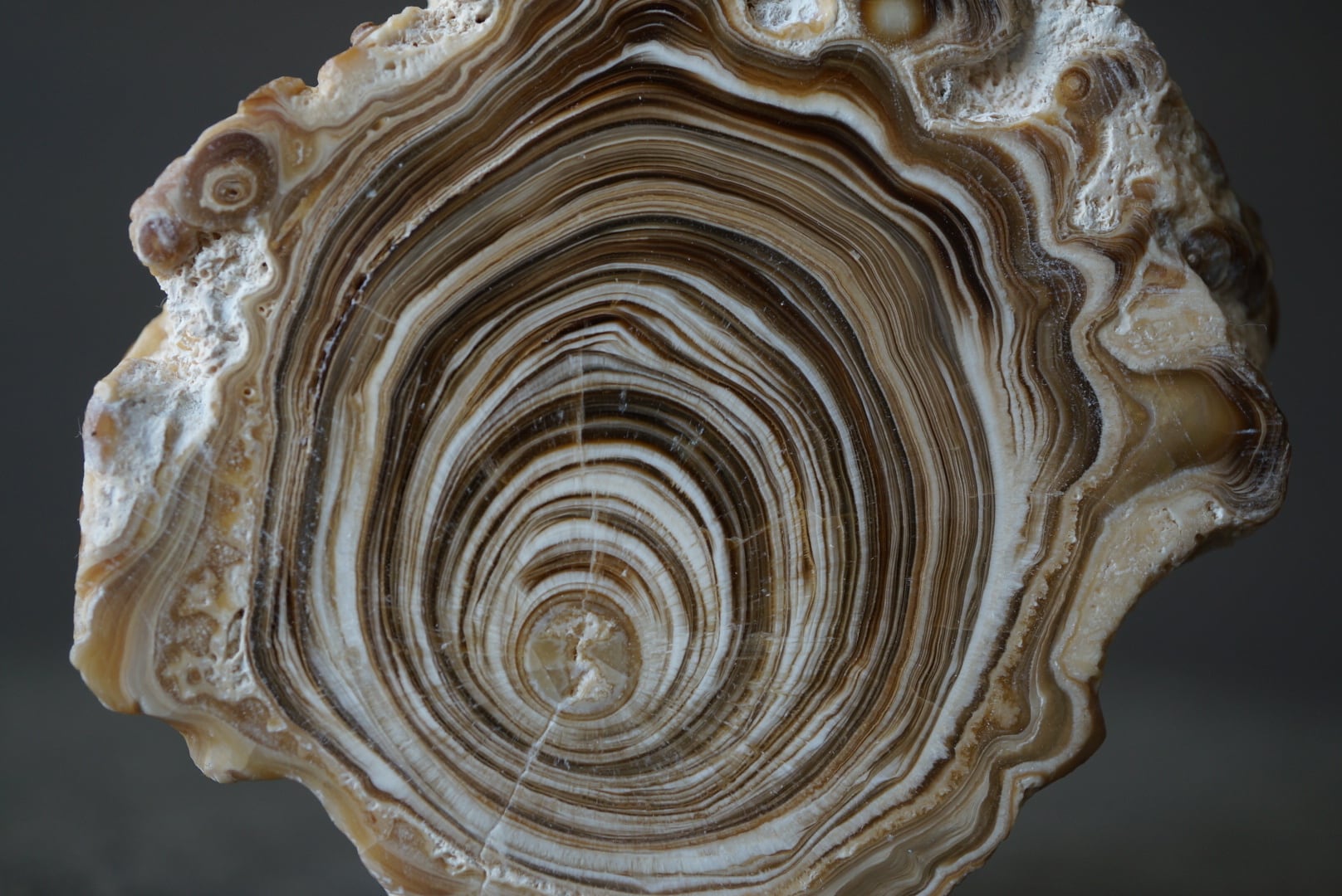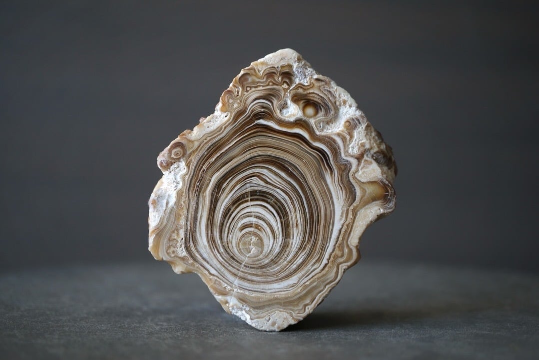 モロッコ中部 アヤチ山地で採取された「Cave Popcorn」とも呼ばれる鍾乳石の一種で、断面を磨くとまるで樹木の年輪のような縞模様が現れます。