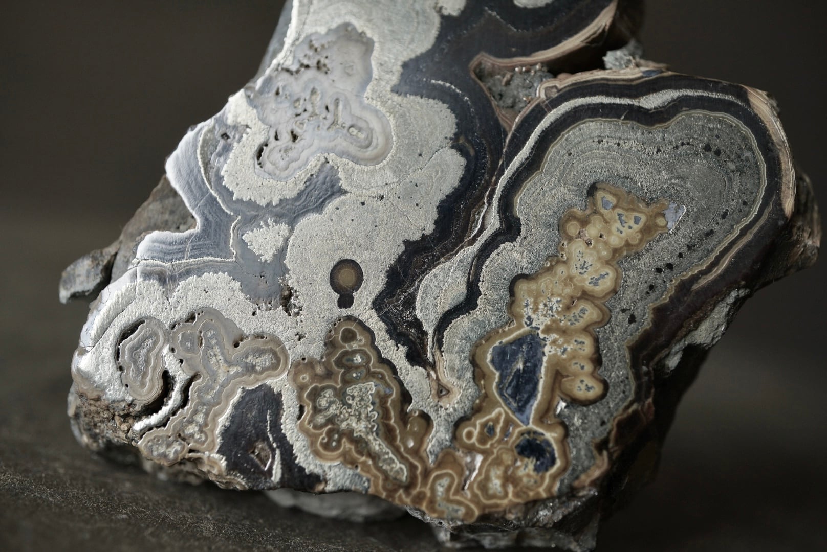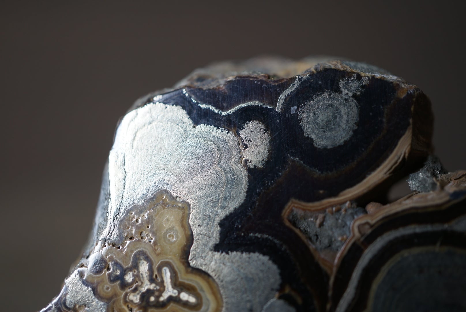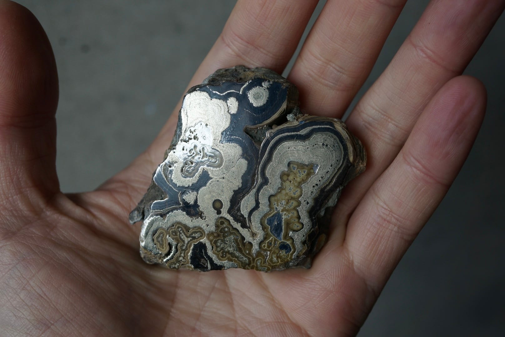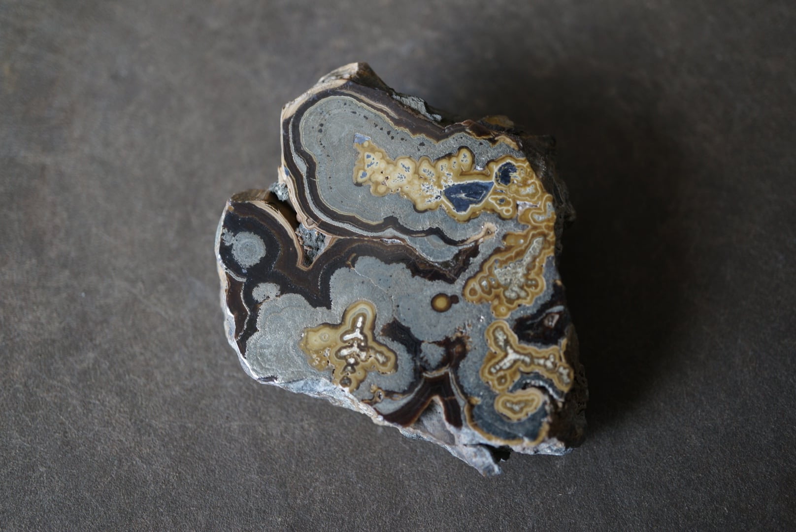 切断・研磨された断面には、ベージュから黄褐色、金属光沢を帯びた銀色、黒色までが複雑に重なり合い、この石特有の美しい縞模様が現れています。