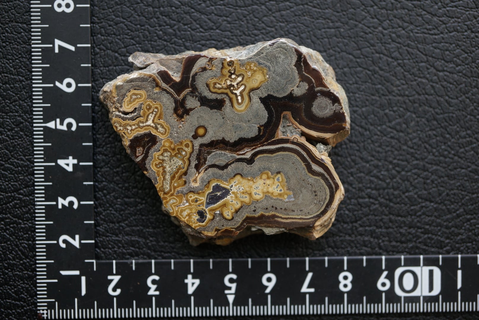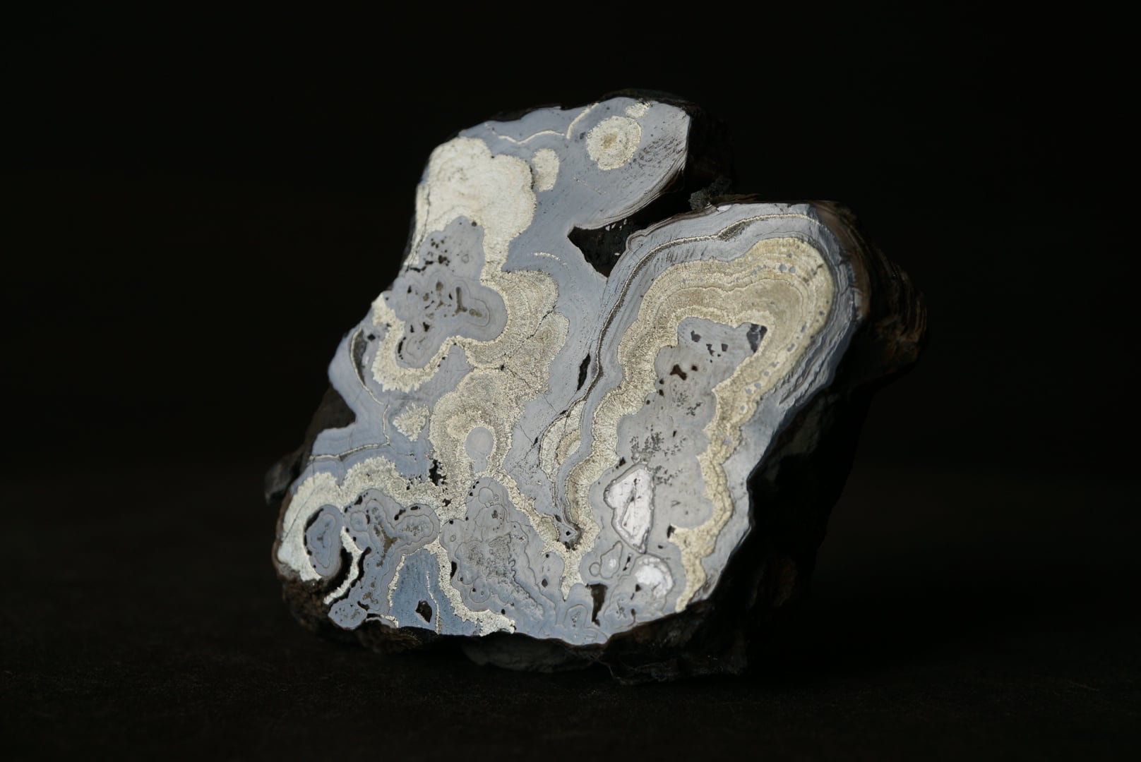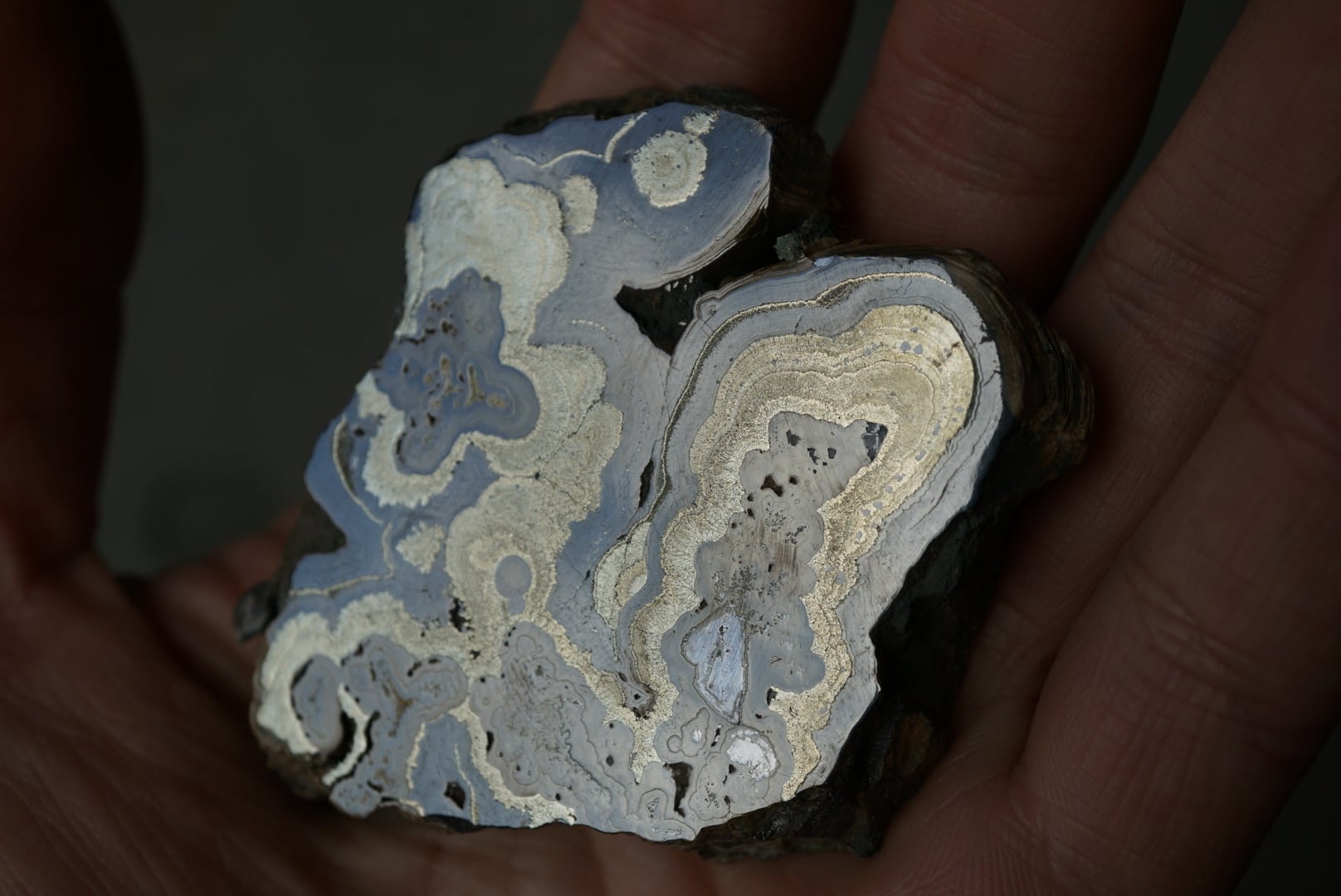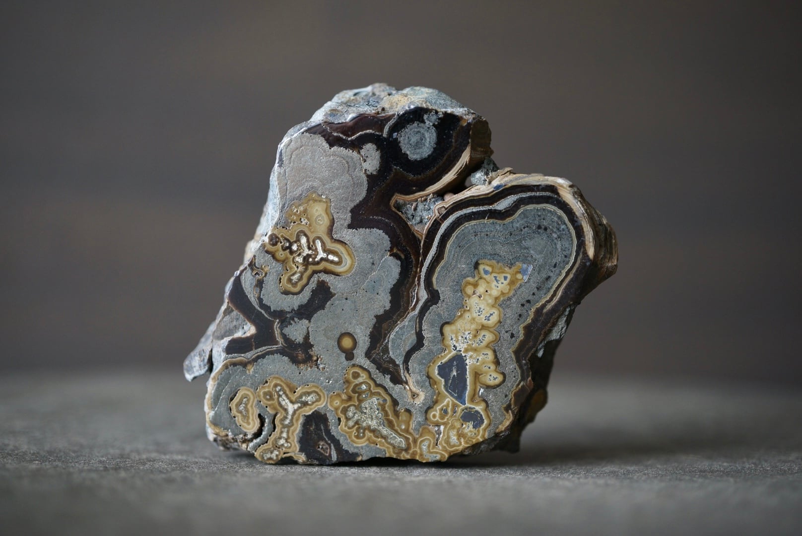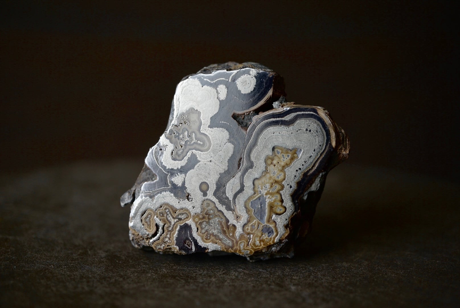 切断・研磨された断面には、ベージュから黄褐色、金属光沢を帯びた銀色、黒色までが複雑に重なり合い、この石特有の美しい縞模様が現れています。