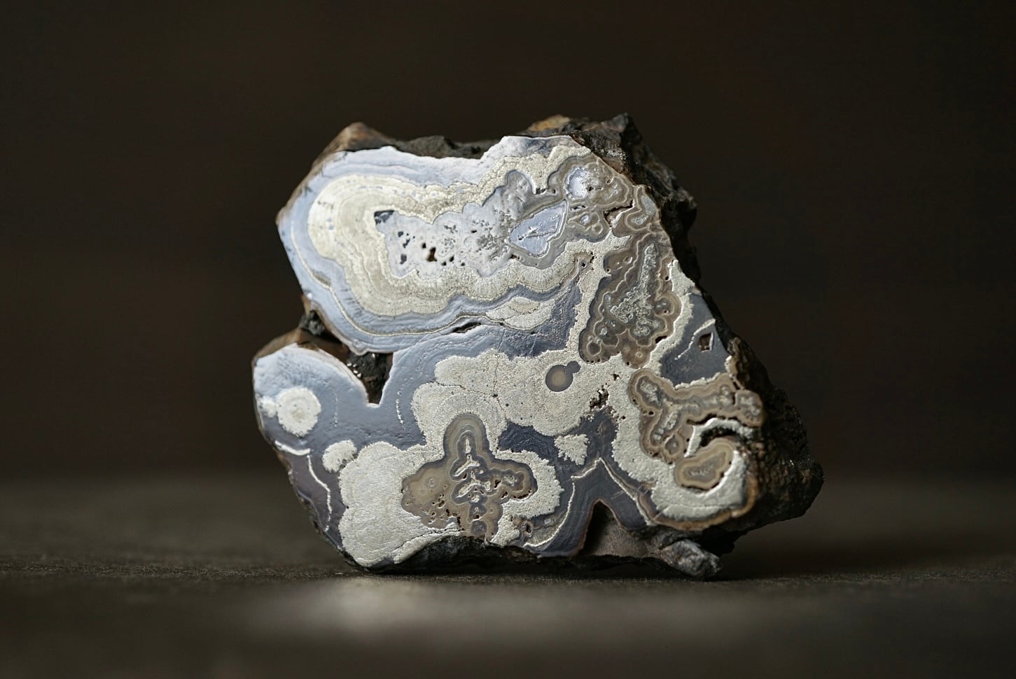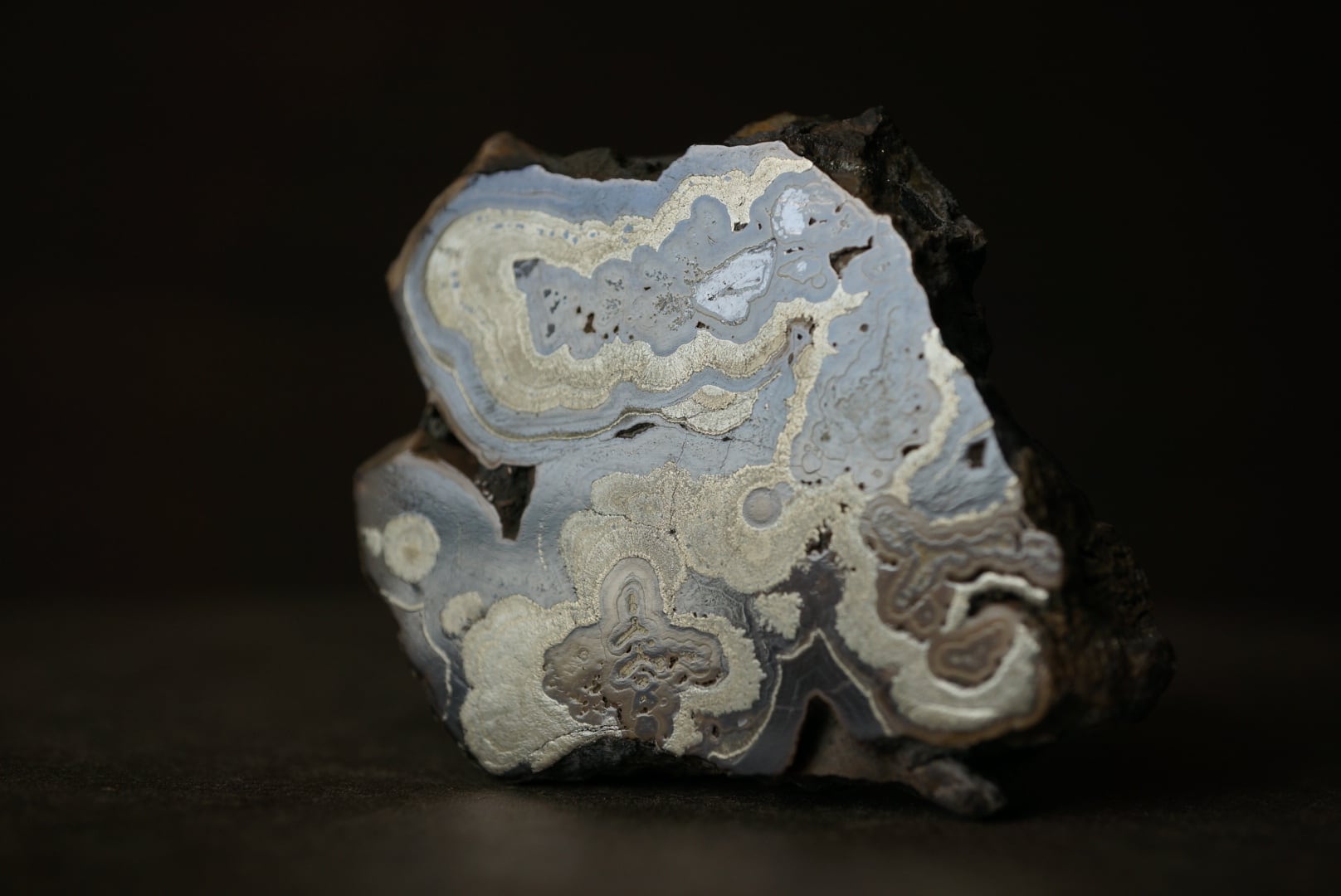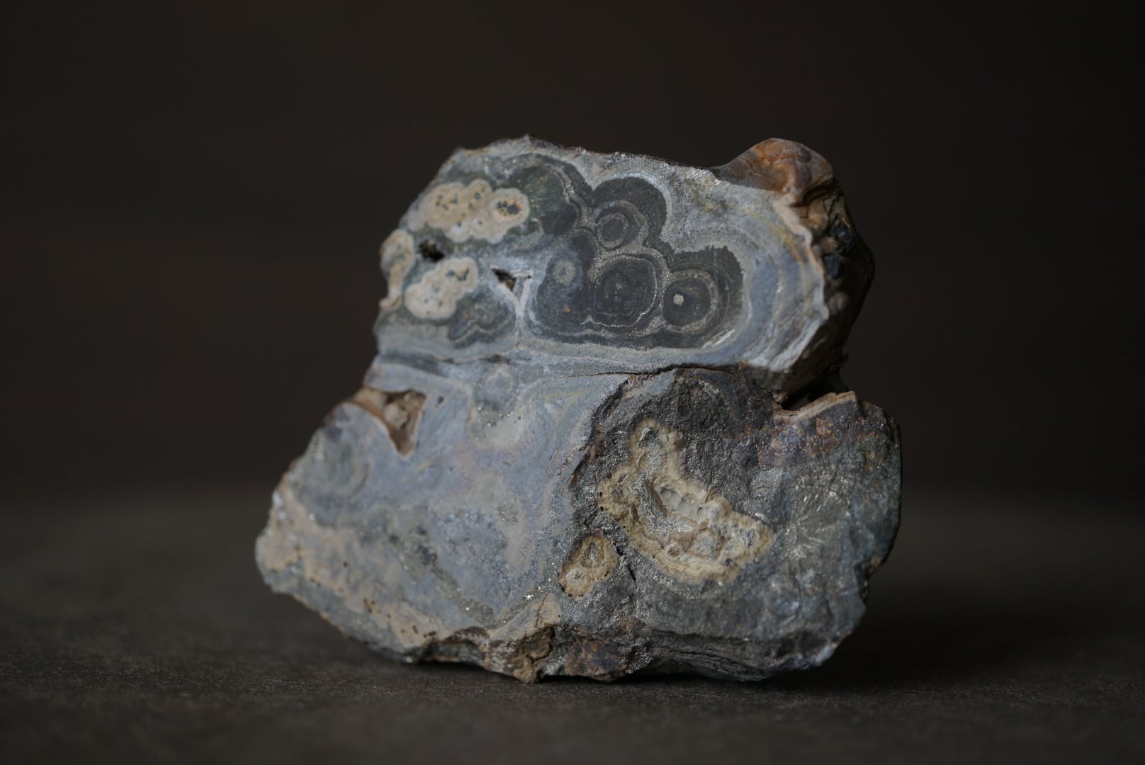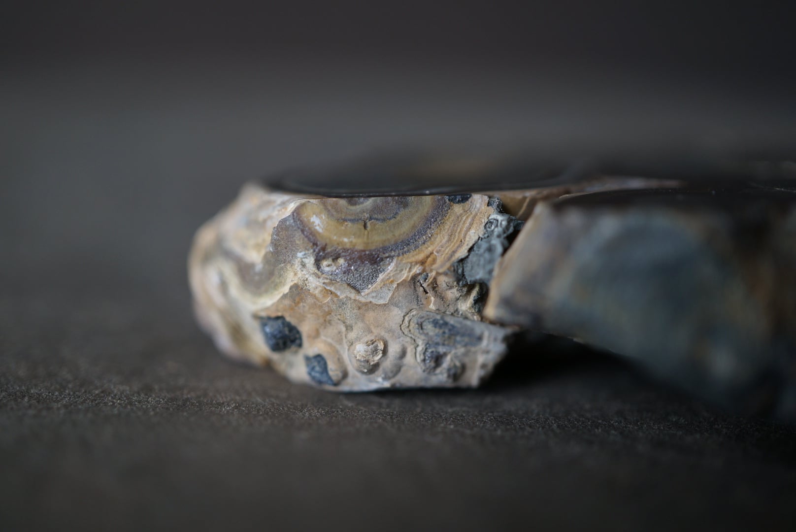 切断・研磨された断面には、ベージュから黄褐色、金属光沢を帯びた銀色、黒色までが複雑に重なり合い、この石特有の美しい縞模様が現れています。