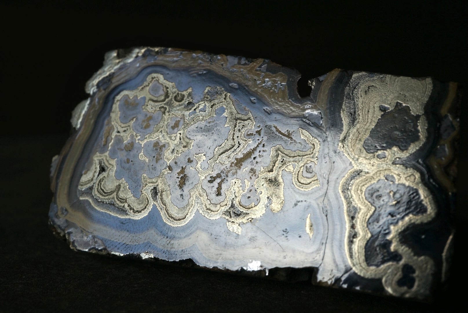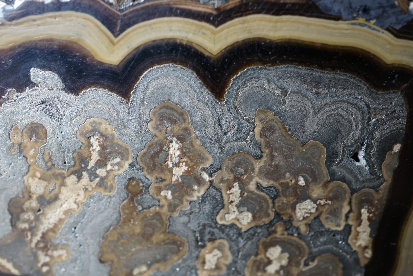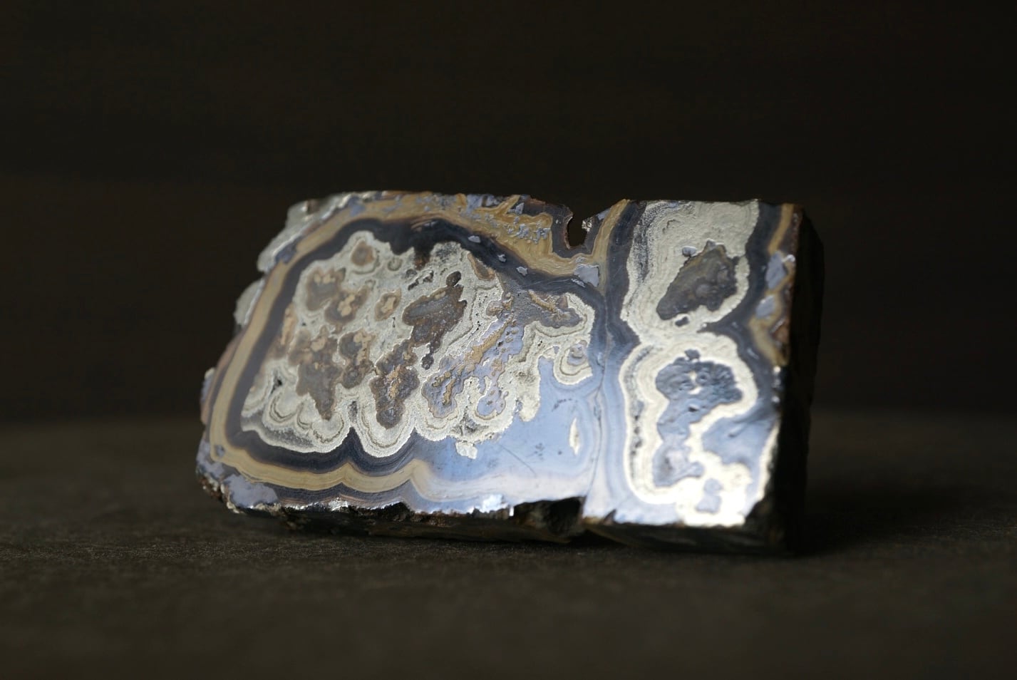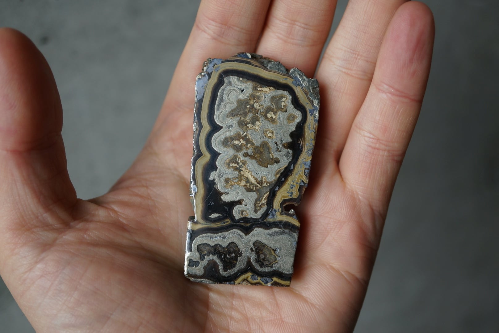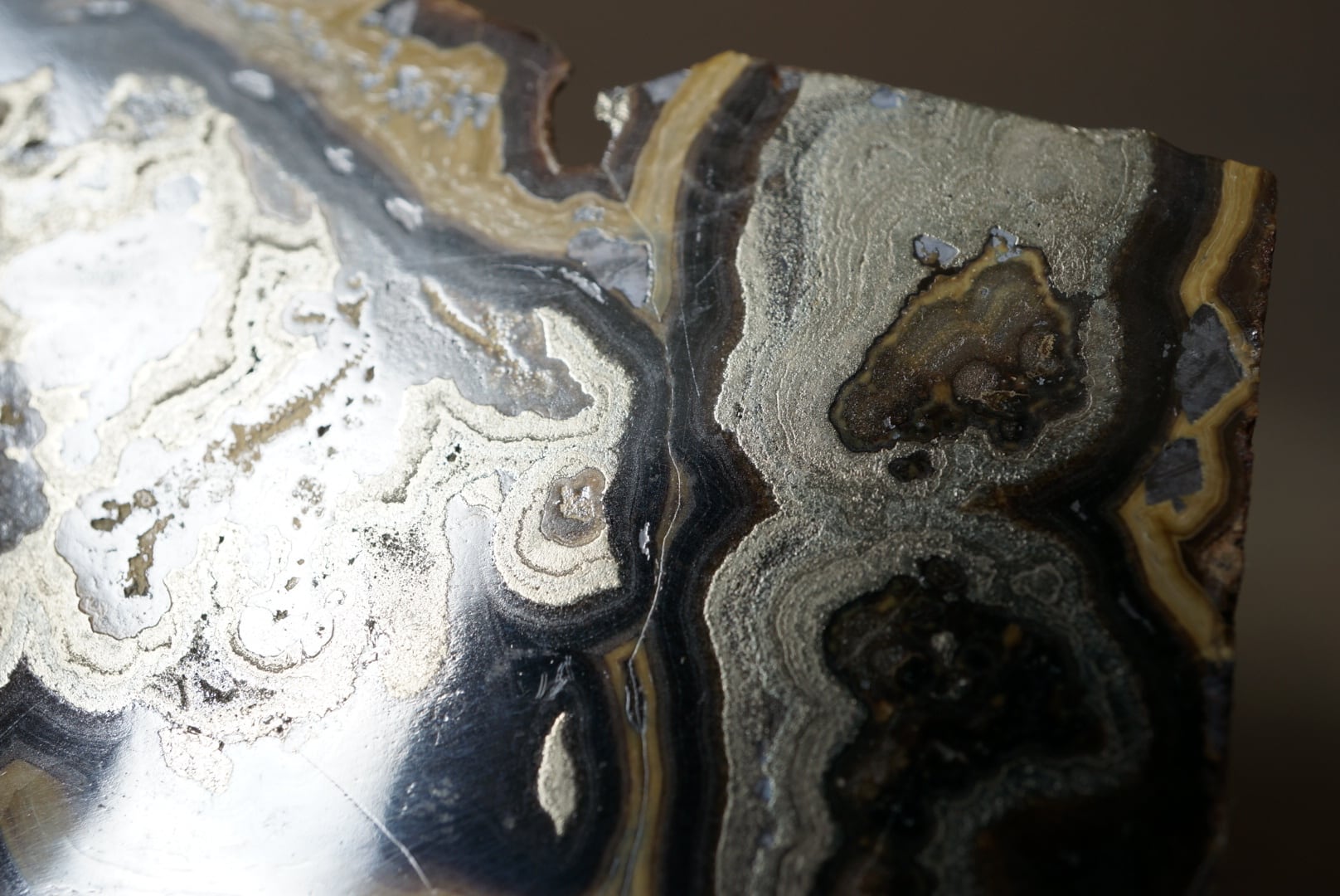 切断・研磨された断面には、ベージュから黄褐色、金属光沢を帯びた銀色、黒色までが複雑に重なり合い、この石特有の美しい縞模様が現れています。