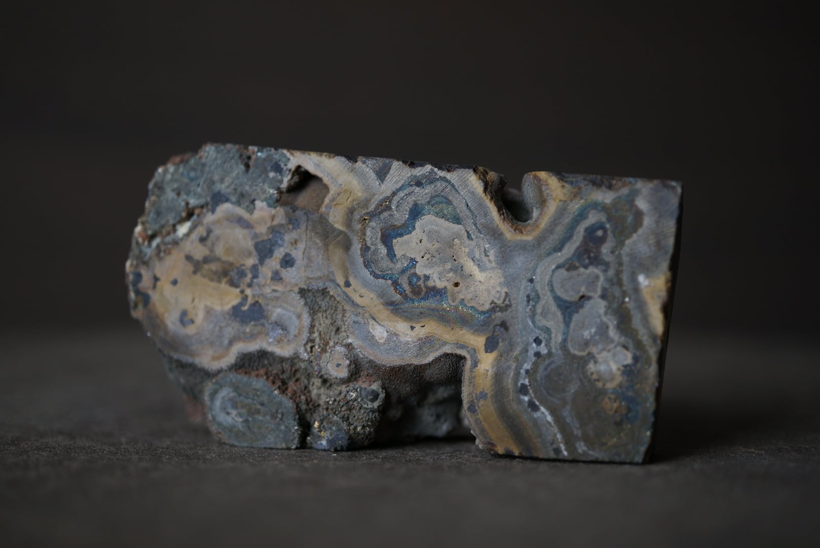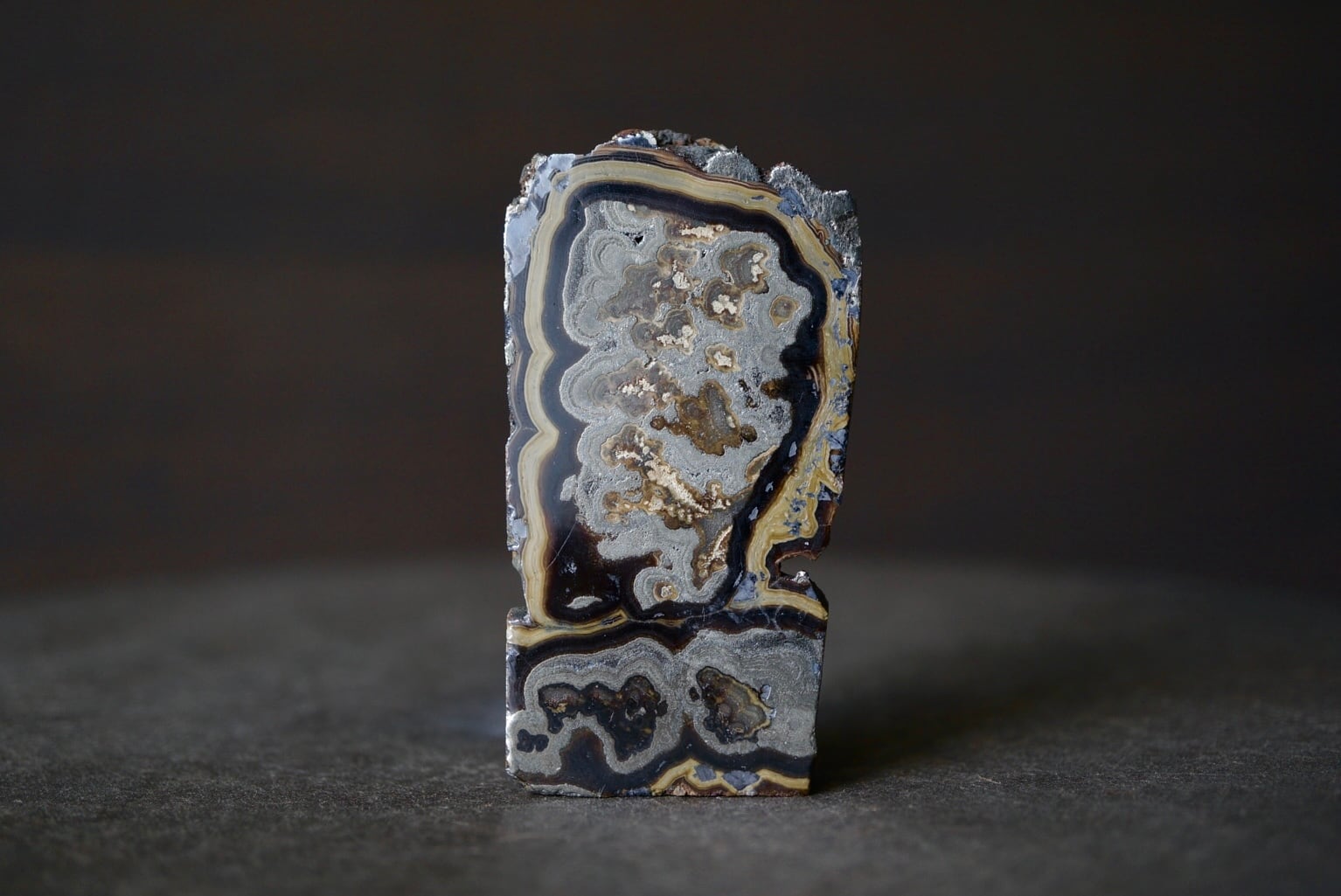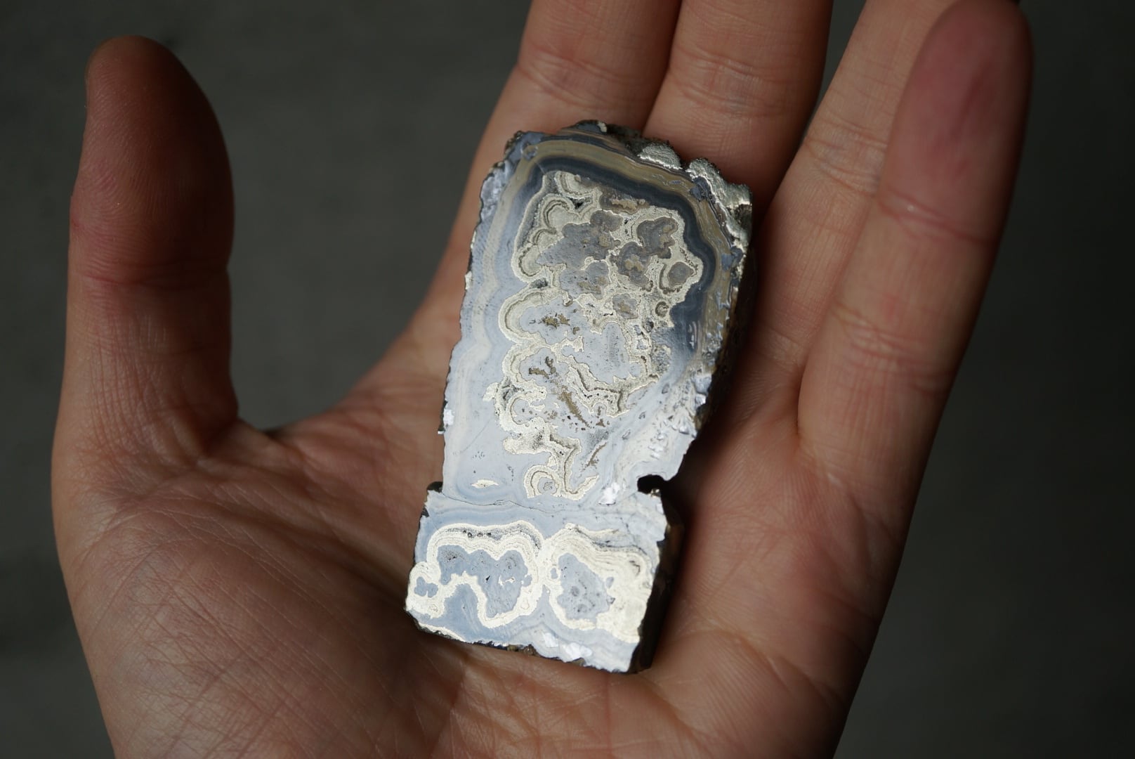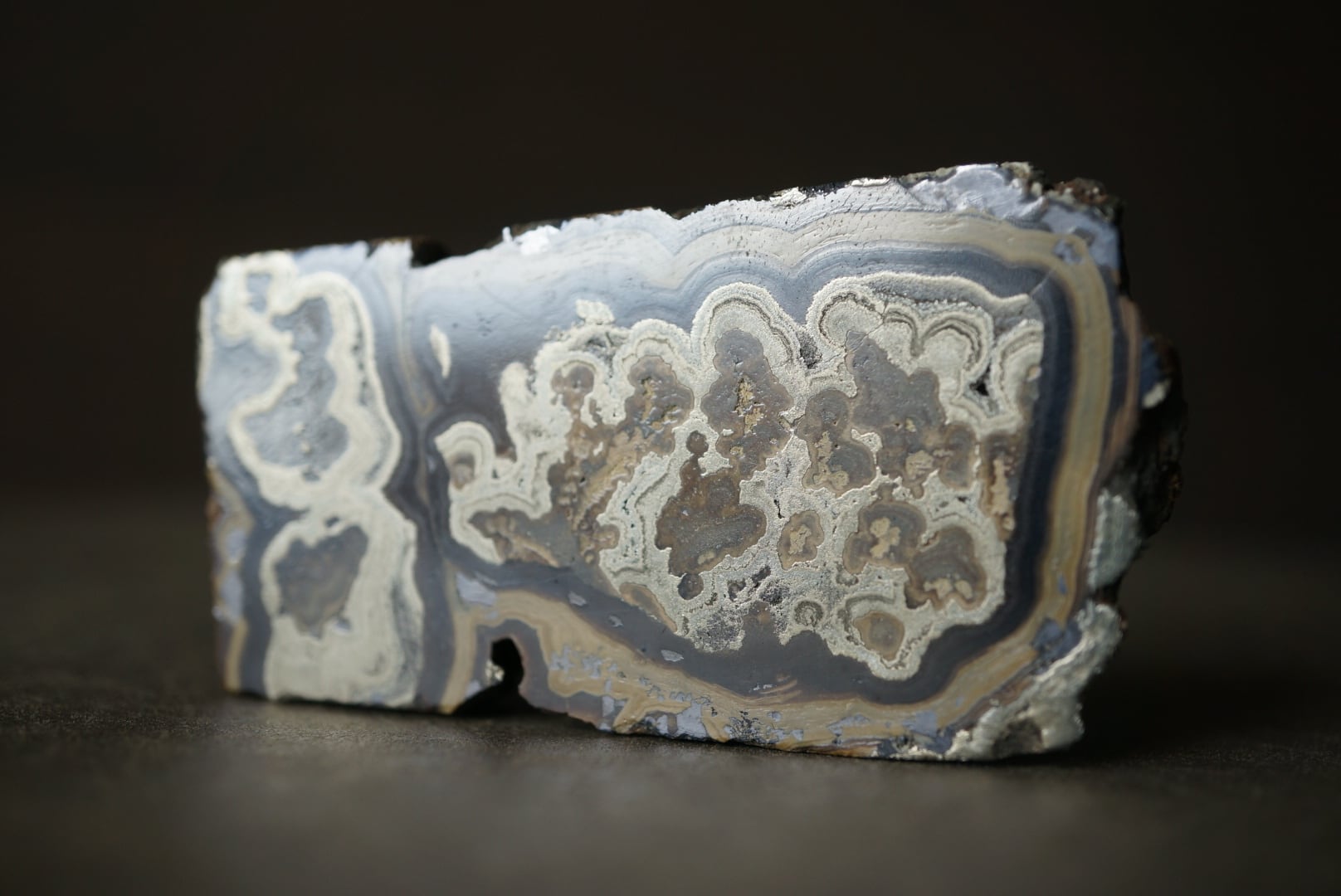 切断・研磨された断面には、ベージュから黄褐色、金属光沢を帯びた銀色、黒色までが複雑に重なり合い、この石特有の美しい縞模様が現れています。