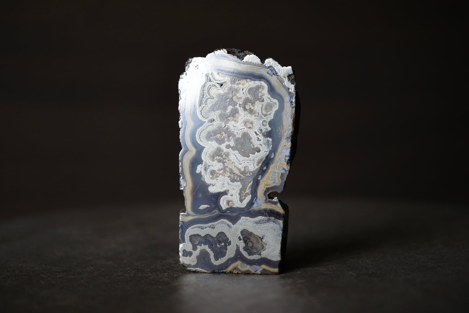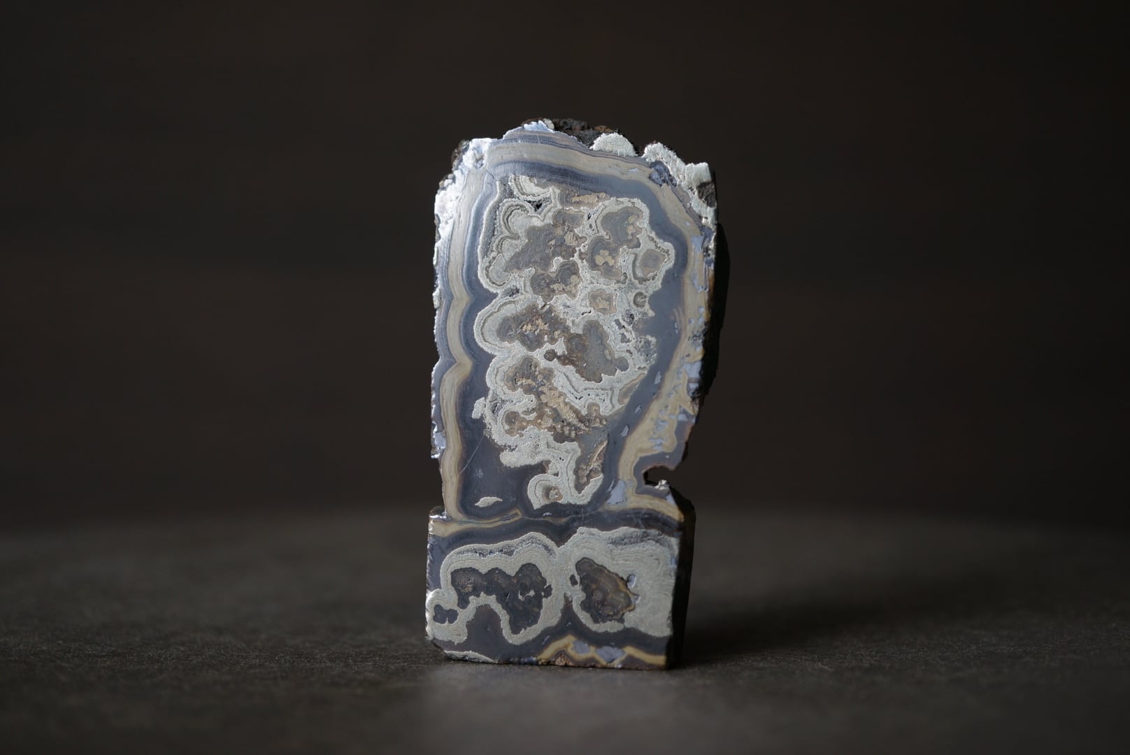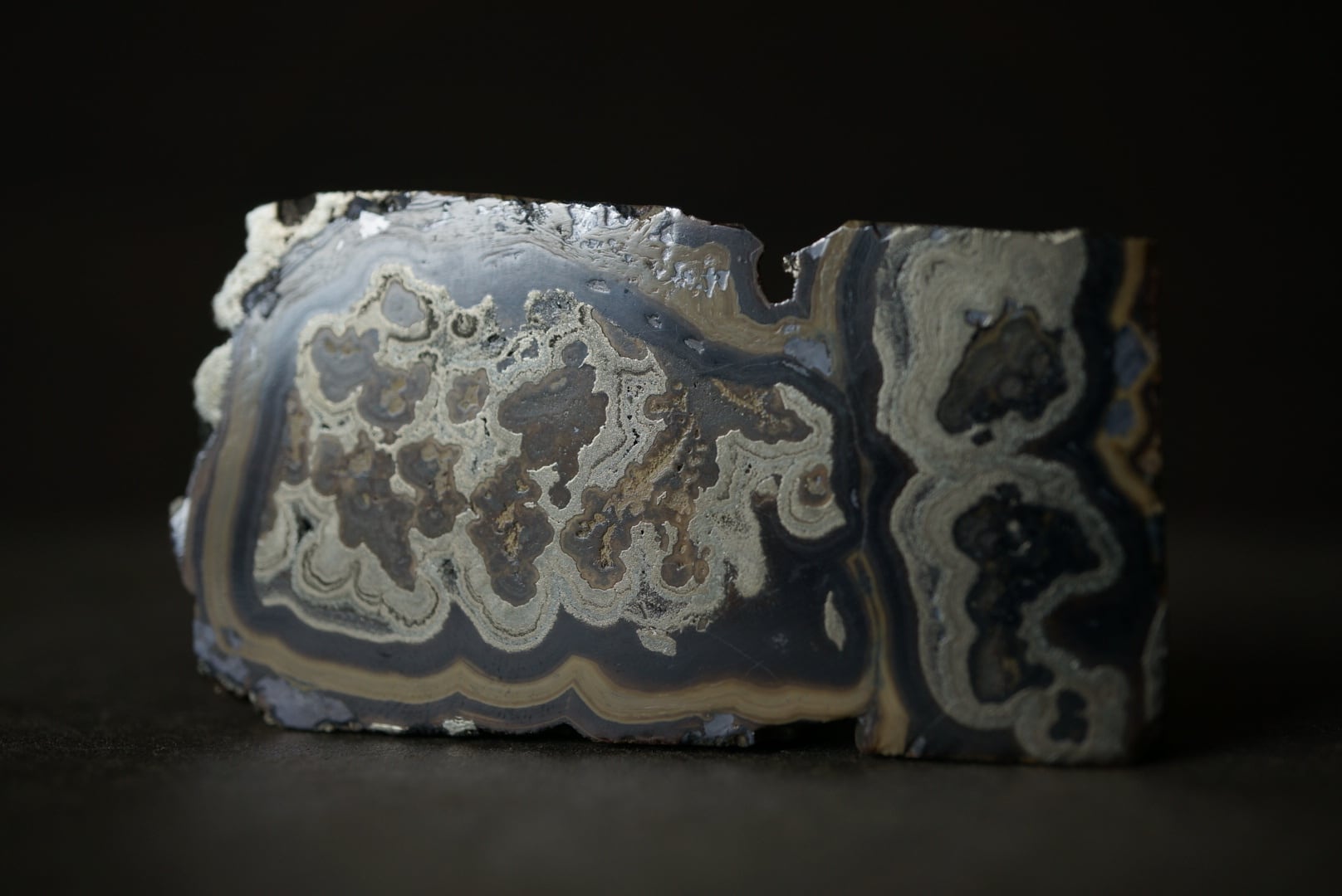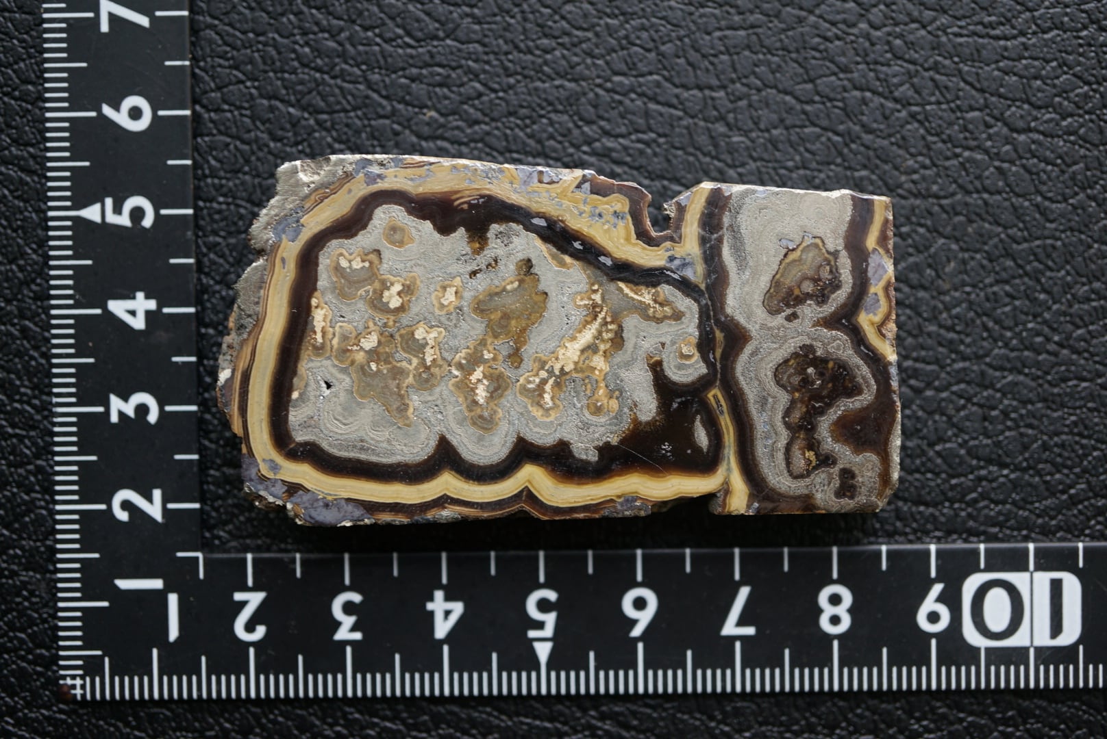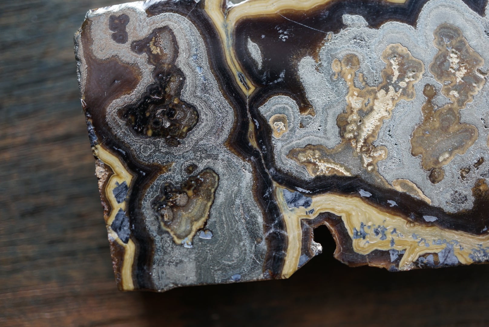 切断・研磨された断面には、ベージュから黄褐色、金属光沢を帯びた銀色、黒色までが複雑に重なり合い、この石特有の美しい縞模様が現れています。