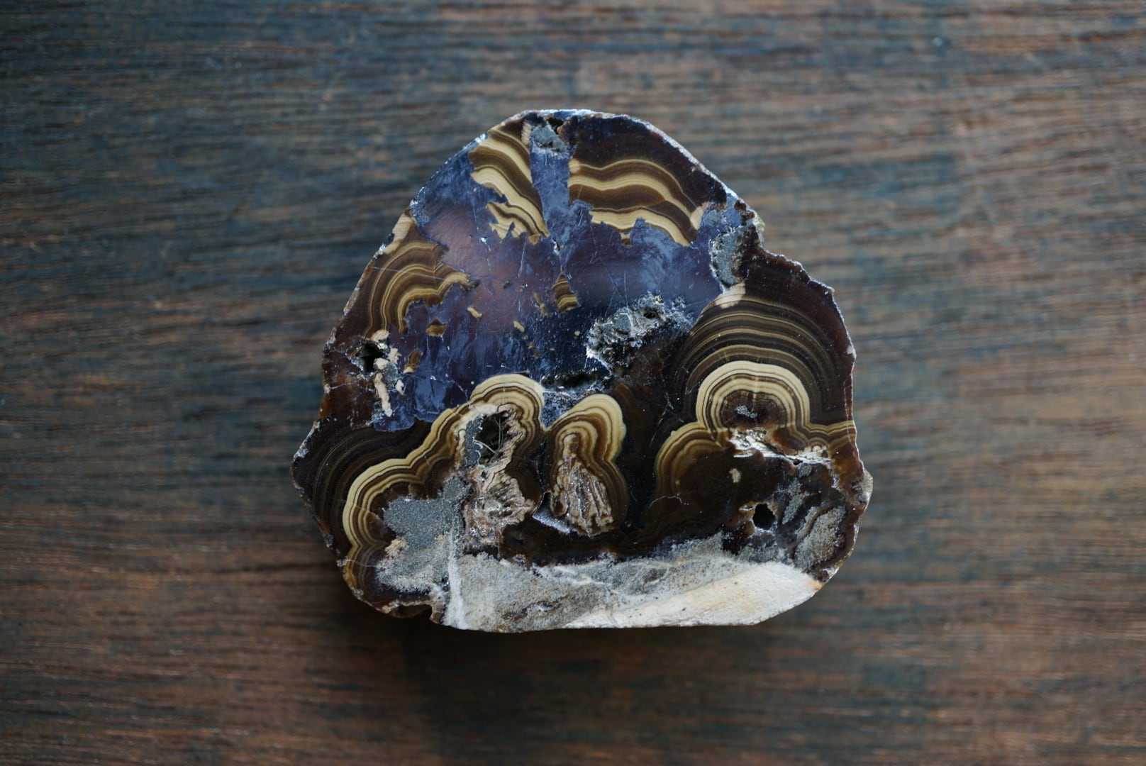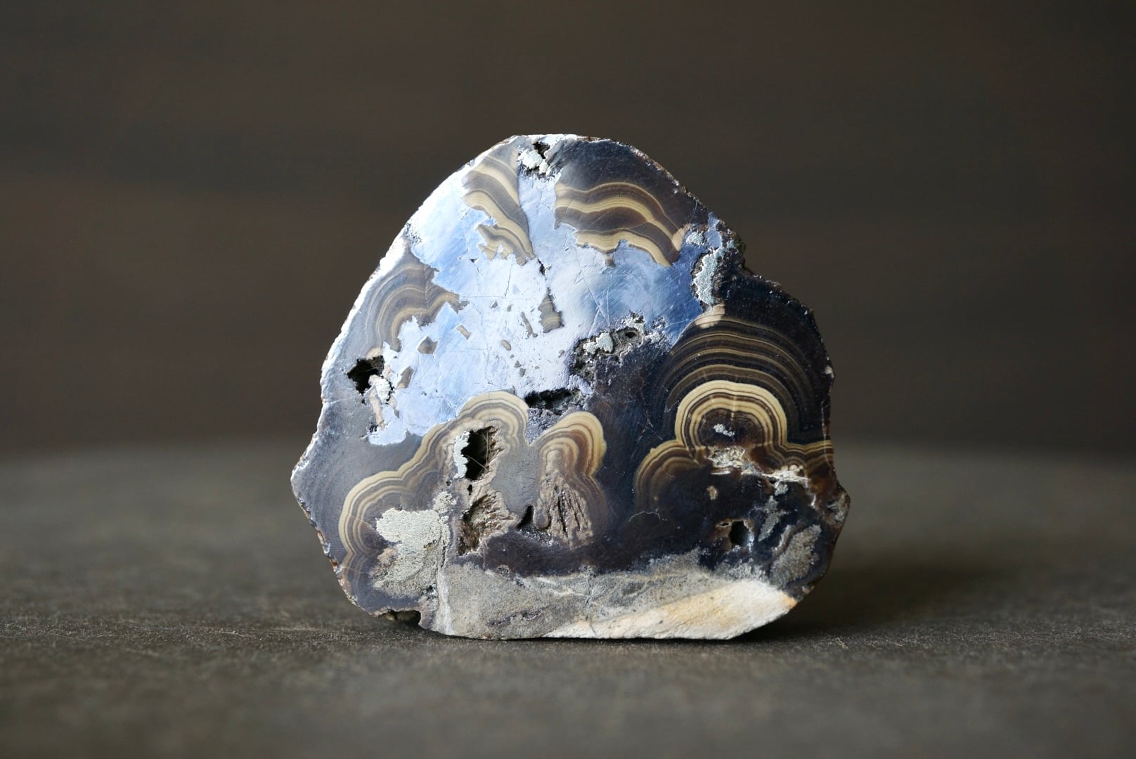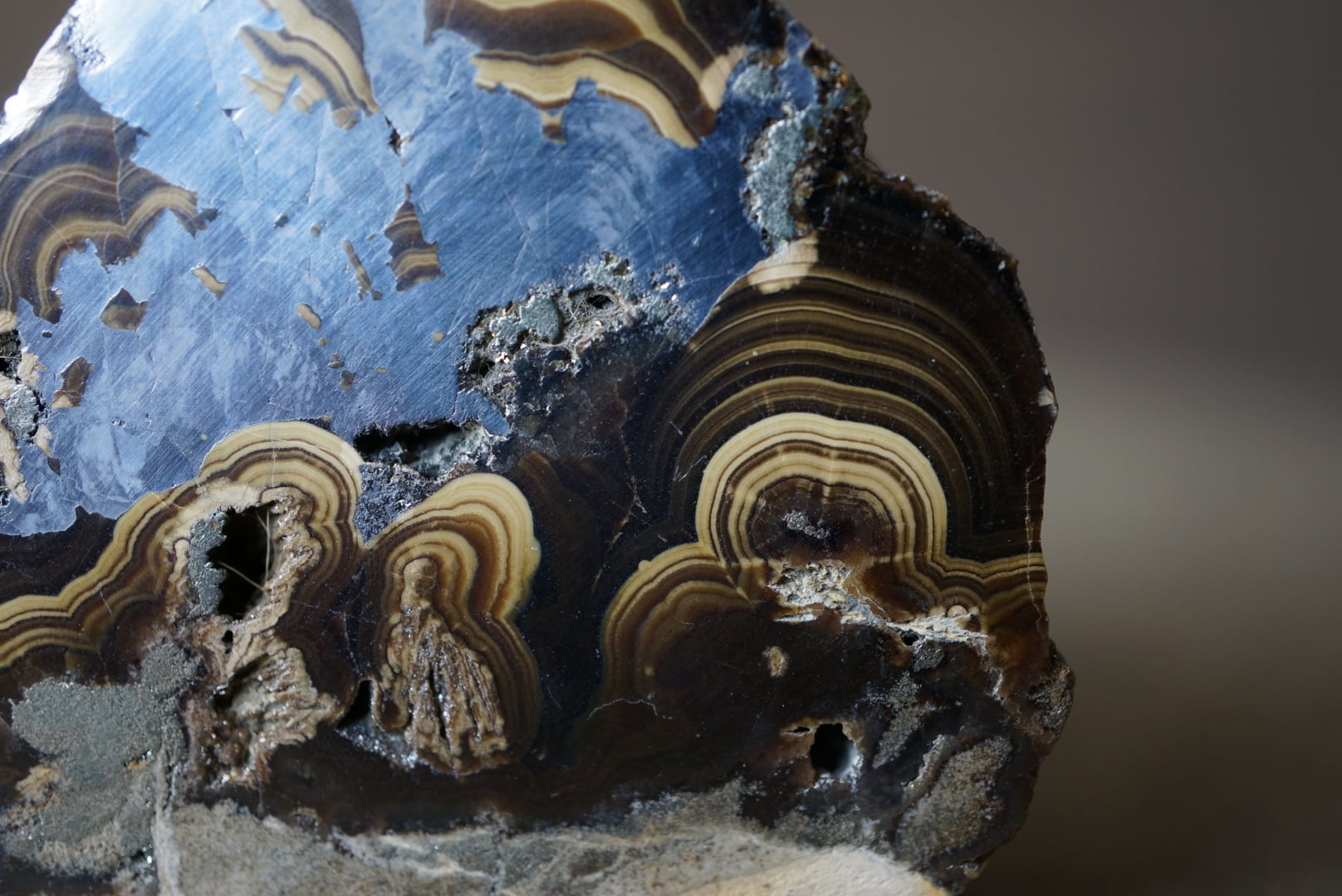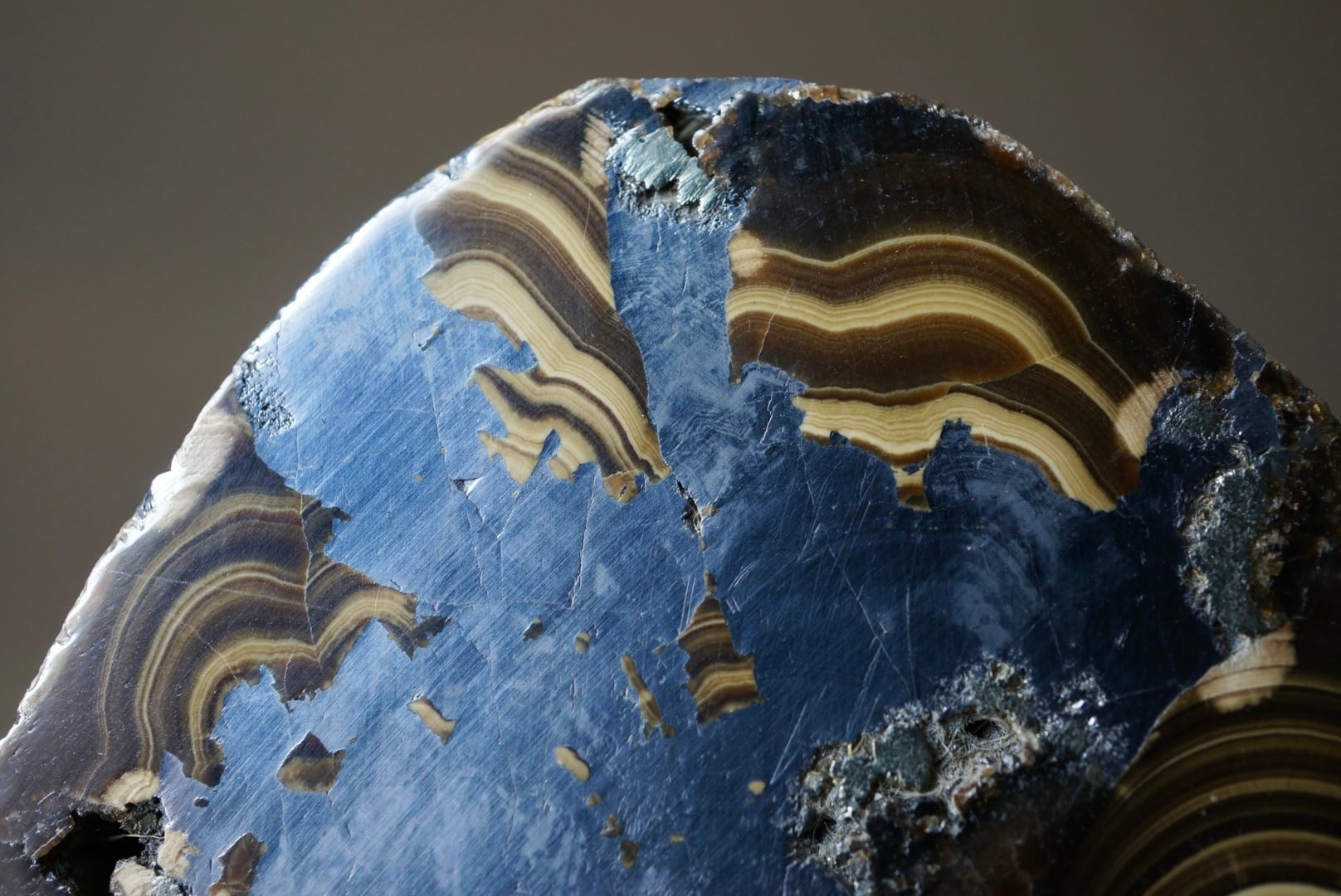 切断・研磨された断面には、ベージュから黄褐色、金属光沢を帯びた銀色、黒色までが複雑に重なり合い、この石特有の美しい縞模様が現れています。