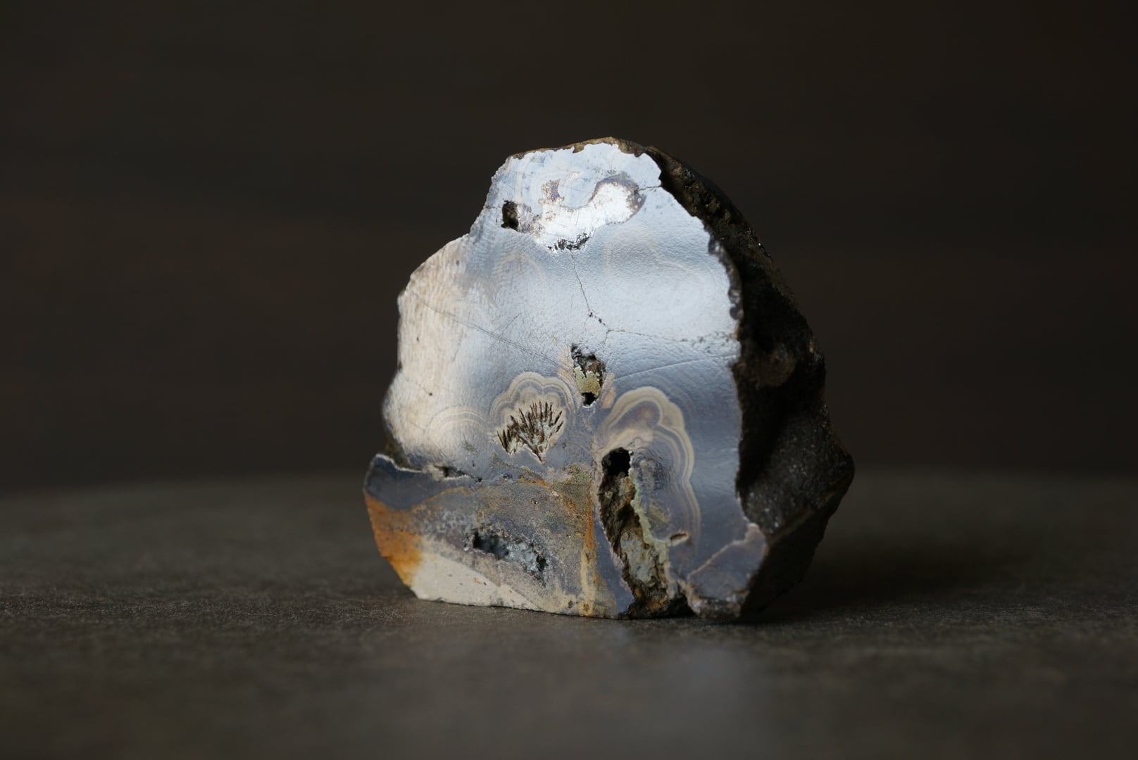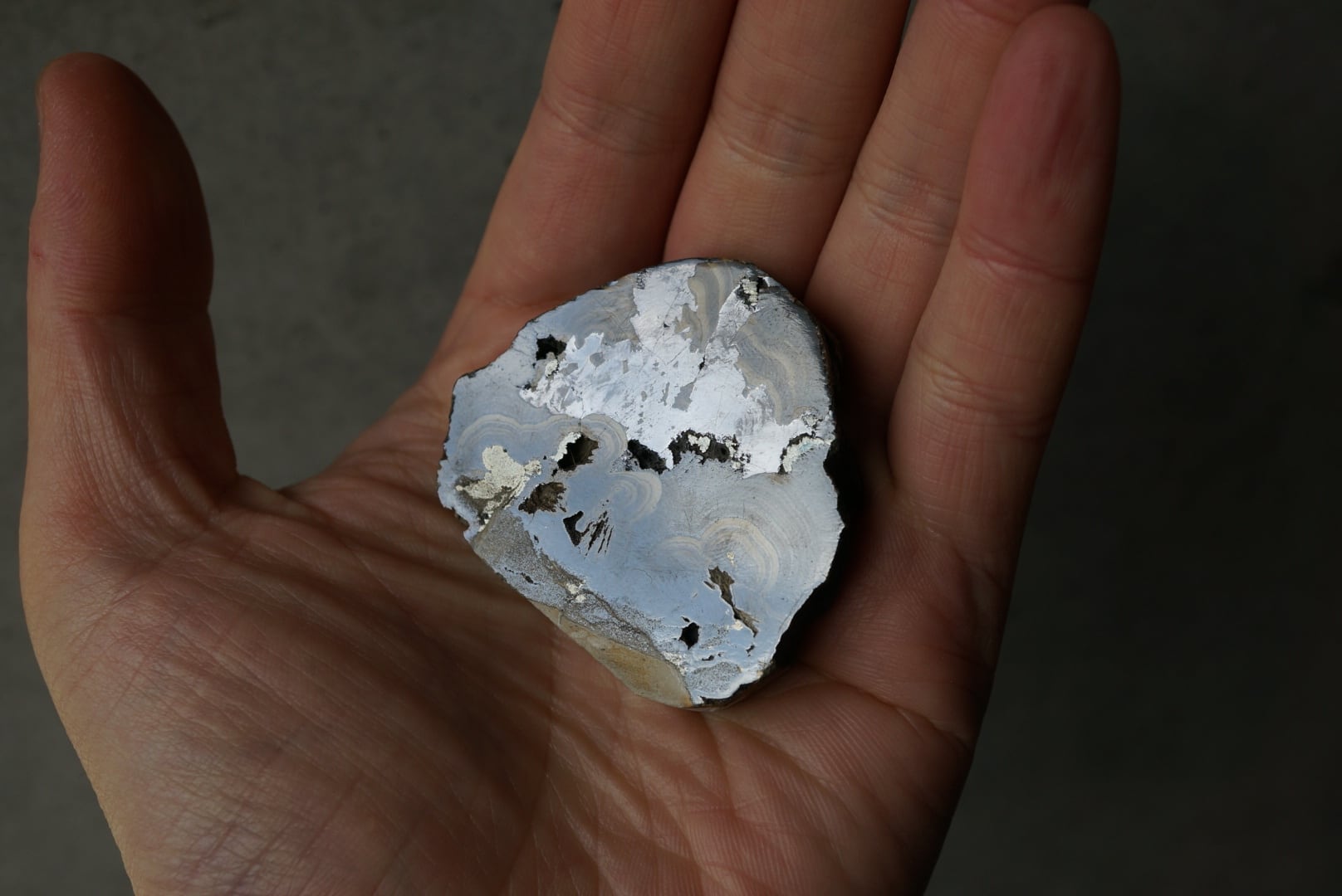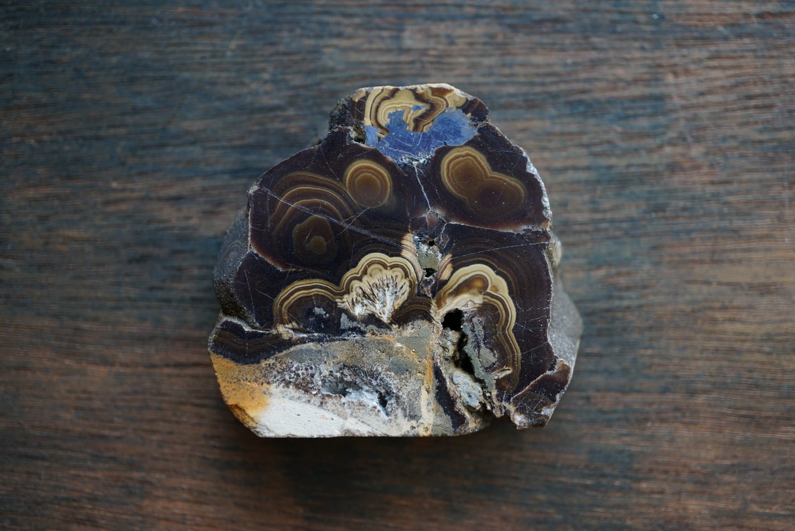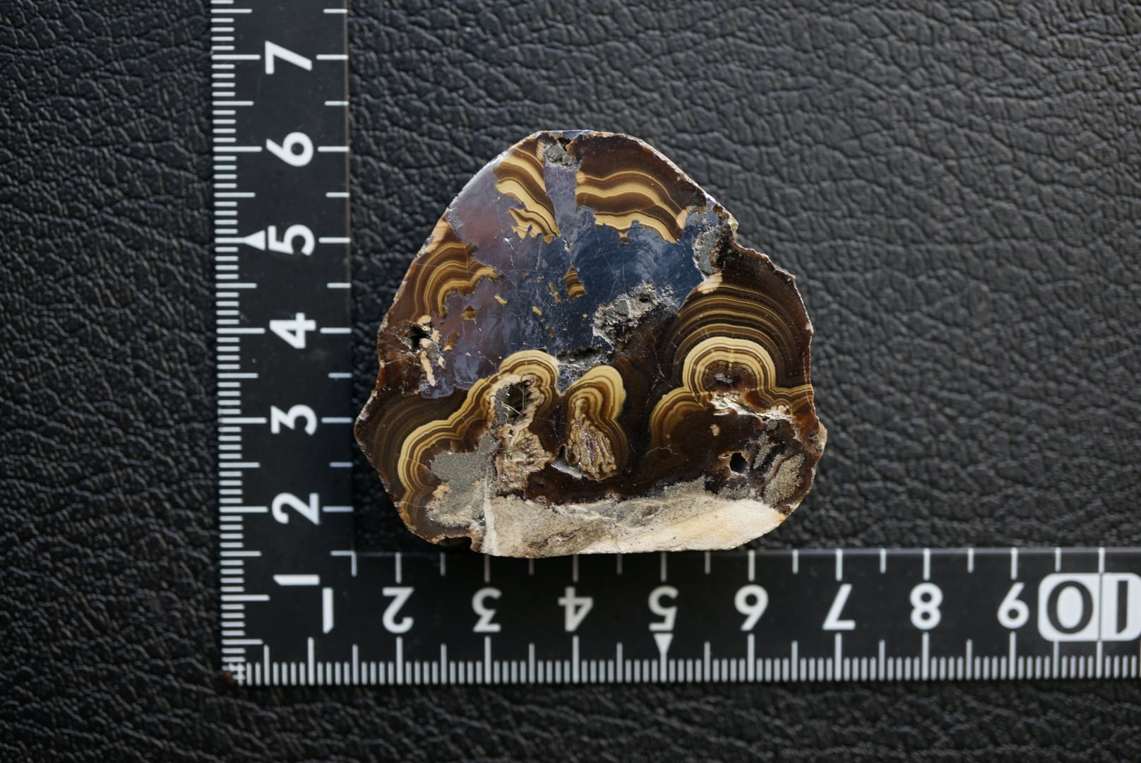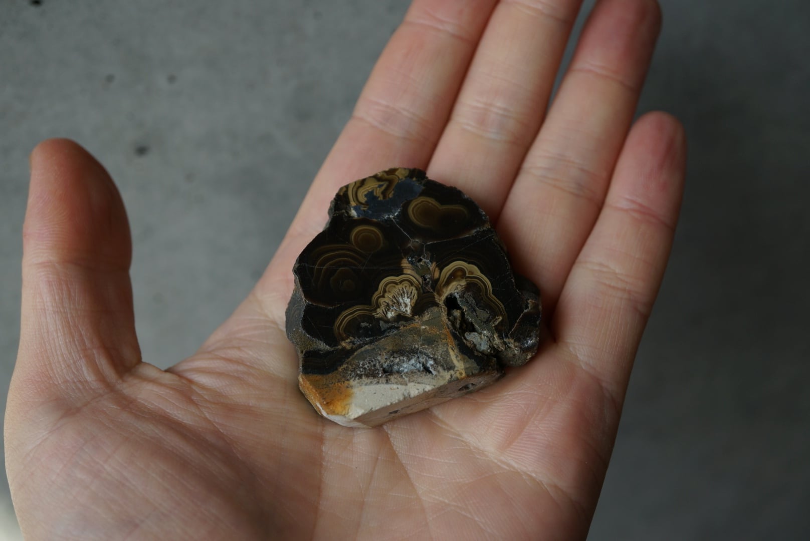 切断・研磨された断面には、ベージュから黄褐色、金属光沢を帯びた銀色、黒色までが複雑に重なり合い、この石特有の美しい縞模様が現れています。