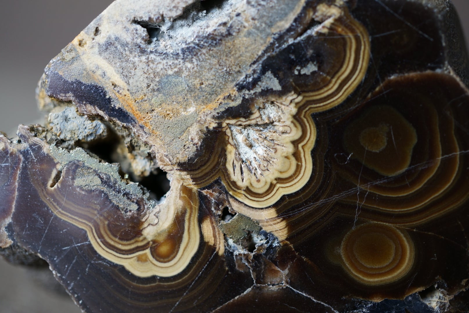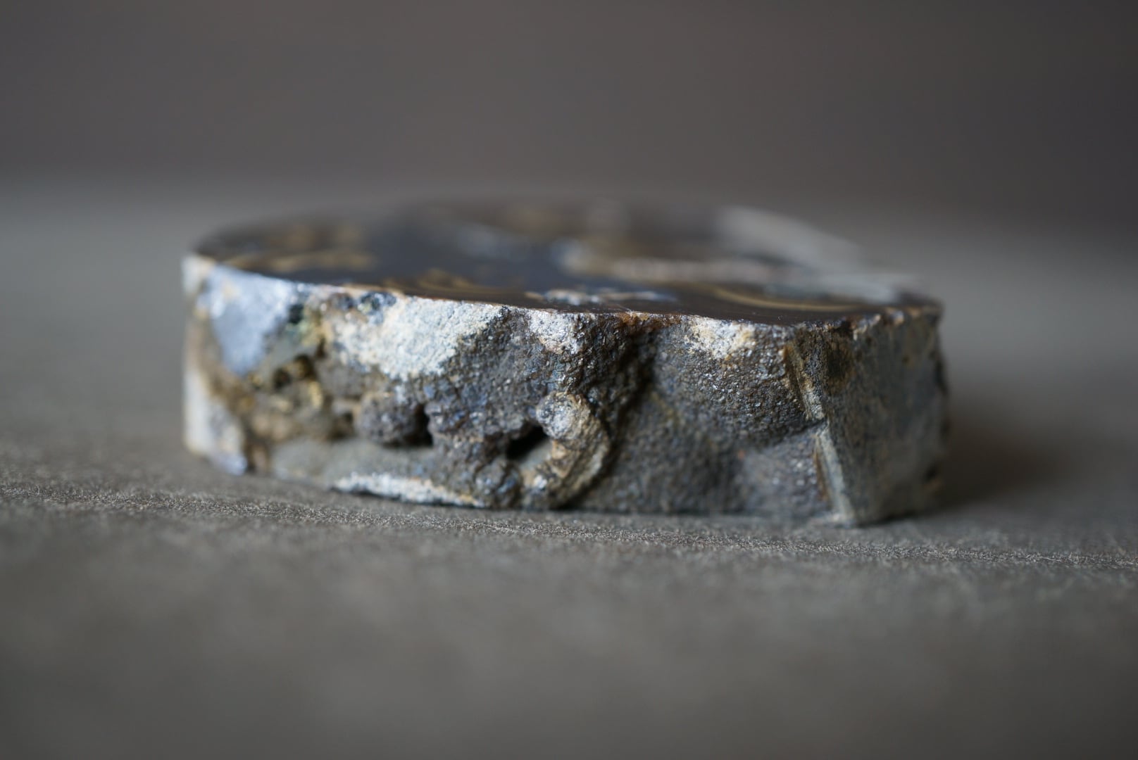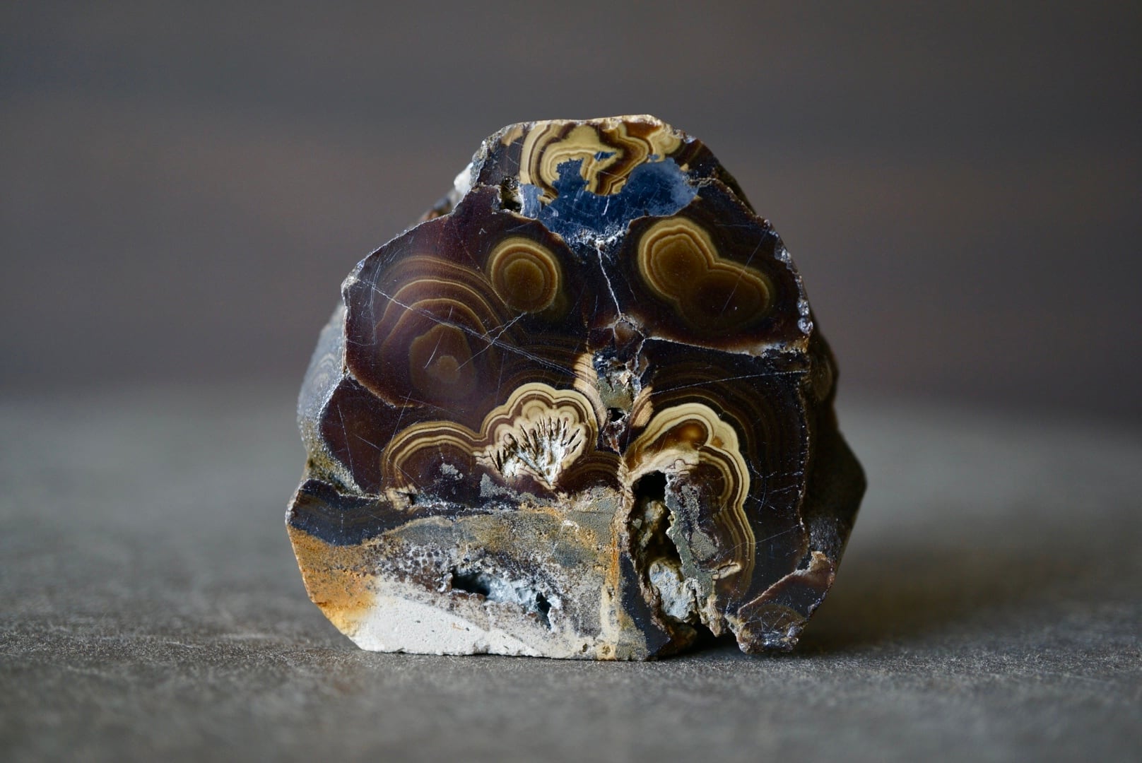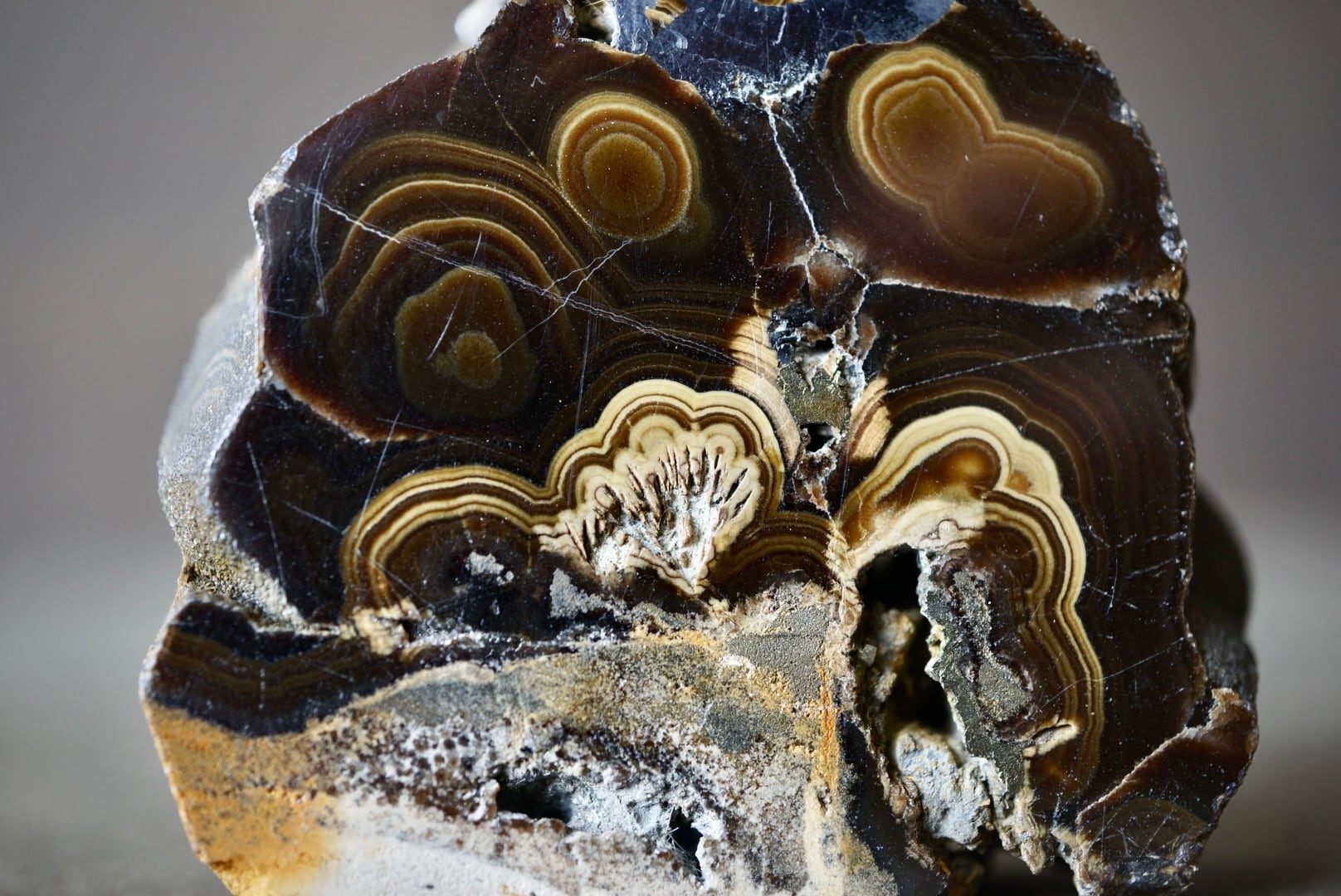 切断・研磨された断面には、ベージュから黄褐色、金属光沢を帯びた銀色、黒色までが複雑に重なり合い、この石特有の美しい縞模様が現れています。