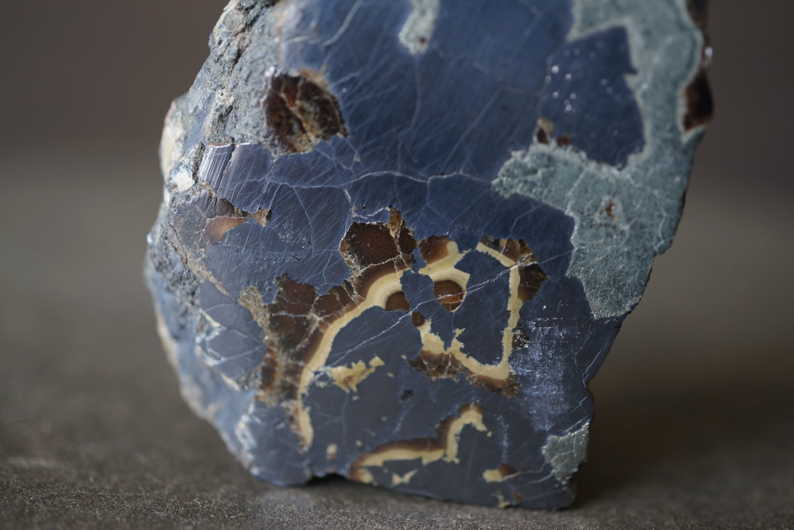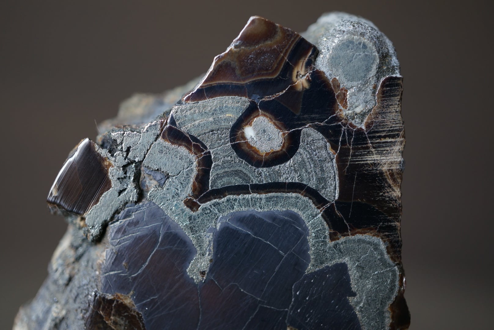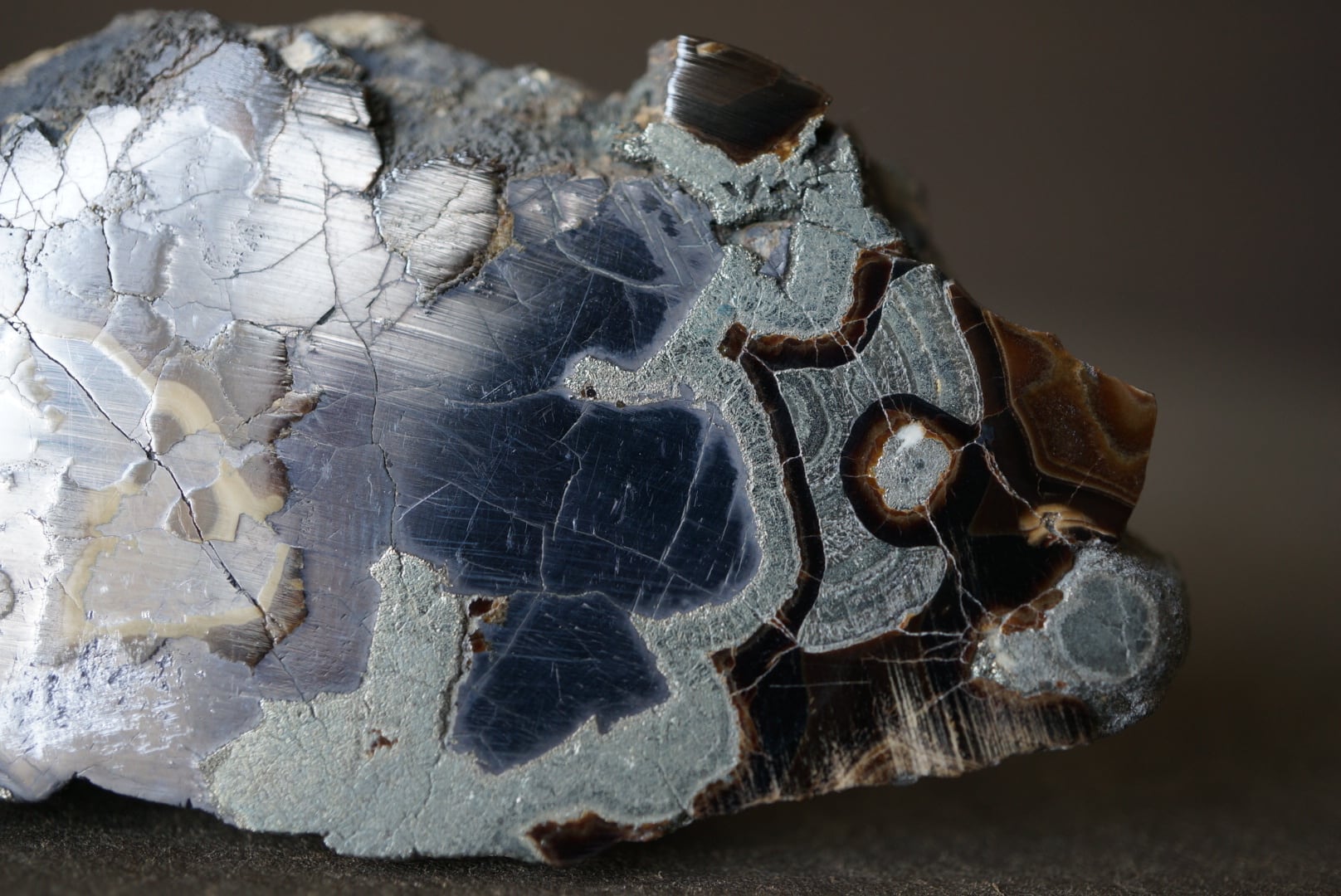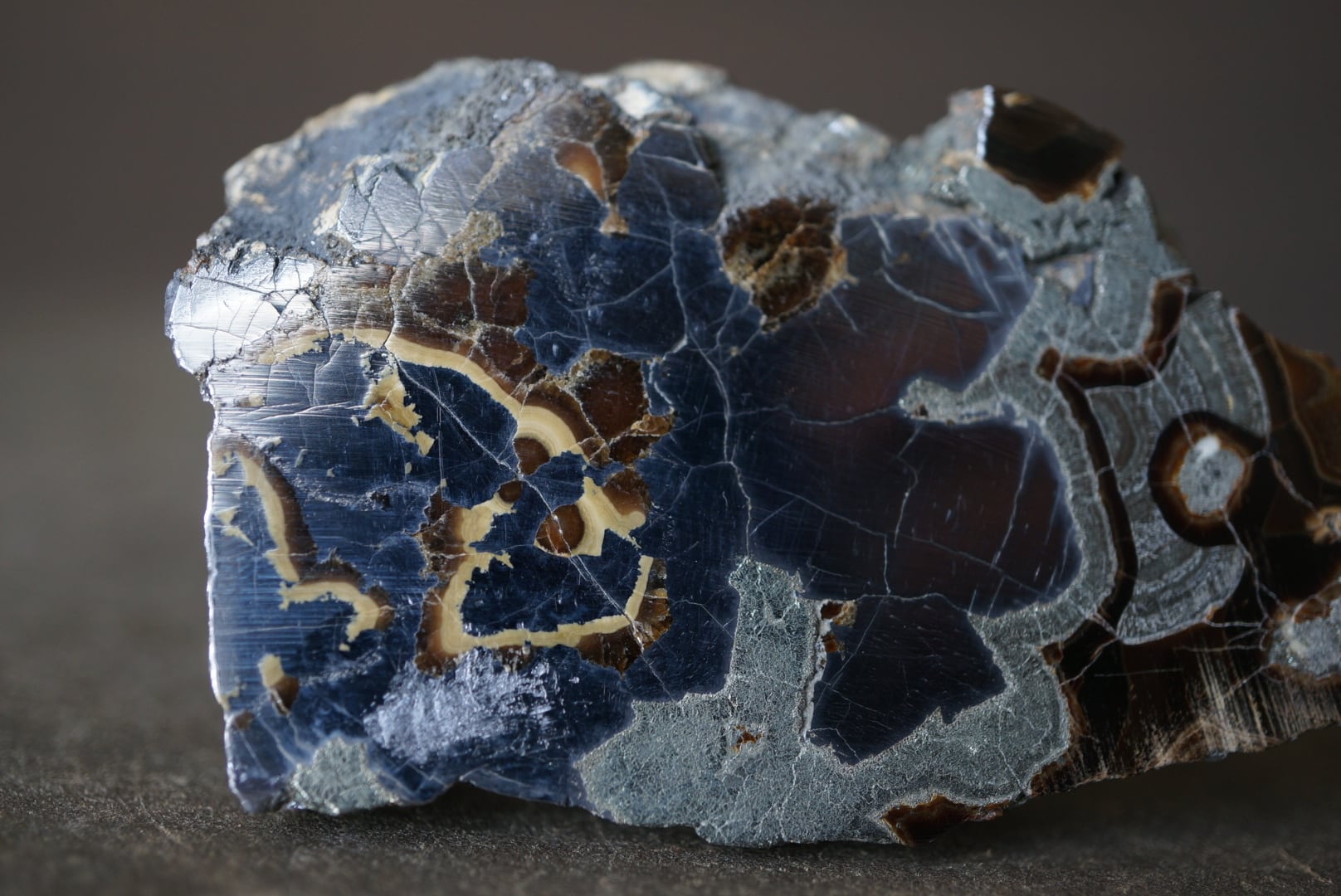 切断・研磨された断面には、ベージュから黄褐色、金属光沢を帯びた銀色、黒色までが複雑に重なり合い、この石特有の美しい縞模様が現れています。