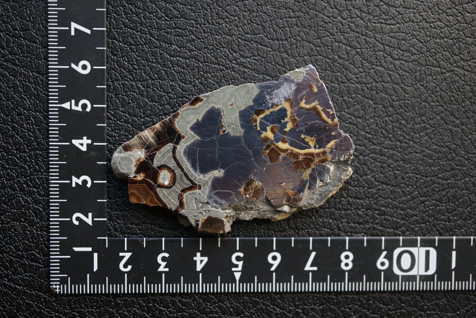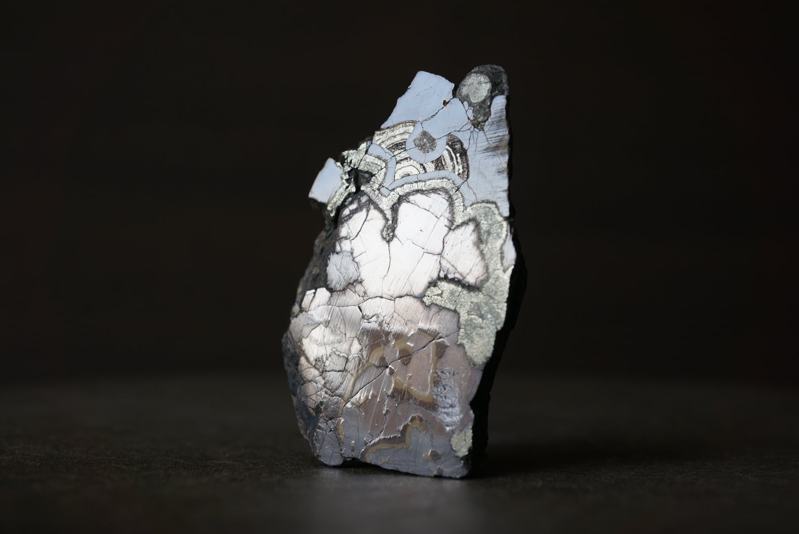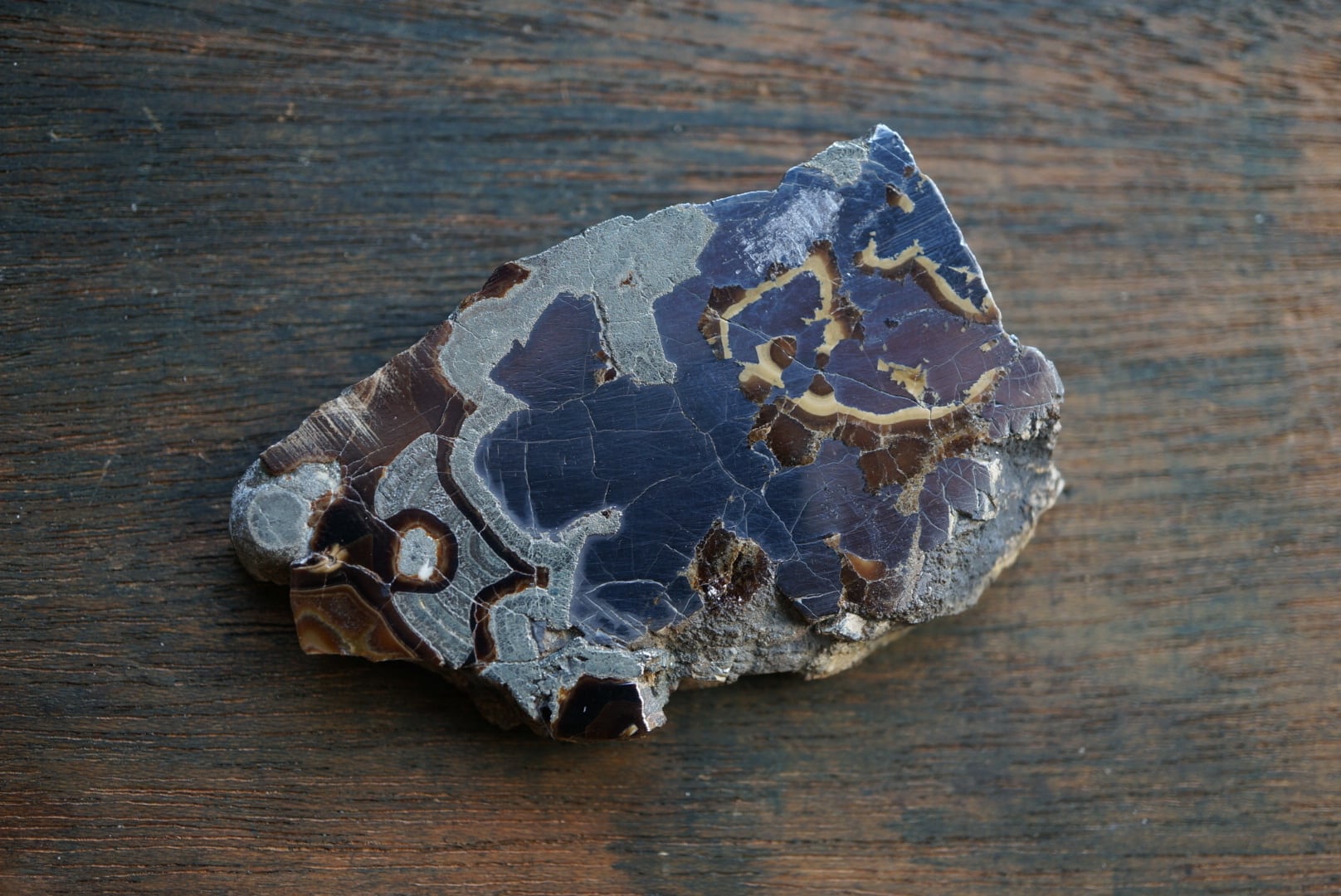 切断・研磨された断面には、ベージュから黄褐色、金属光沢を帯びた銀色、黒色までが複雑に重なり合い、この石特有の美しい縞模様が現れています。
