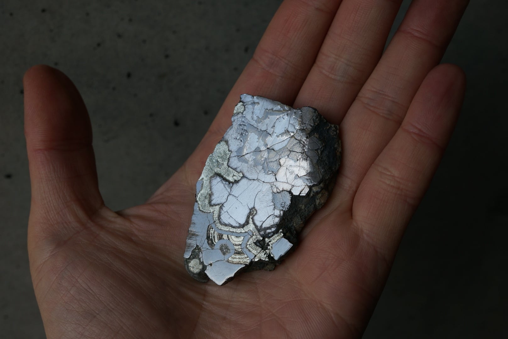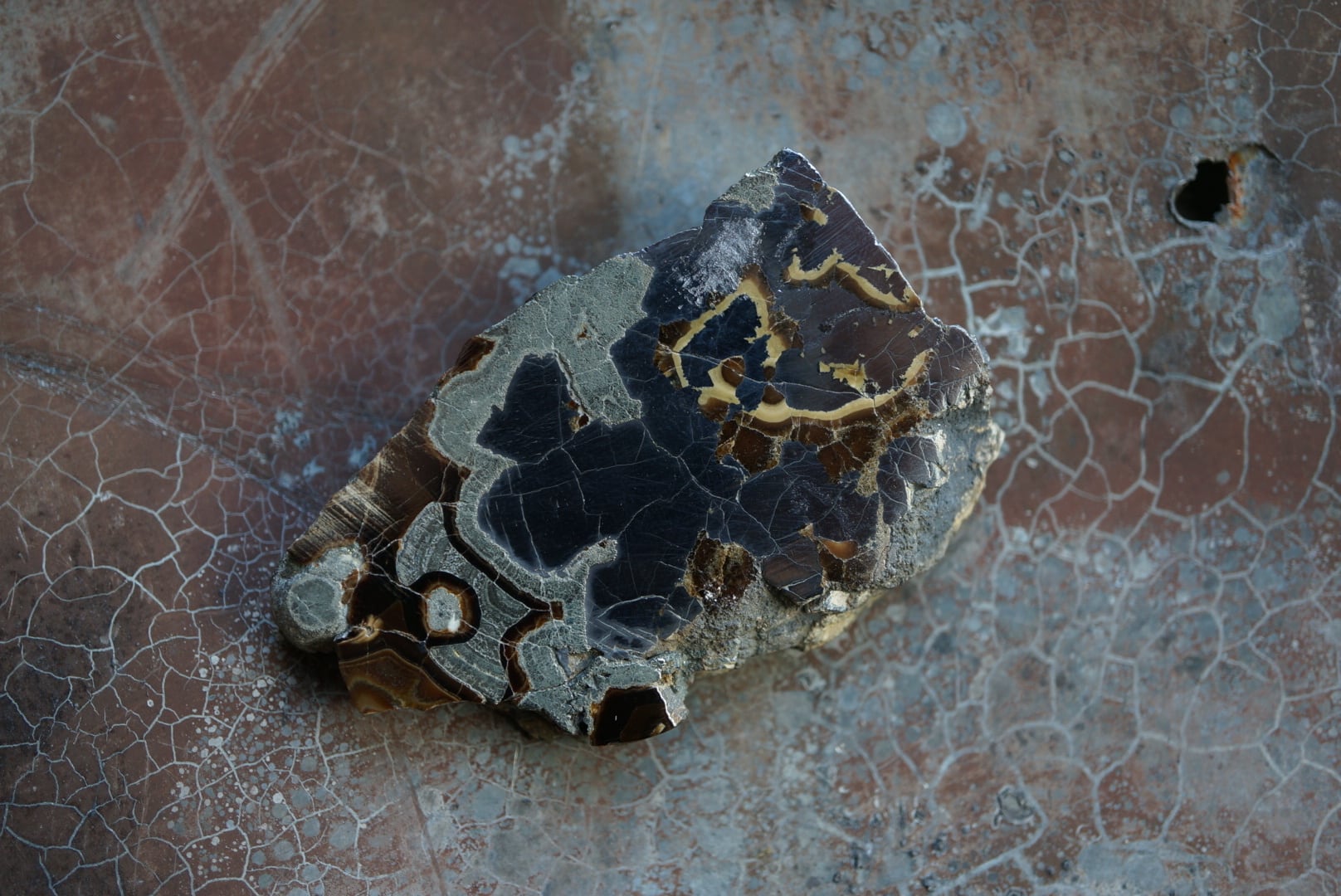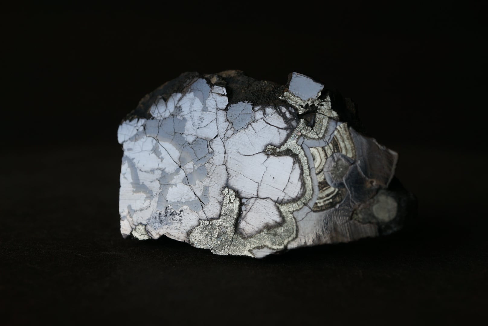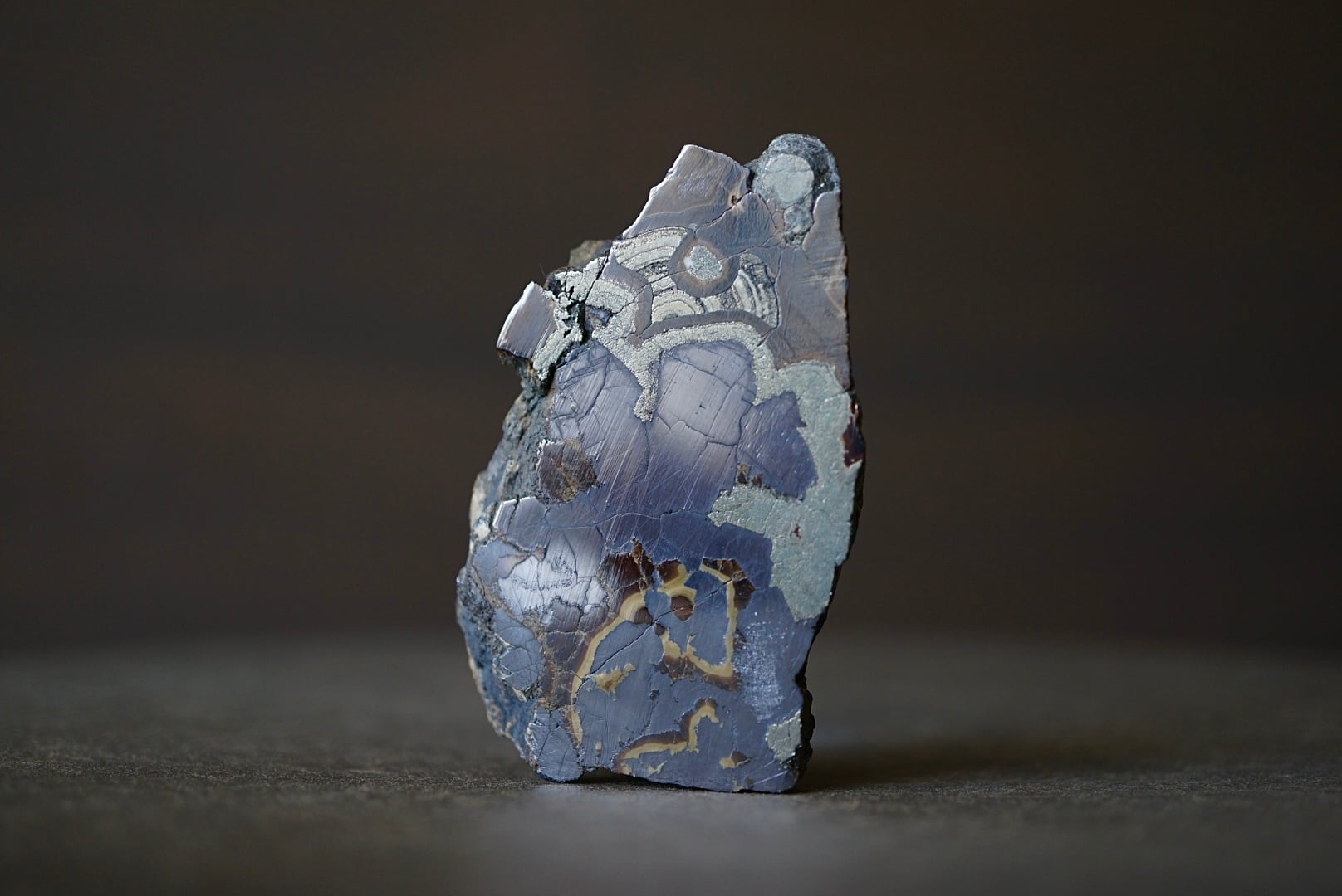 切断・研磨された断面には、ベージュから黄褐色、金属光沢を帯びた銀色、黒色までが複雑に重なり合い、この石特有の美しい縞模様が現れています。